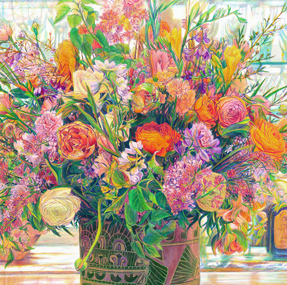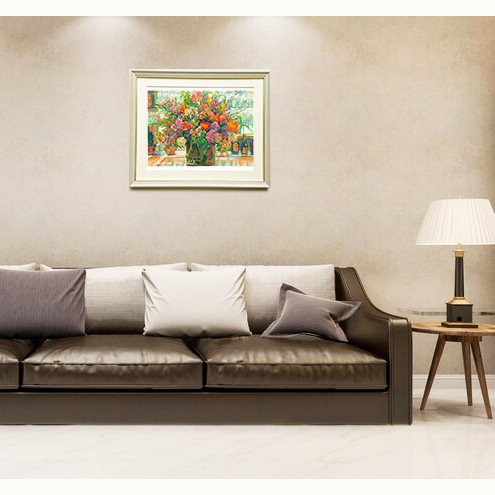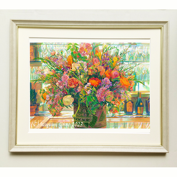 アクリル絵の具でキャンソンケント紙に絵を描いています。(写真を加工して絵にしたものでは無いです。)以前にヨーロッパへ絵の取材旅行へ行った時にフランスのホテルのバーに飾ってあった花がオレンジの照明に輝きとても綺麗だったので描いた絵です。大人な雰囲気の花の絵はいかがでしょうか。