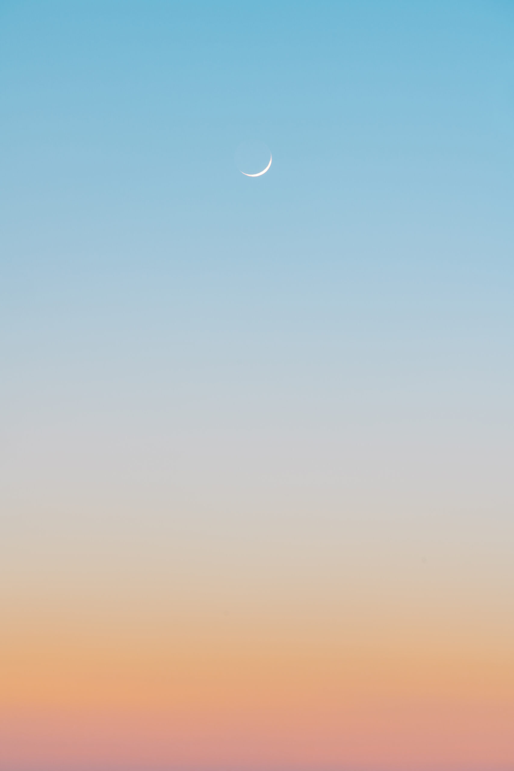 This is a photo of a crescent moon in the sunset and blue sky after sunset.