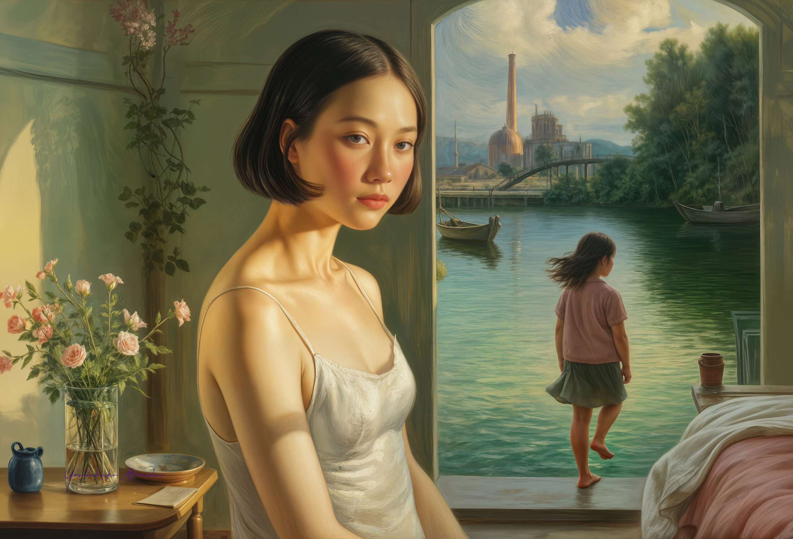 このシリーズ《幻想回顧》は、過去の記憶と夢想の境界をたゆたう女性たちを描いた作品群です。現実の室内と幻想的な風景を一枚に融合さ せ、写実的な筆致で静けさと内面の揺らぎを表現しました。光と水、視線と背中、内と外の対比を通じて、見る者それぞれの記憶を呼び起こす よう意図しています。絵の中の女性は時に観察者であり、時に過去そのものであり、観る者の感情に静かに語りかけます。