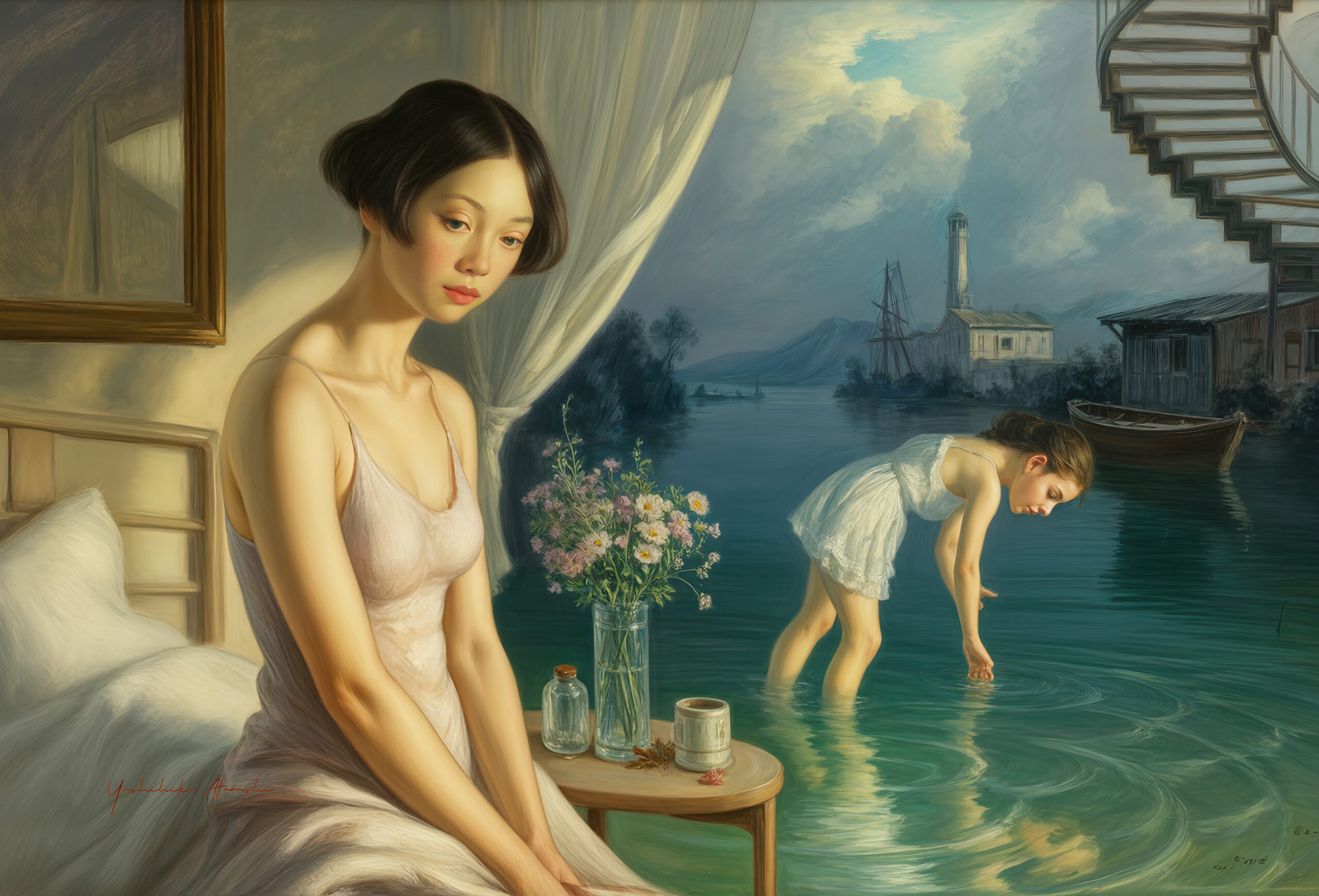 このシリーズ《幻想回顧》は、過去の記憶と夢想の境界をたゆたう女性たちを描いた作品群です。現実の室内と幻想的な風景を一枚に融合さ せ、写実的な筆致で静けさと内面の揺らぎを表現しました。光と水、視線と背中、内と外の対比を通じて、見る者それぞれの記憶を呼び起こす よう意図しています。絵の中の女性は時に観察者であり、時に過去そのものであり、観る者の感情に静かに語りかけます。