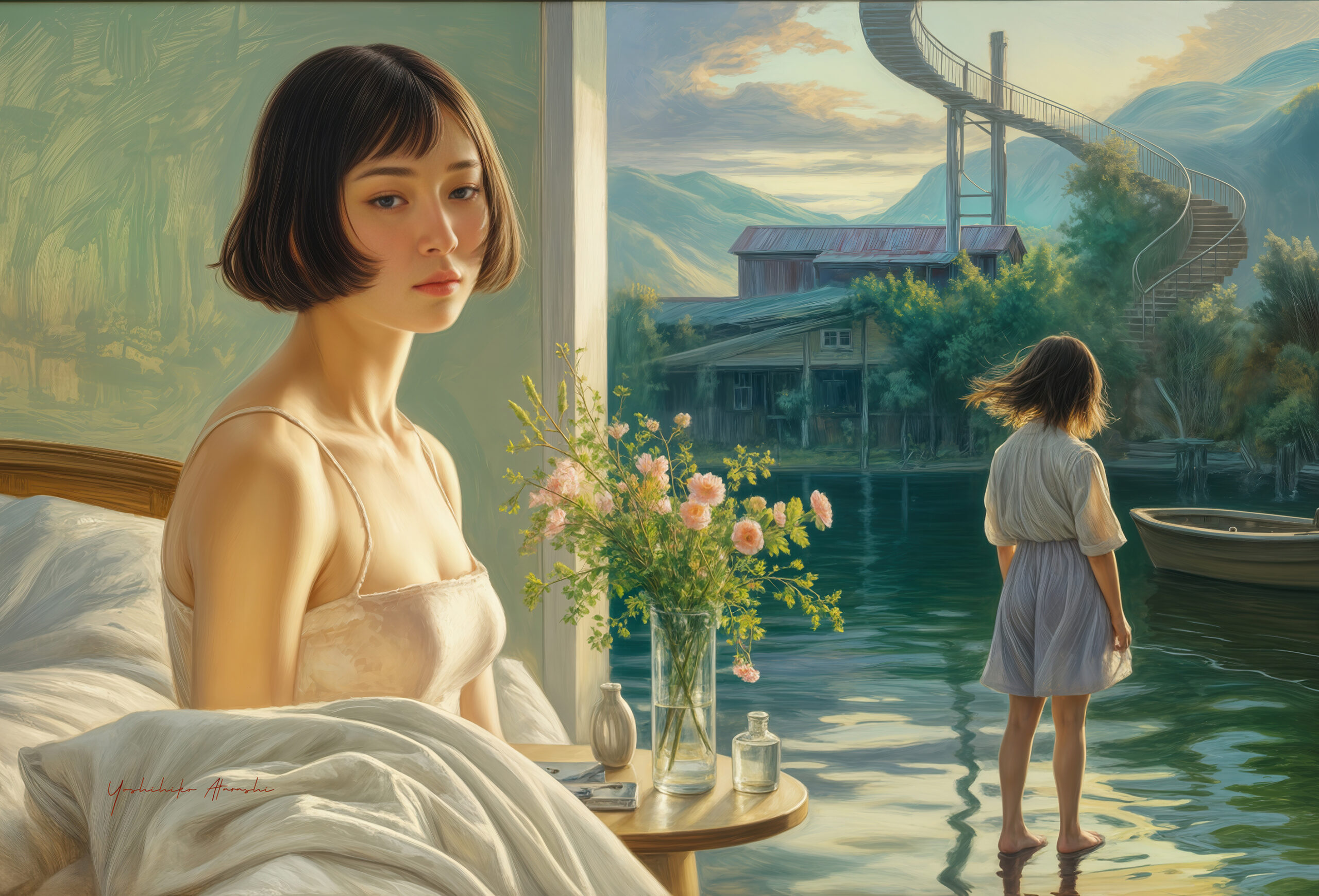 このシリーズ《幻想回顧》は、過去の記憶と夢想の境界をたゆたう女性たちを描いた作品群です。現実の室内と幻想的な風景を一枚に融合さ せ、写実的な筆致で静けさと内面の揺らぎを表現しました。光と水、視線と背中、内と外の対比を通じて、見る者それぞれの記憶を呼び起こす よう意図しています。絵の中の女性は時に観察者であり、時に過去そのものであり、観る者の感情に静かに語りかけます。
