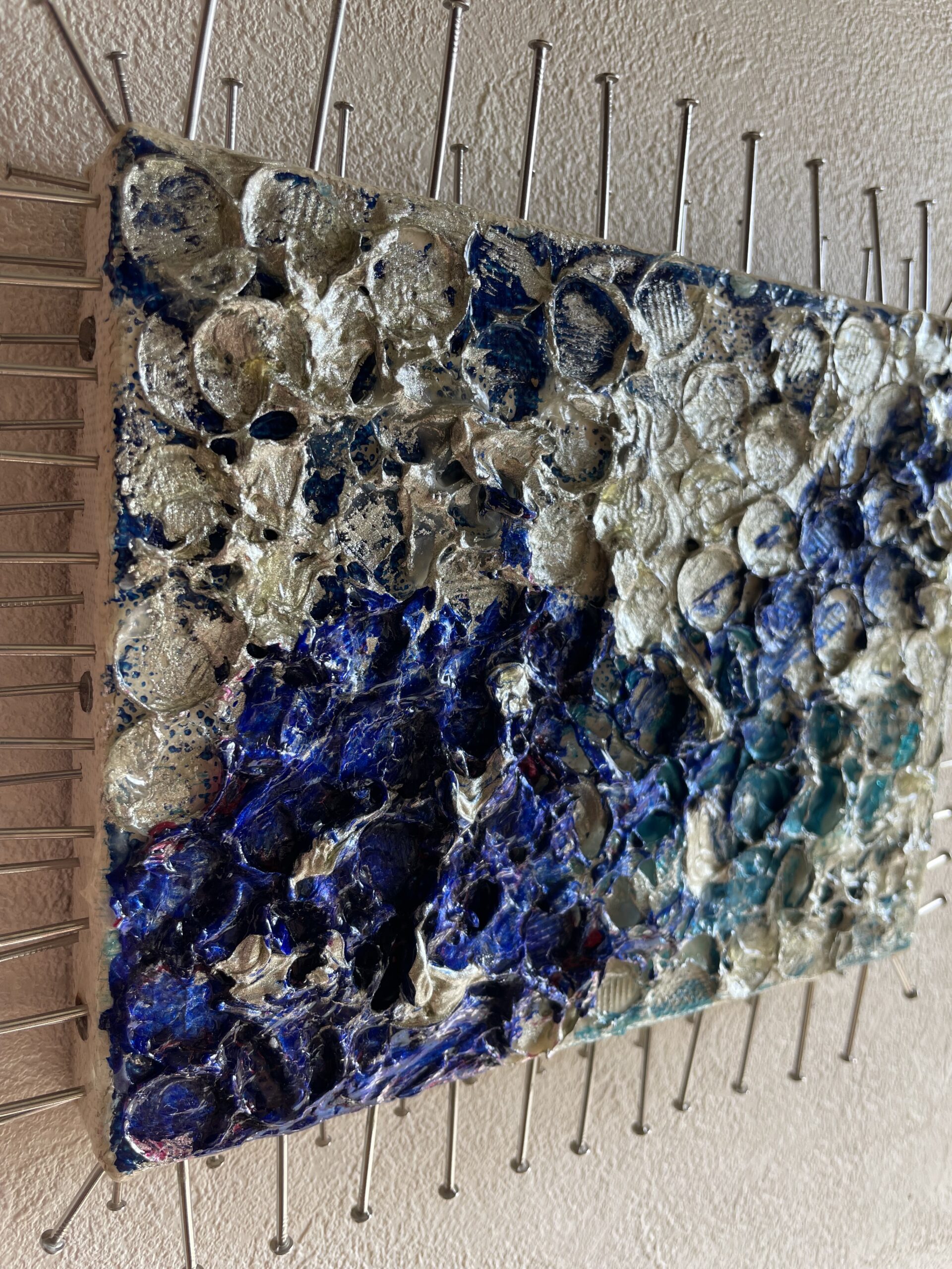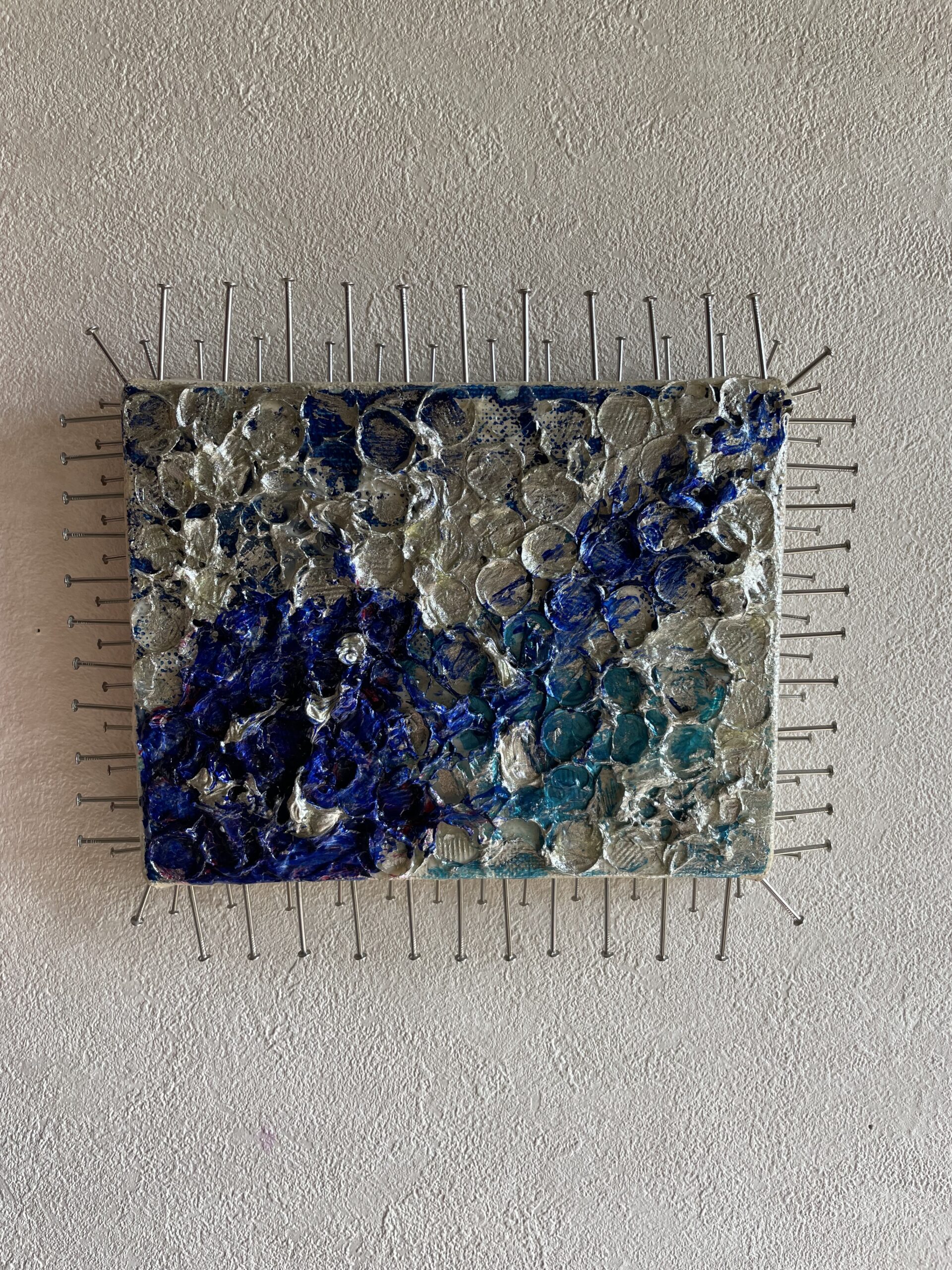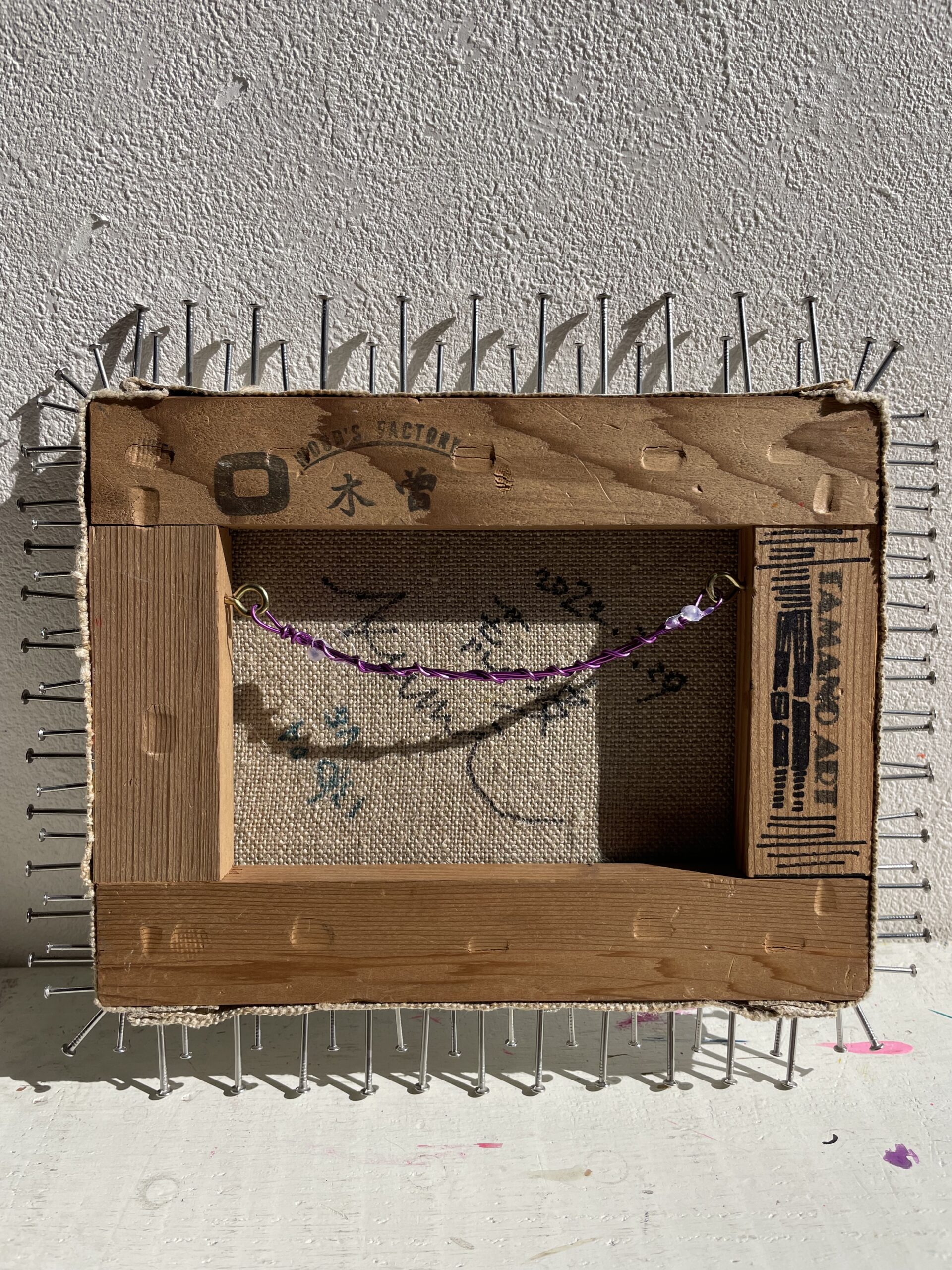 キャンバスのF0号サイズの縁から2.5cmほど釘(ステンレス)が出ています、0号サイズよりもサイズが大きくなっていますので、ご注意ください。