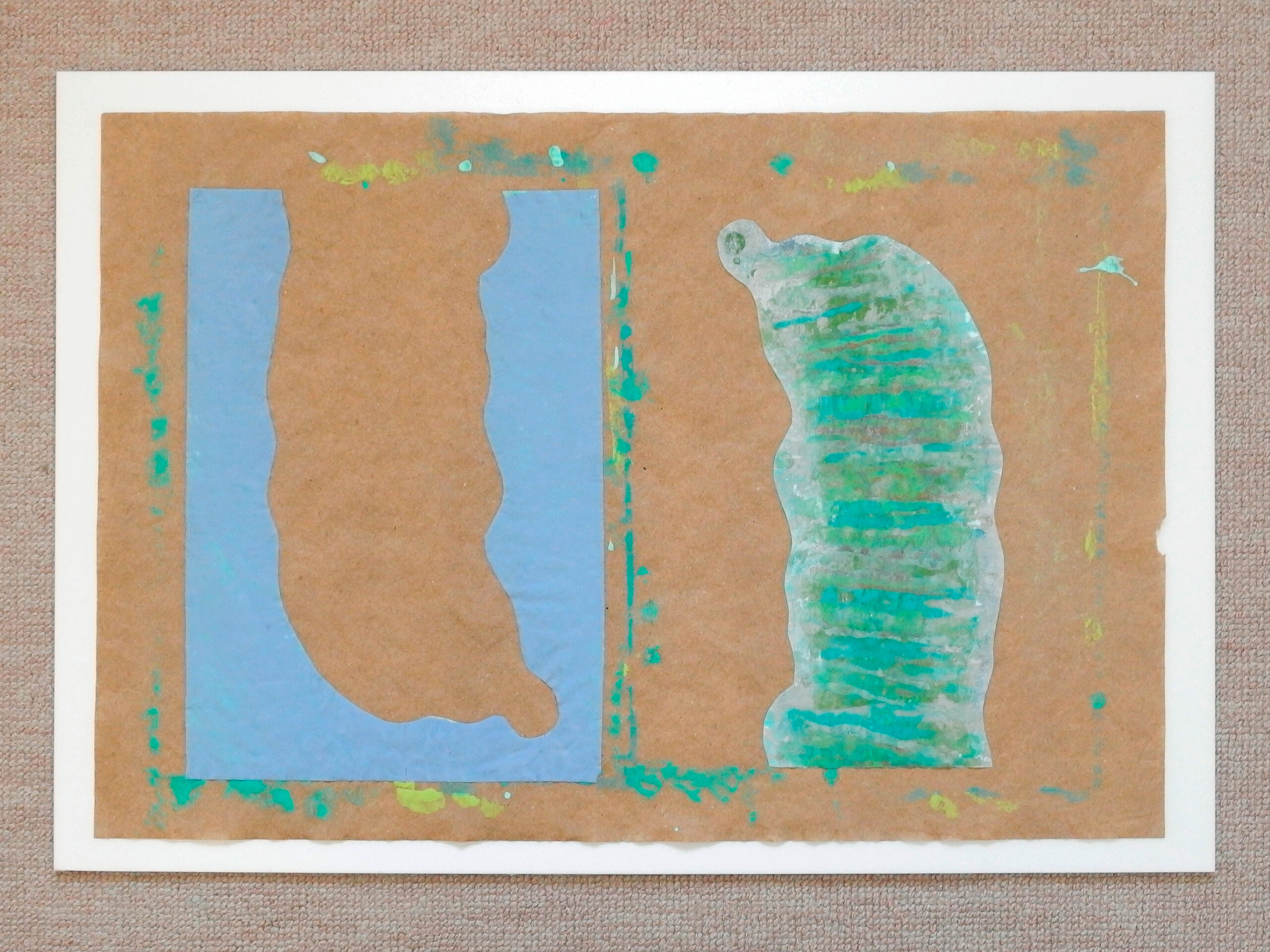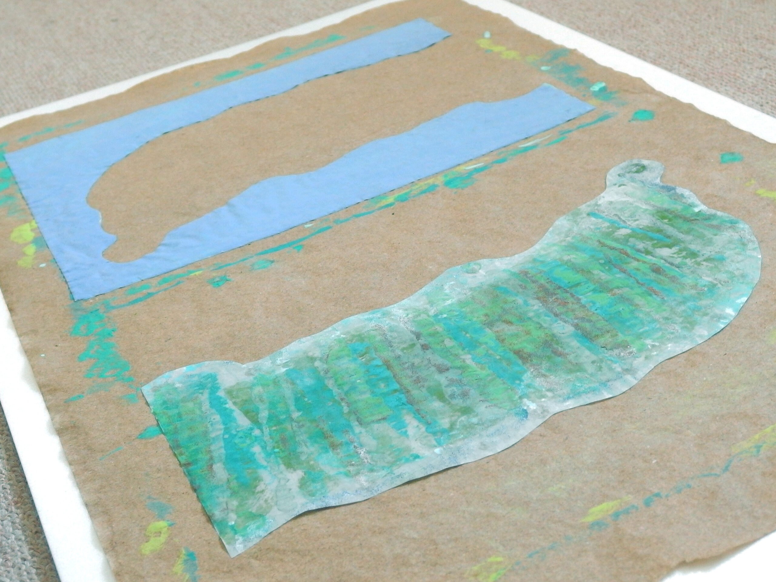 天然素材の和紙に膠を使うのが「日本画」の常識ですが、あえて人工素材を使っています。