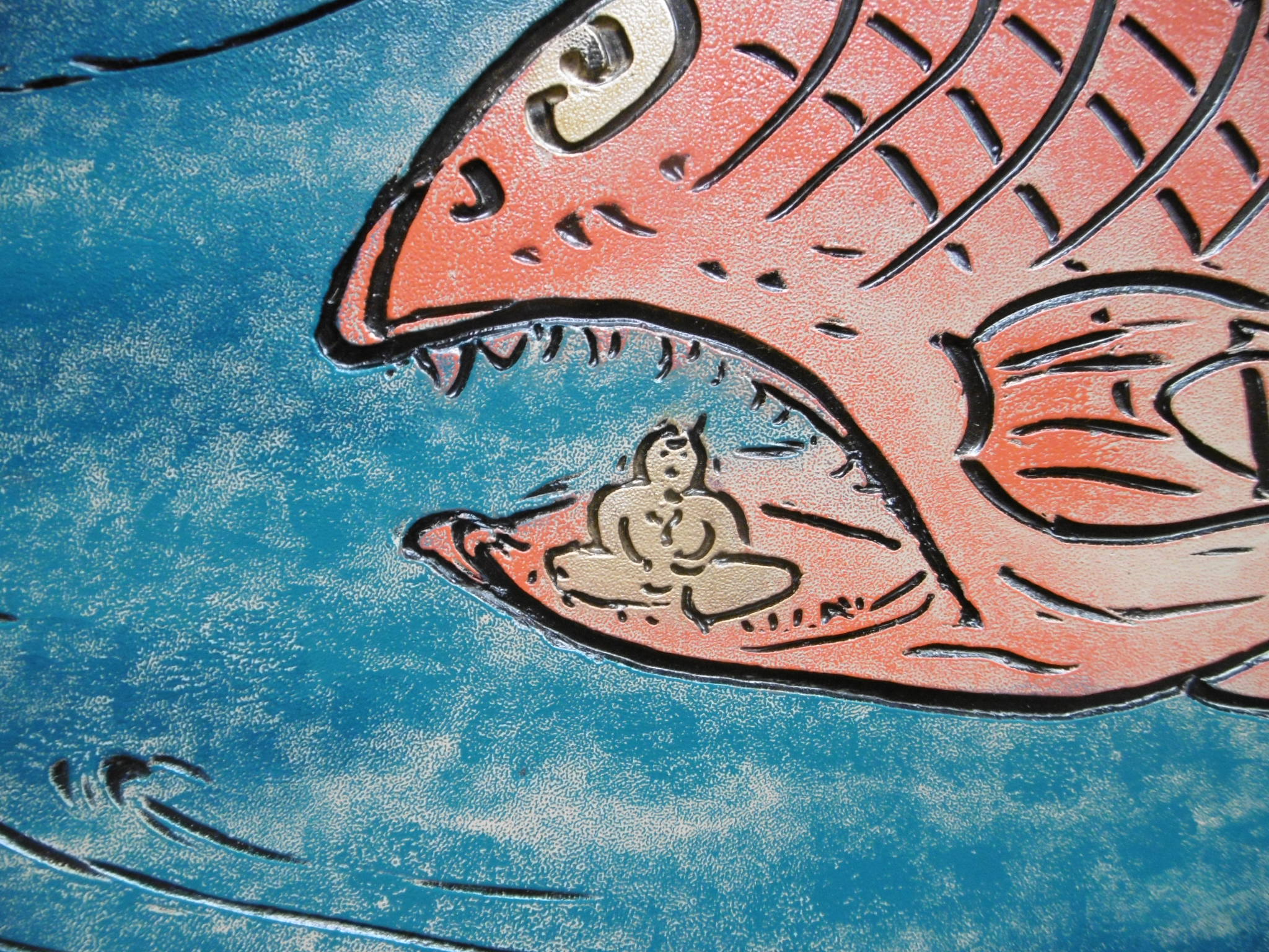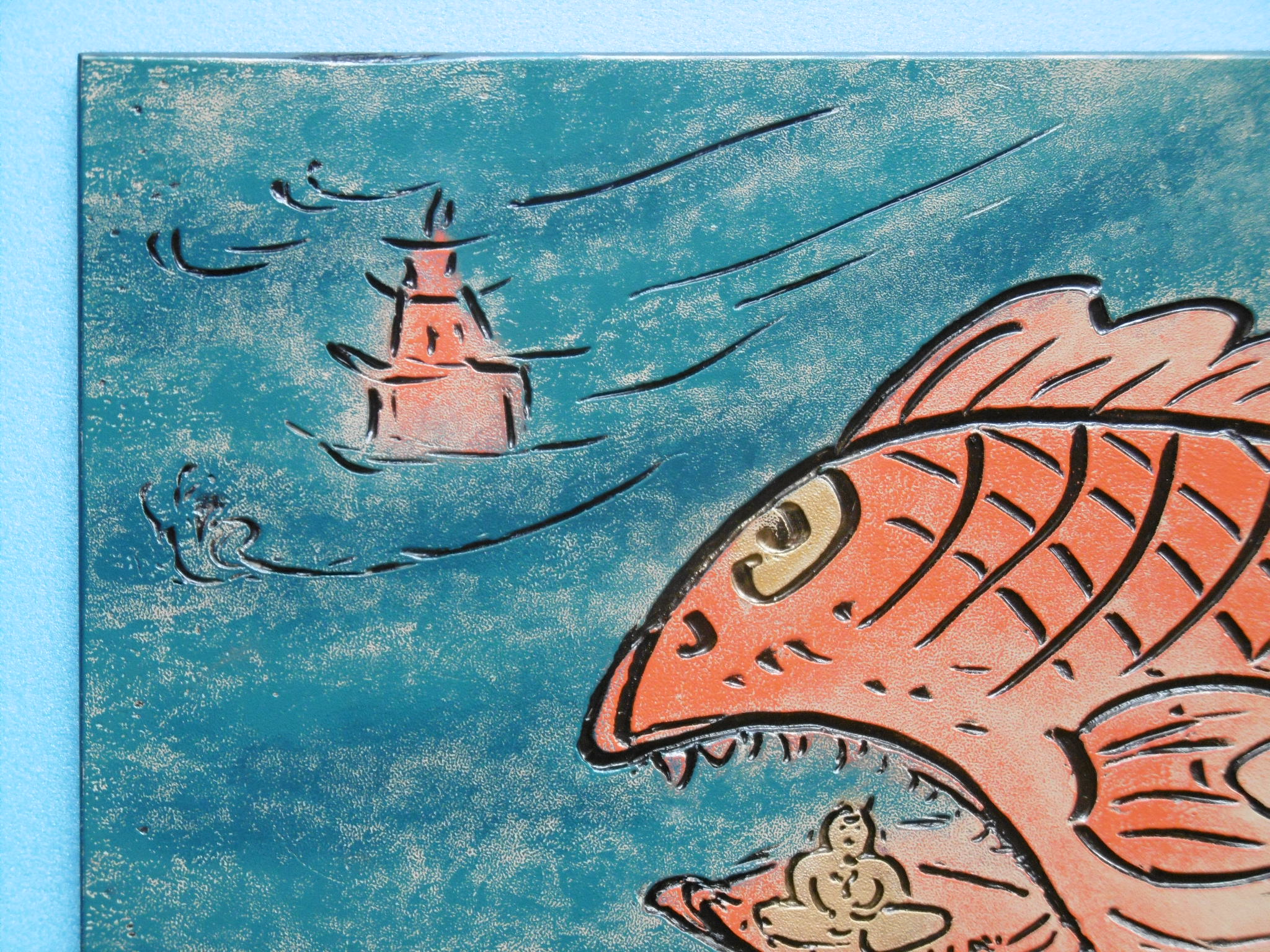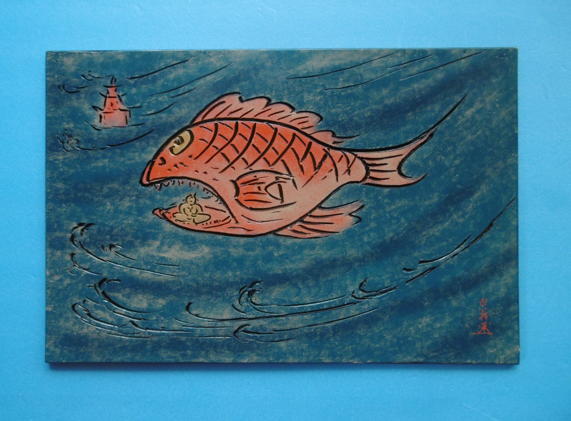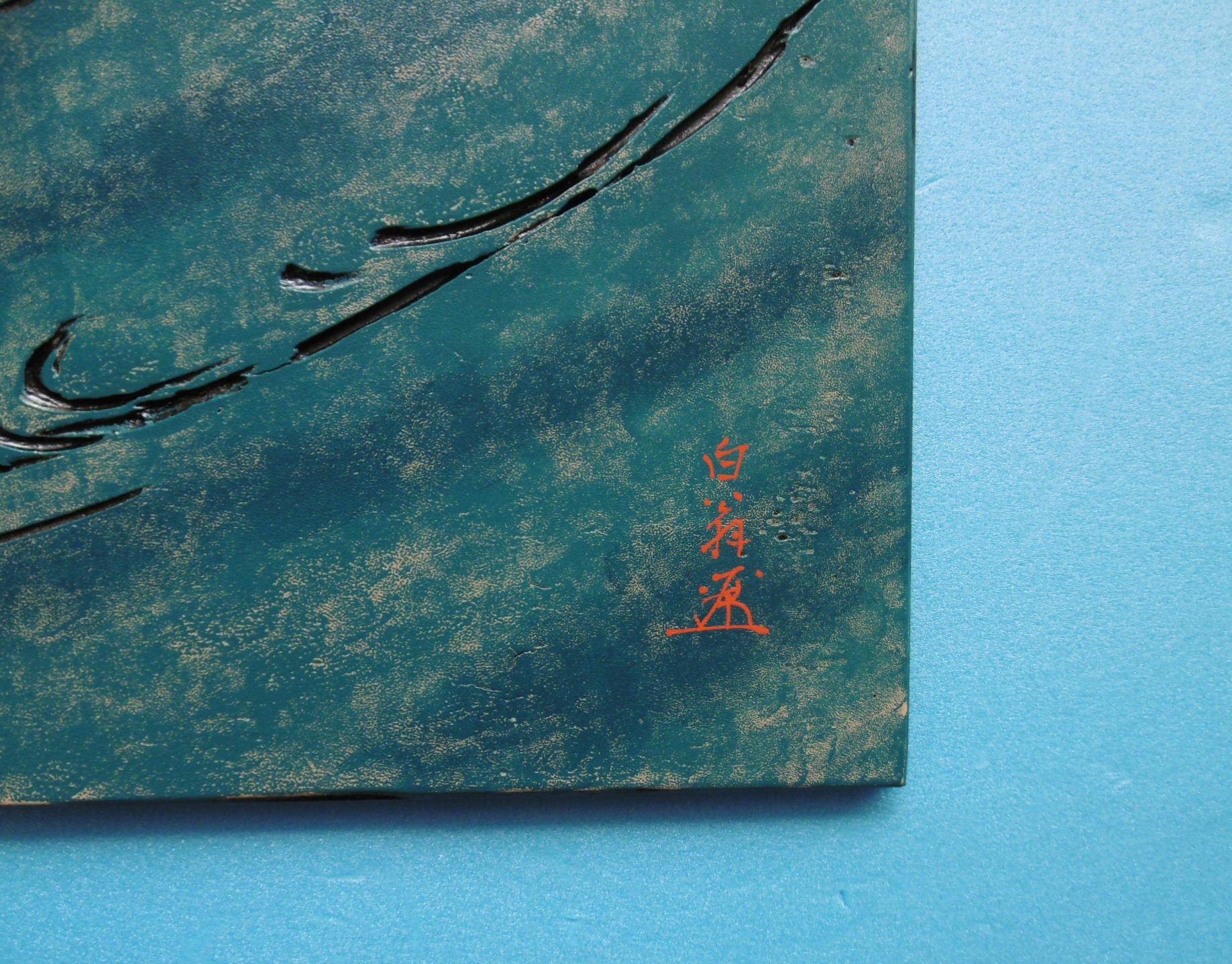 作者・白翁作品の中に楽しい空想・幻想・夢想の世界を漆で表現した作品が多くあります 作者の言葉で「空想・夢・現実等織り交ぜて美化する。それが藝術の世界である」 と記されております 宮殿と霊魚は朱漆 霊魚眼と人物は純青金(金と銀の合金) 海面は青と緑の中間色(シアン系漆) 絵画深く切り込まれた深部は光沢ある黒漆 全て純日本産漆を使用しております 額は付属しておりません