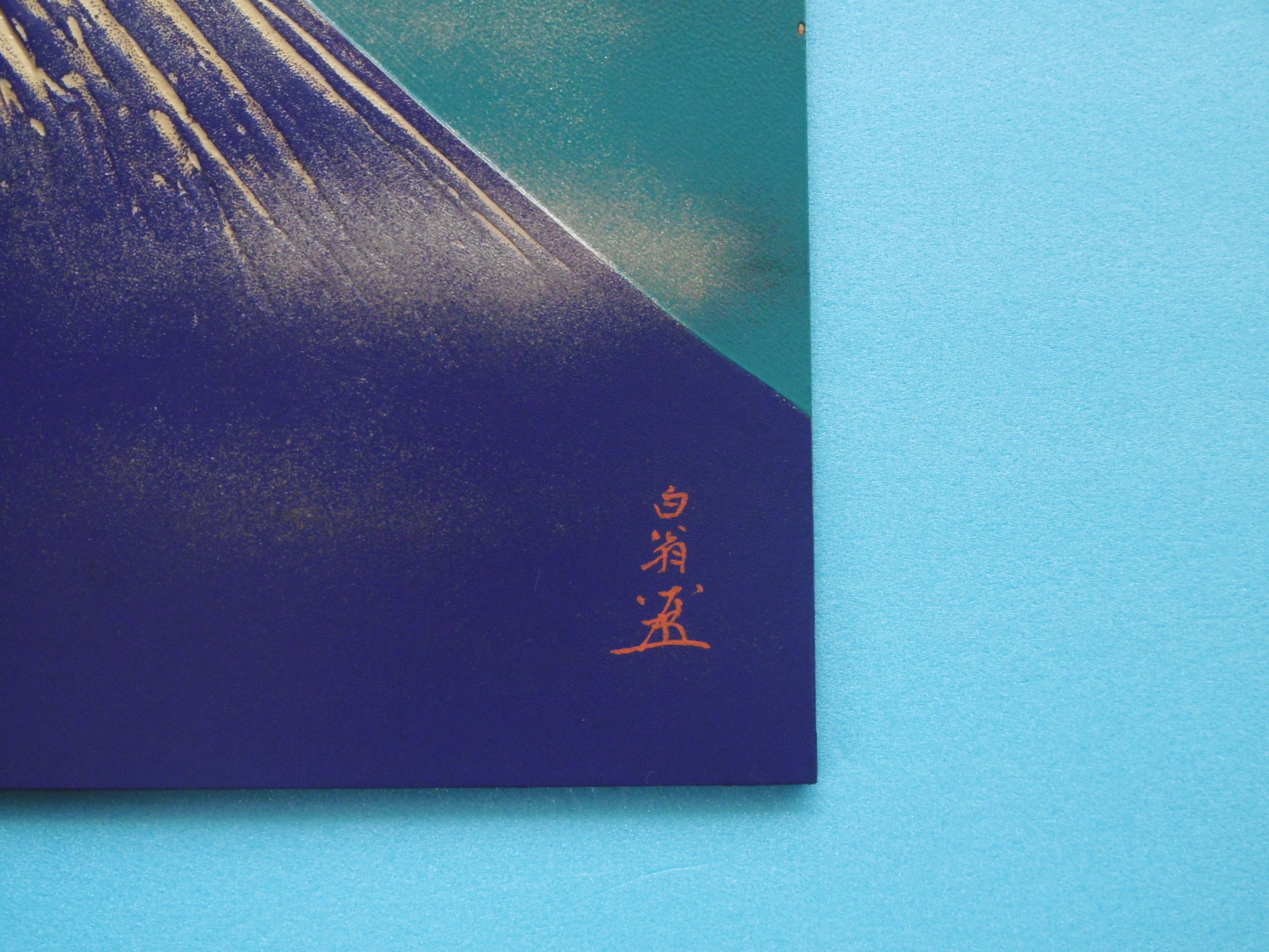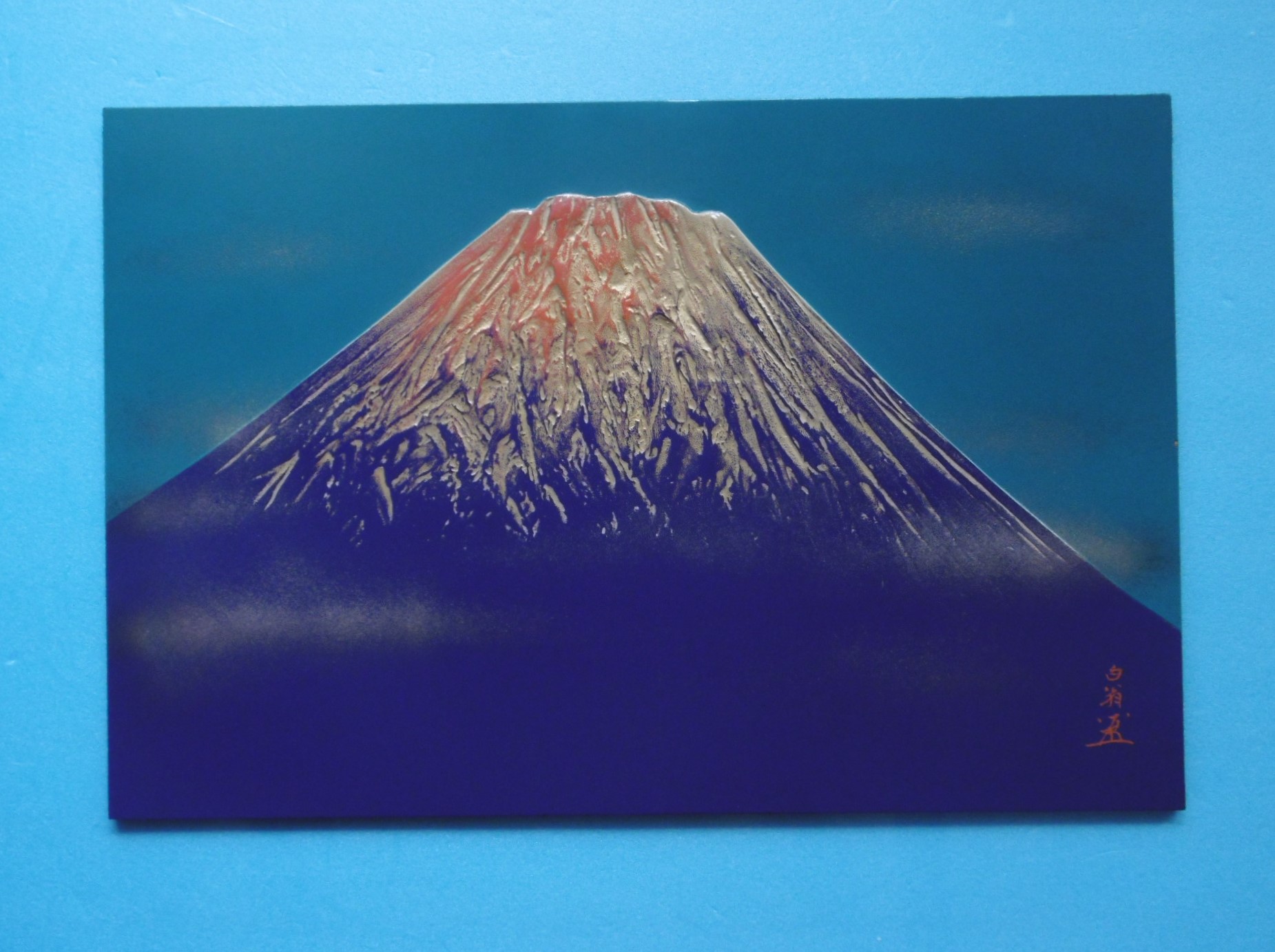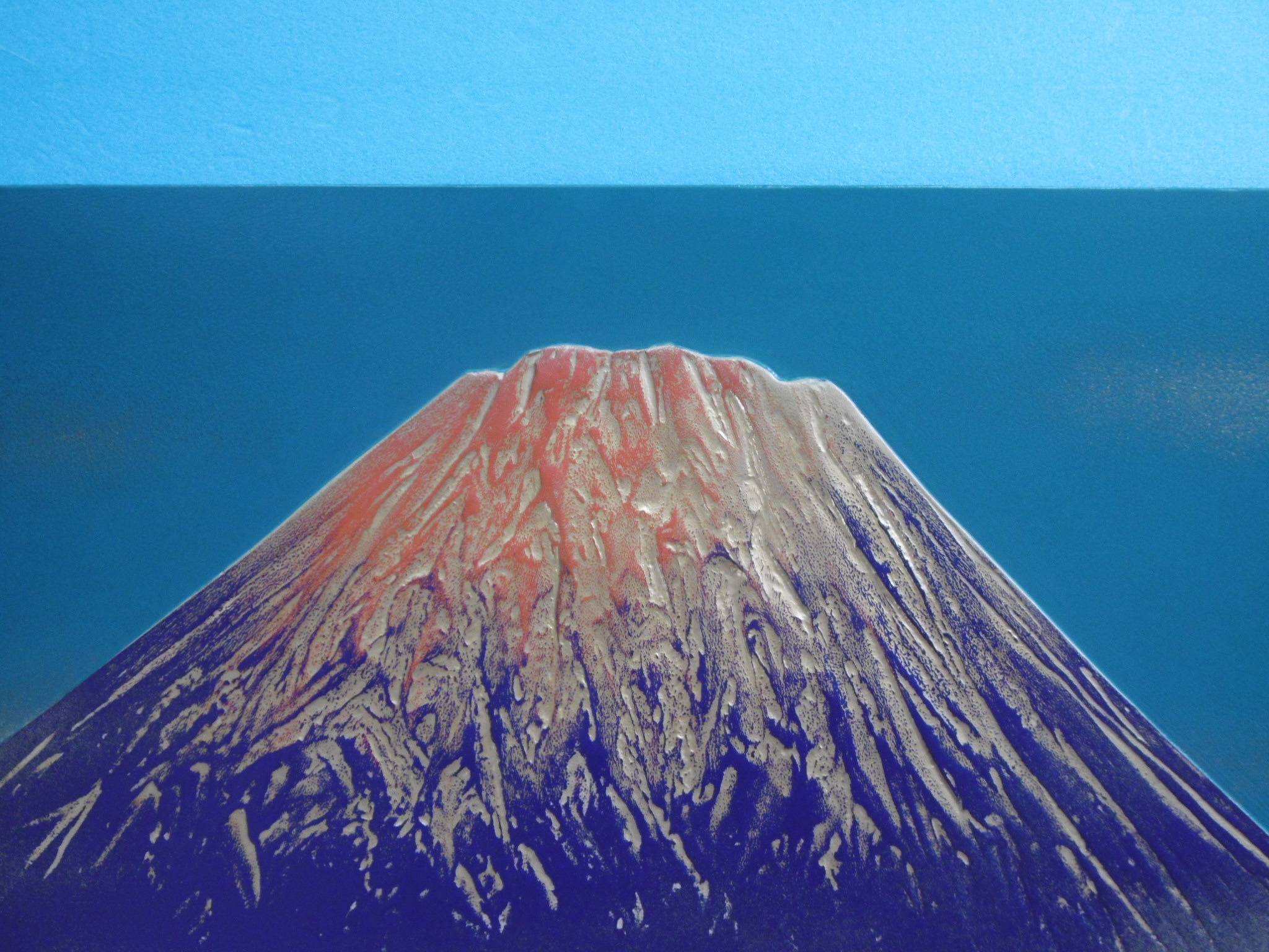 作者の言葉:富士は日本人の心の拠り所であり霊峰にして世界に誇りを持ちて紹介すべきで ある 山中湖畔の籠坂峠近くに恩師の山荘があり、毎年滞在し各種富士を制作 やや明るくなってきた夜明け頃に出現・燦燦と美しく光り輝く富士の山 山頂は朱漆と純金箔 空は藍染色の一つで浅葱色漆 山腹は紫漆に純銀粉 全て純日本産漆を使用しております 額は付属しておりません ※白翁(作者)の座右訓 菩薩と我は一つ 藝道と我は一つ 新しき創意制作に感謝 藝道に霊感を生ず 自然法則を悟り人生の何たるかを知る 迷いあるときは一喝