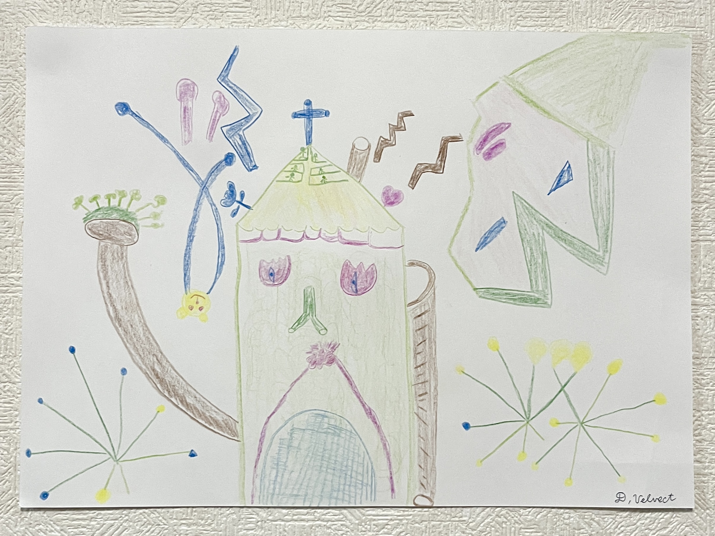 不思議な国の色彩を天使の代わりに色鉛筆で私が描いた。