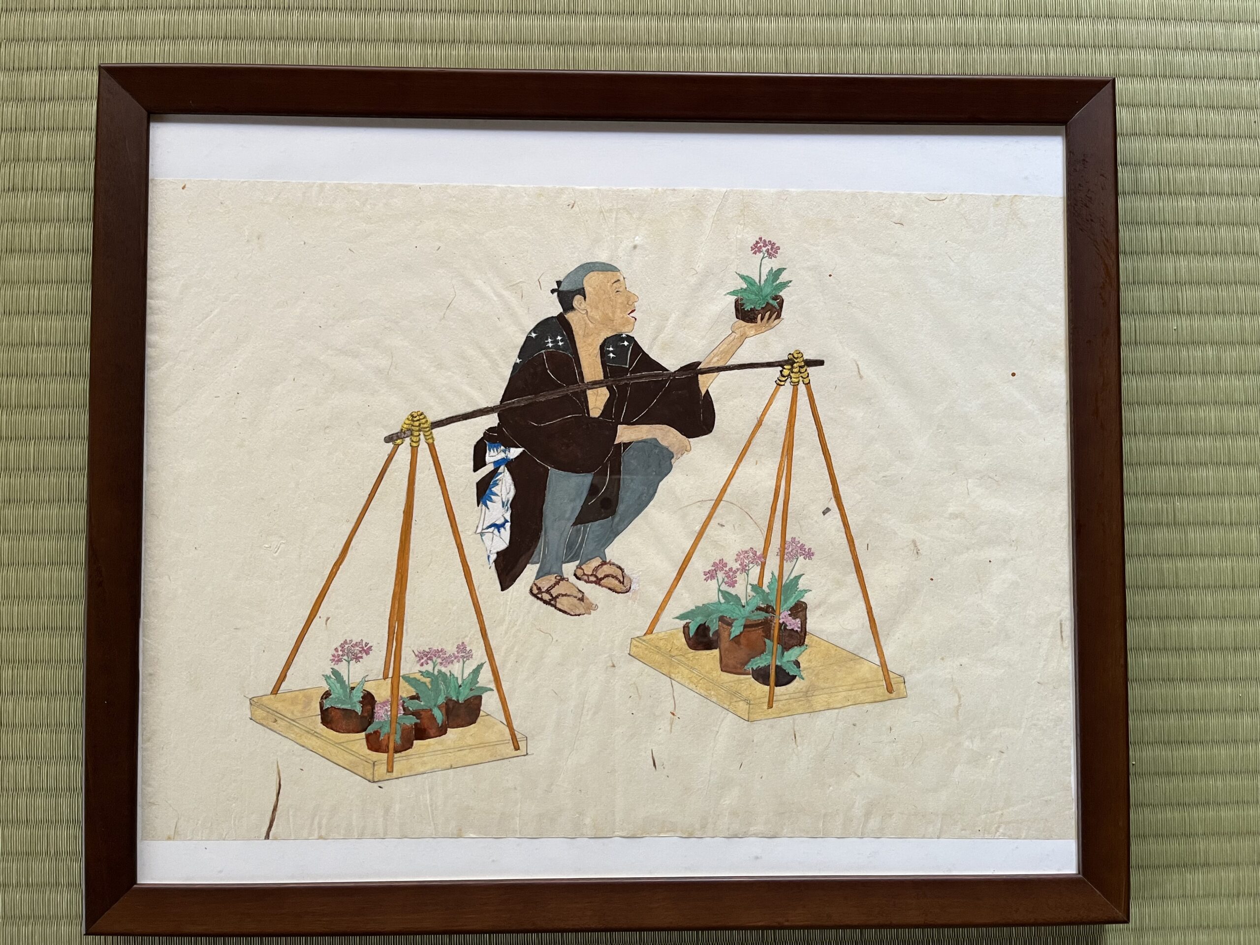 この作品は、江戸時代の庶民の暮らしを題材にした「桜草売り」を描いた、和紙に岩絵具で丁寧に仕上げた日本画です。岩絵具の繊細な光沢が、江戸の町角に漂う雅やかで穏やかな雰囲気を現代によみがえらせます。