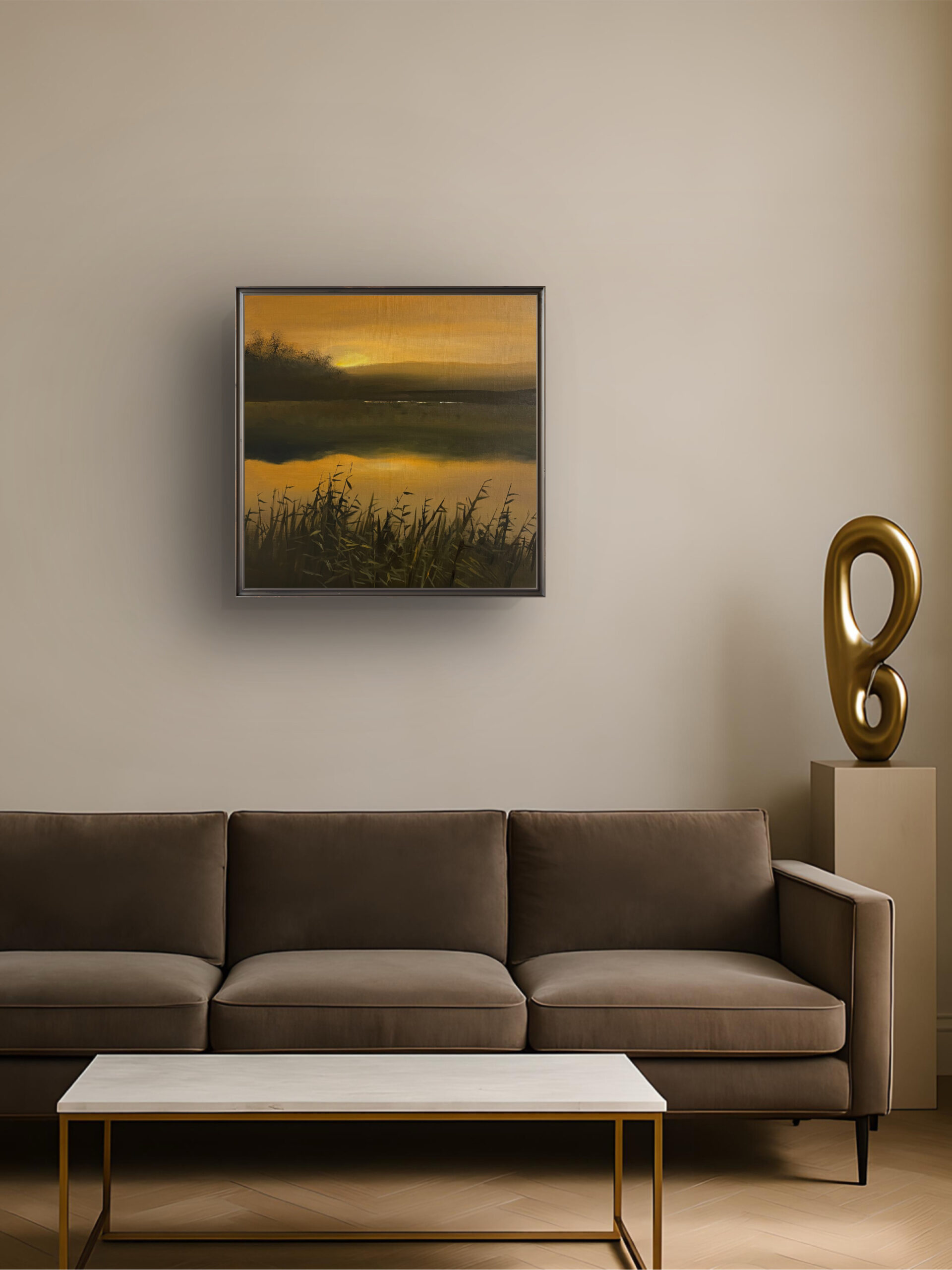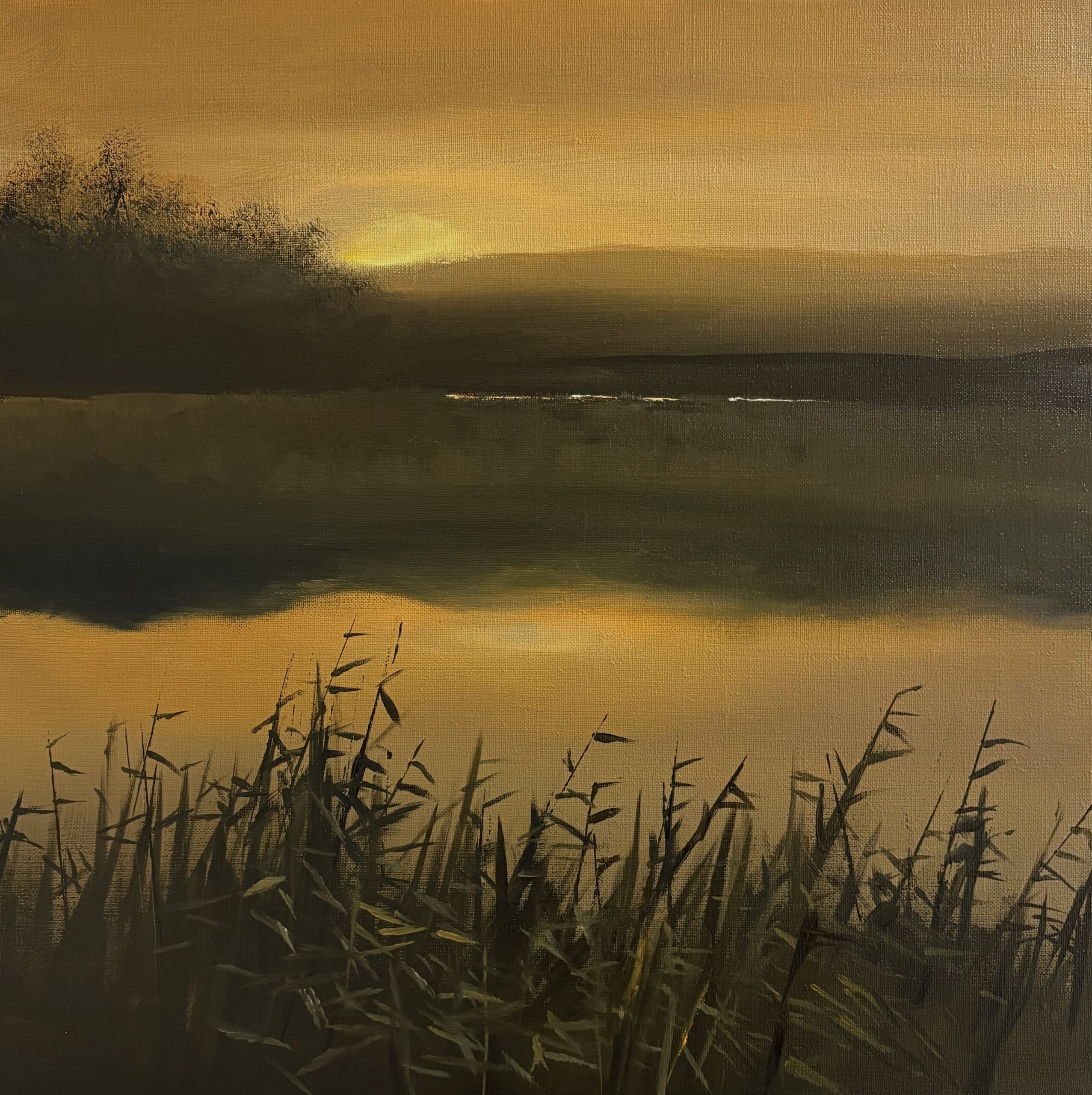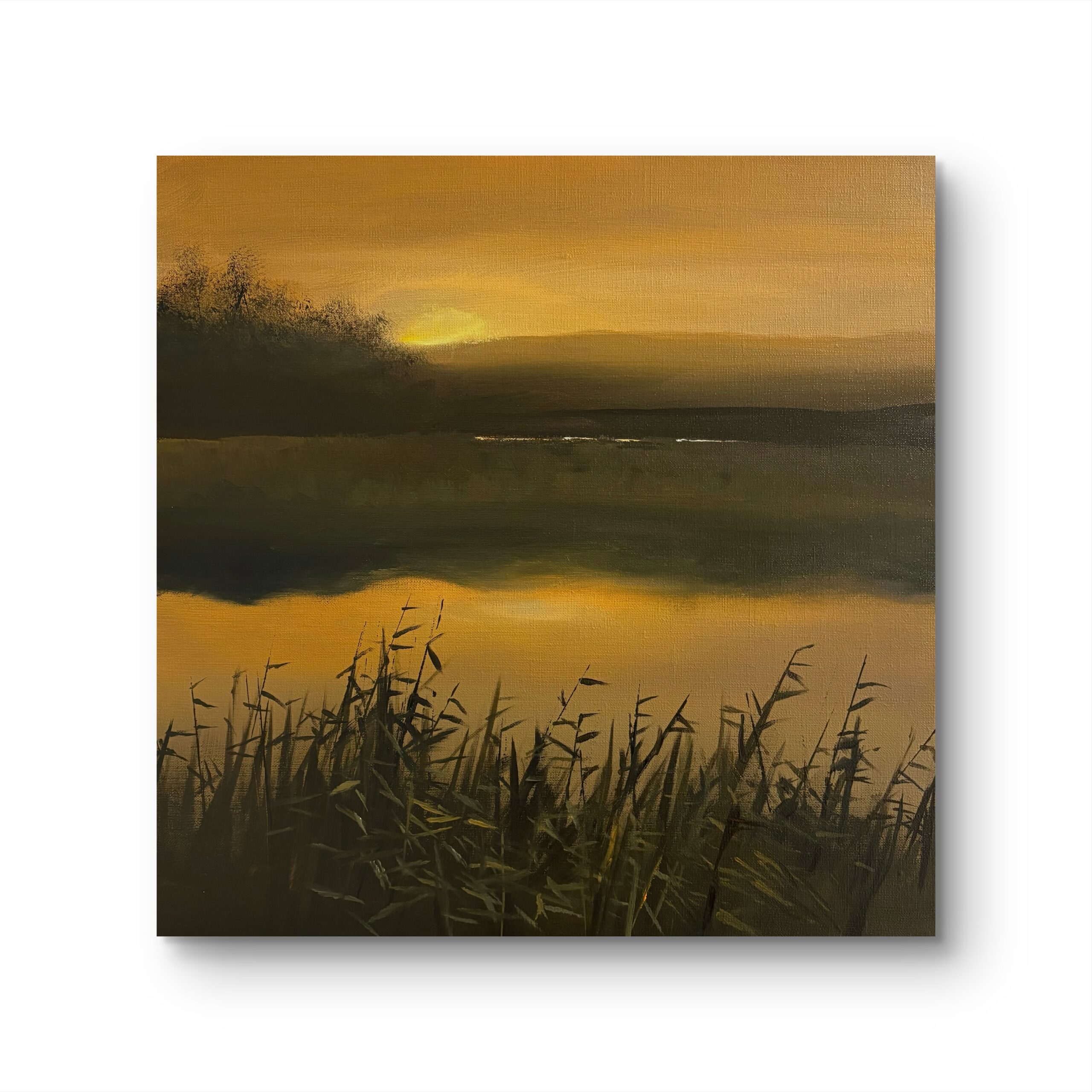 秋の黄金色に染まる水辺の情景を描いた作品。
