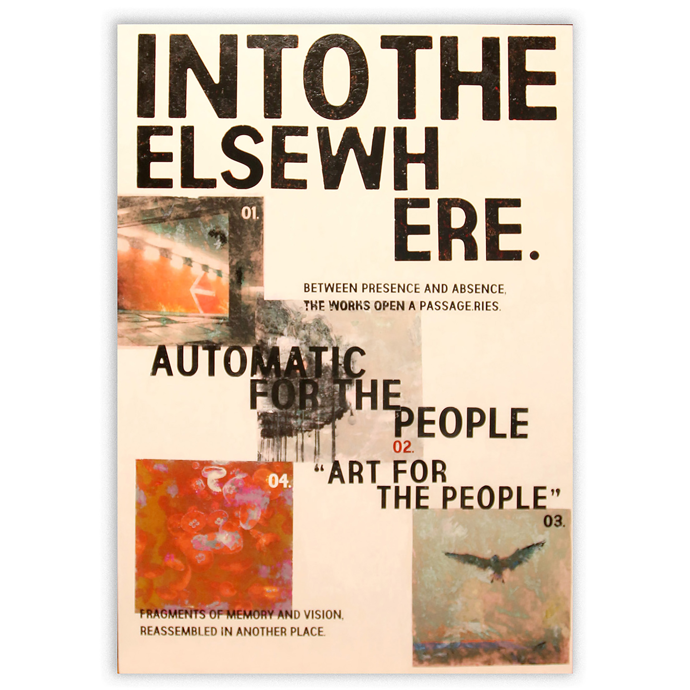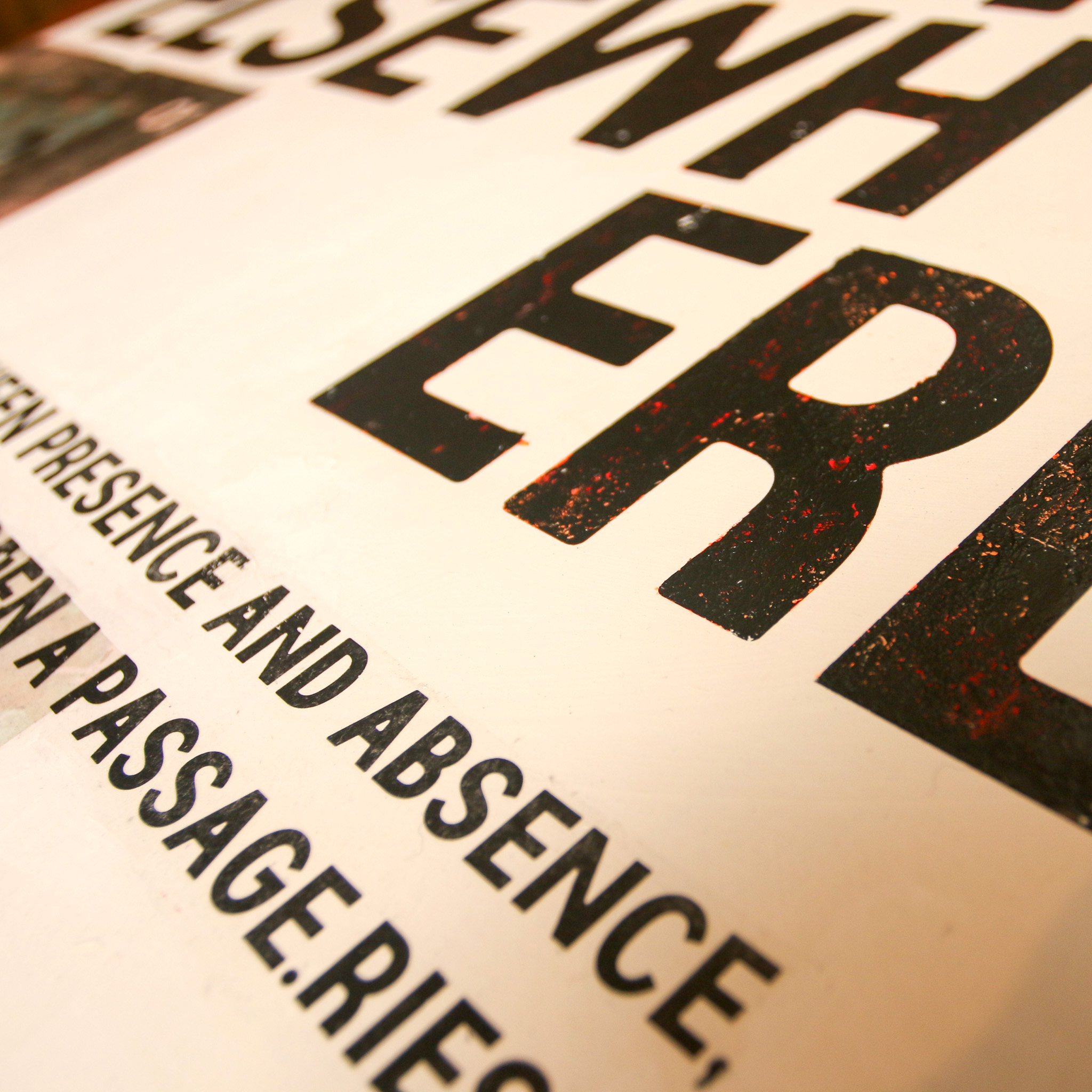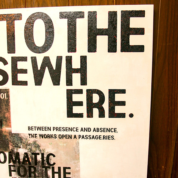 キャプション: 存在と不在の狭間に落ちる言葉とイメージ。 記憶の断片をアクリルと転写で再構成したタイポグラフィック・コンポジション。