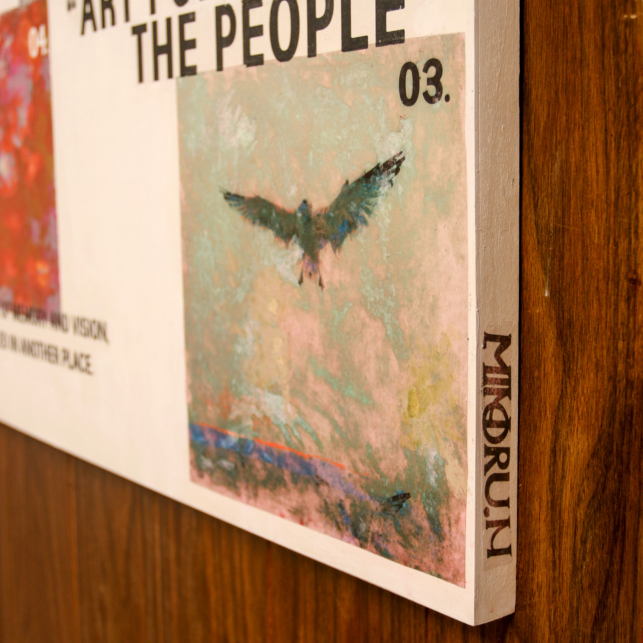 転写によって再現されたイメージと、アクリル絵具による描写を重ね合わせることで、印刷物・写真・絵画の境界を横断する視覚体験を構築。タイポグラフィは情報であると同時に絵画的要素として扱われている。均質化された社会の中で、見過ごされてきた断片が新たな物語を帯びて立ち現れる構造を描き出している。