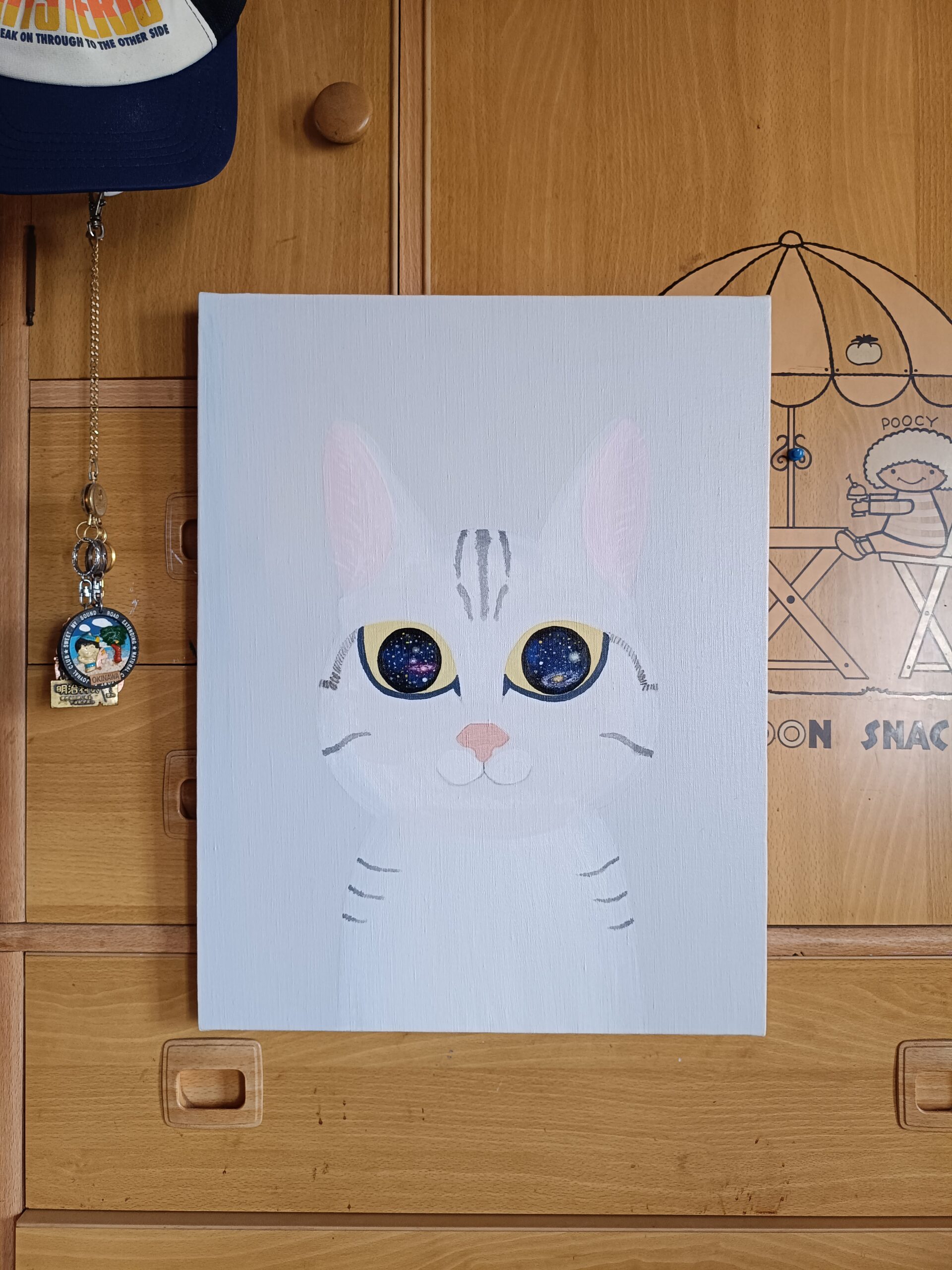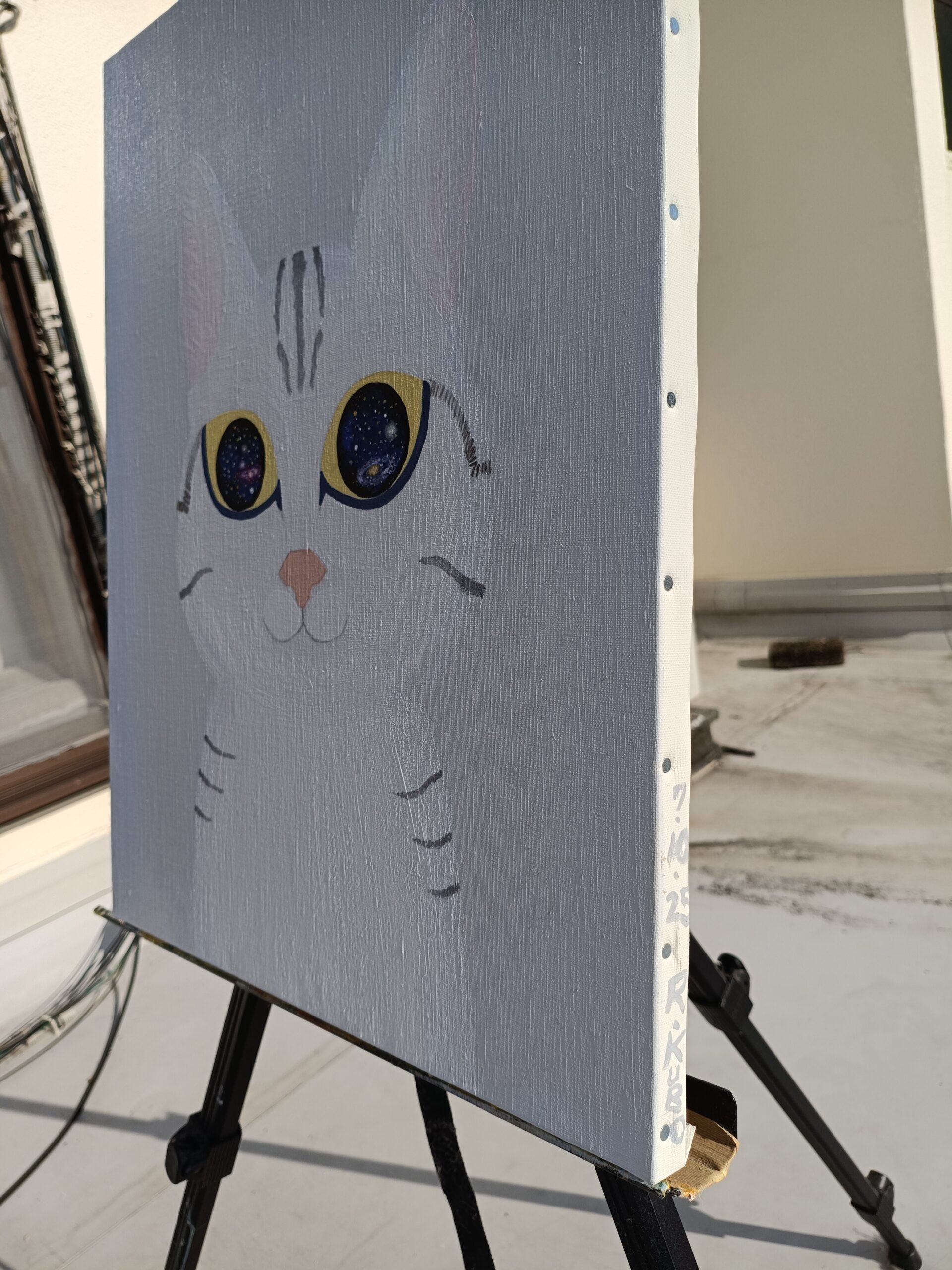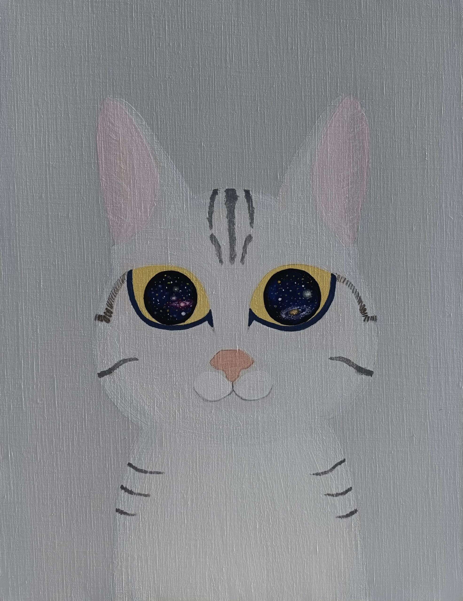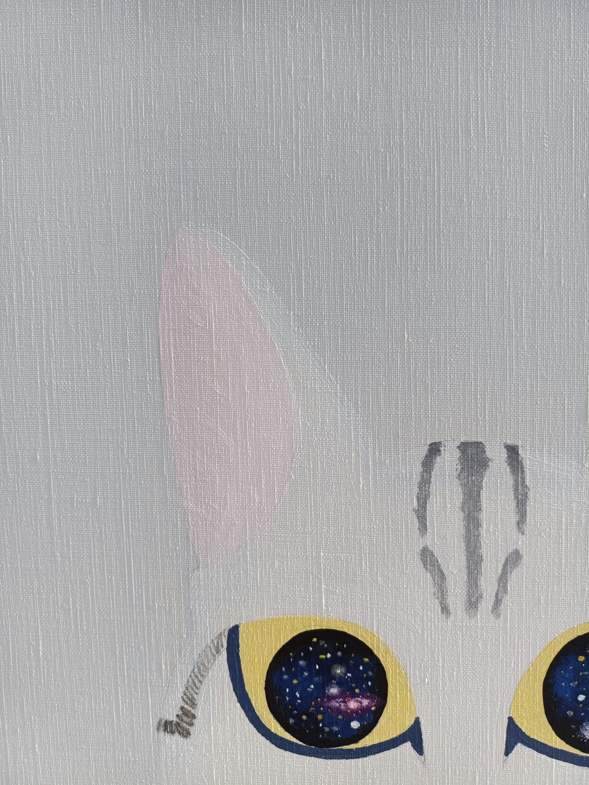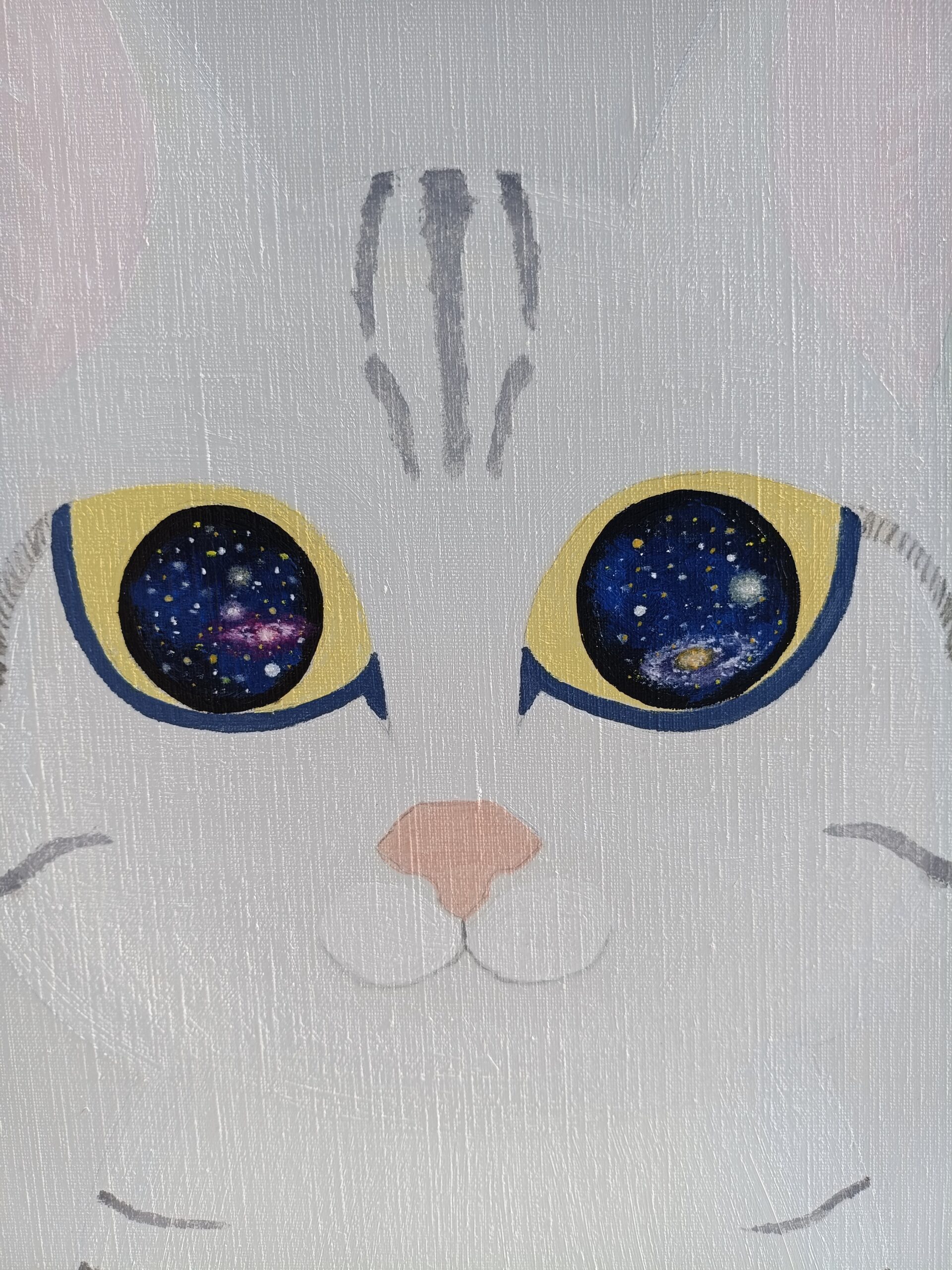 この油絵では、ポップアート風の半抽象的な猫に、遊び心と驚きへの情熱を注ぎ込みました。猫は宇宙的な目をしています。その瞳に宿る星々は、見る人を大きな夢へと誘い、無限の可能性を探求するよう促します。この作品は遊び心と神秘的なエネルギーを放ち、飾られた空間に魔法のような温もりと喜びに満ちた好奇心をもたらします。想像力と、小さな生き物たちに宿る美しさを称える作品です。