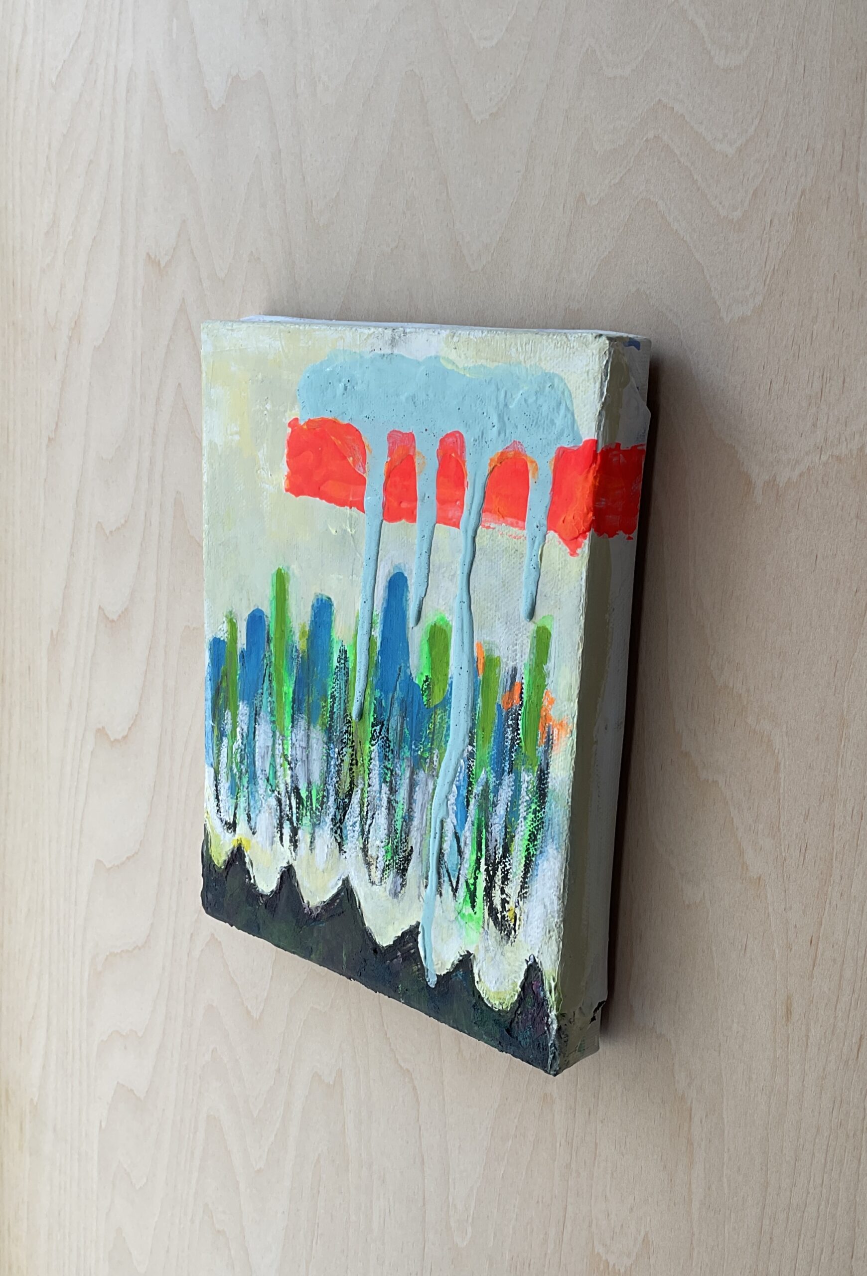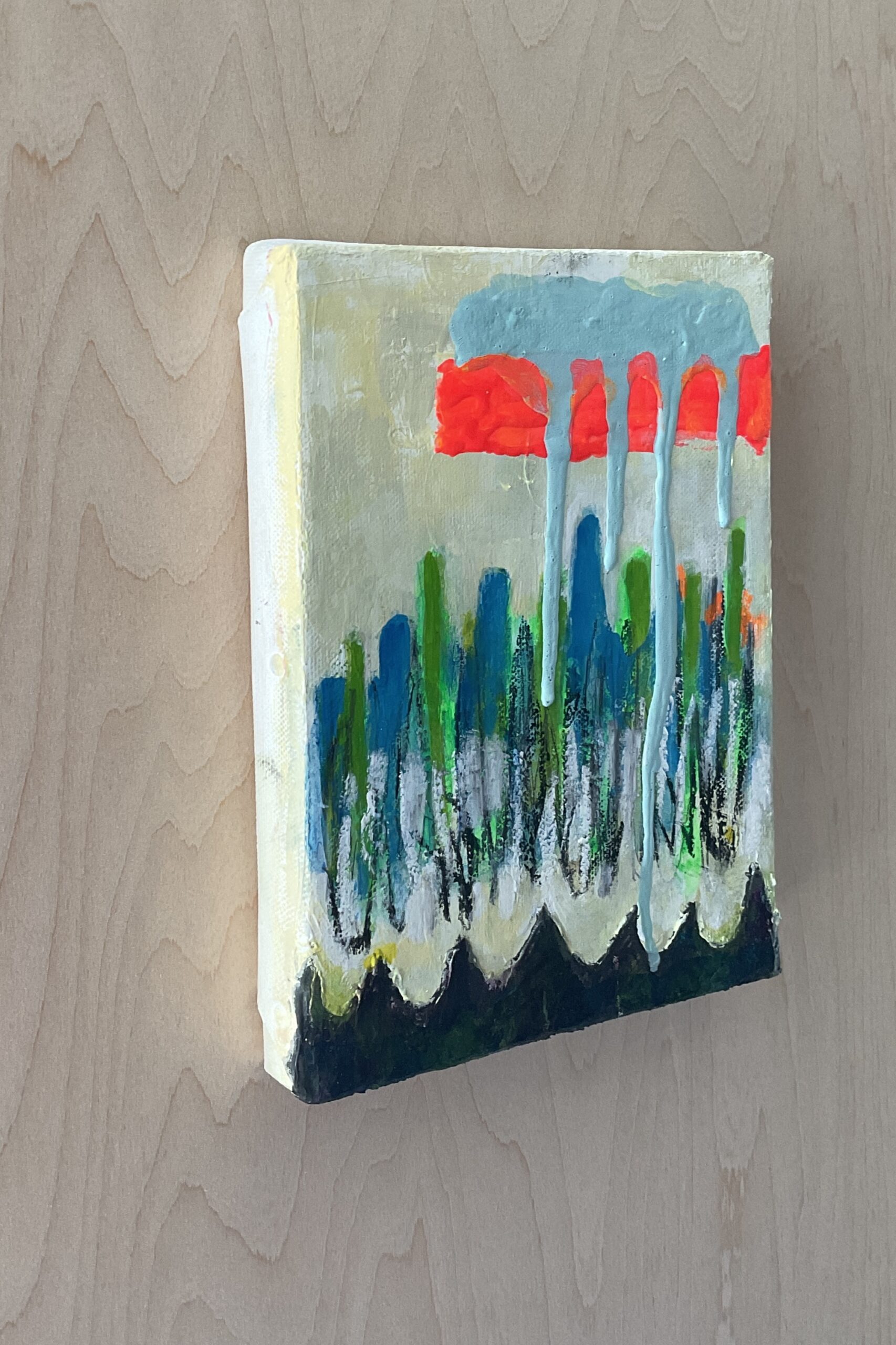 心の中に焦りを感じたその日、降っている雨音の優しさに癒された心情を抽象的に表現した絵画です。とはいえ色味や形から色々な見方で想像して楽しんでいただけるかと思います。