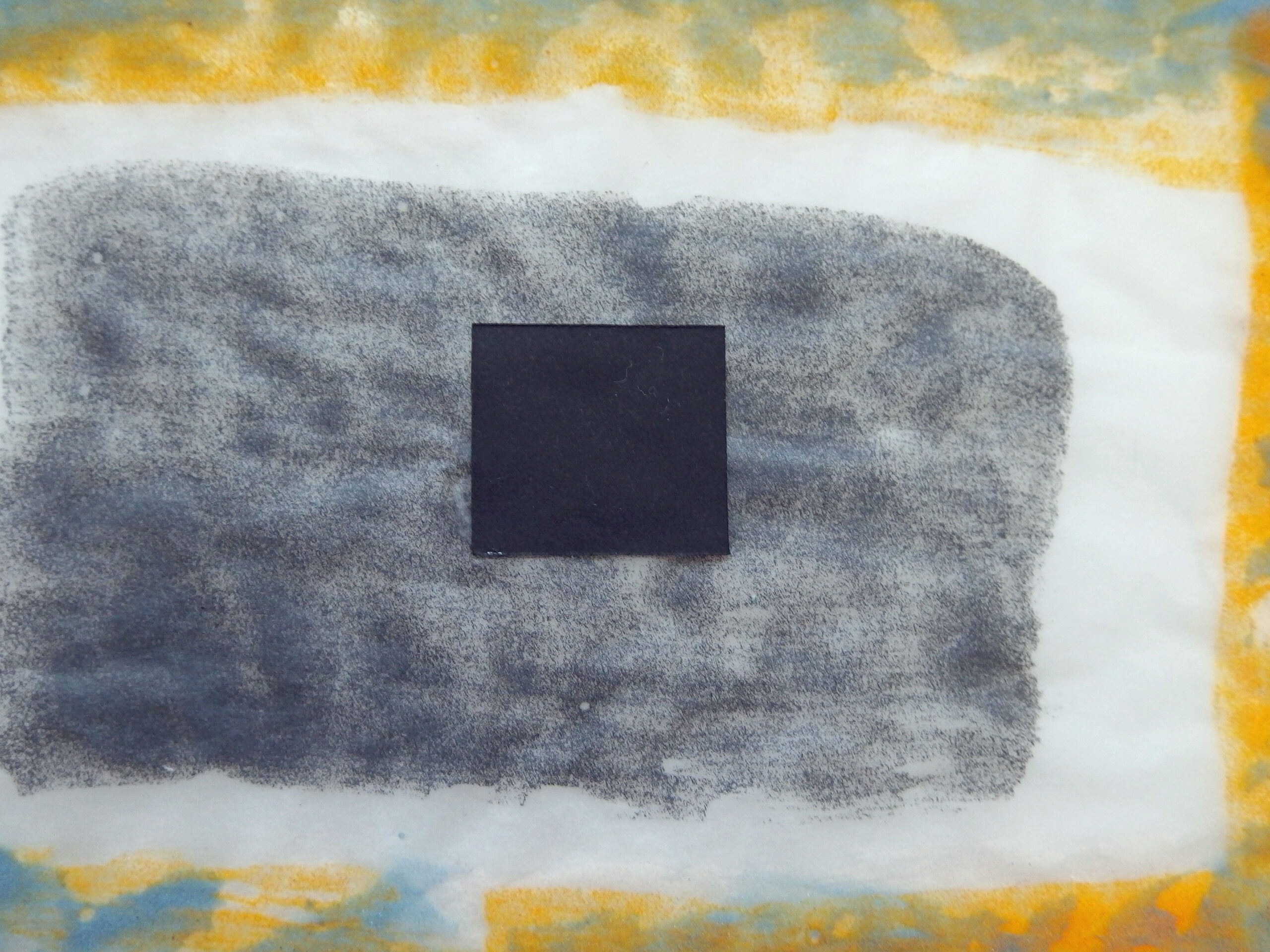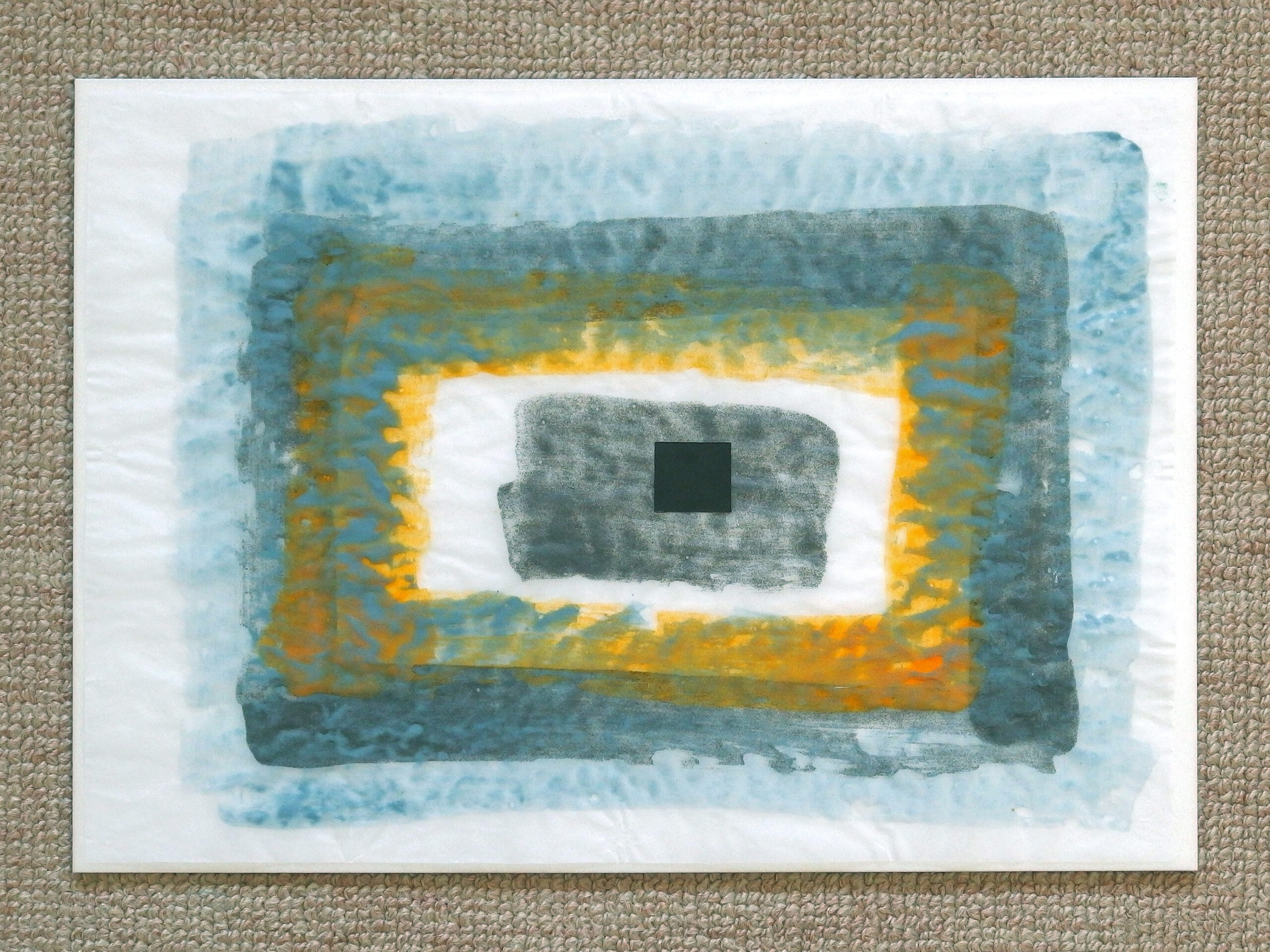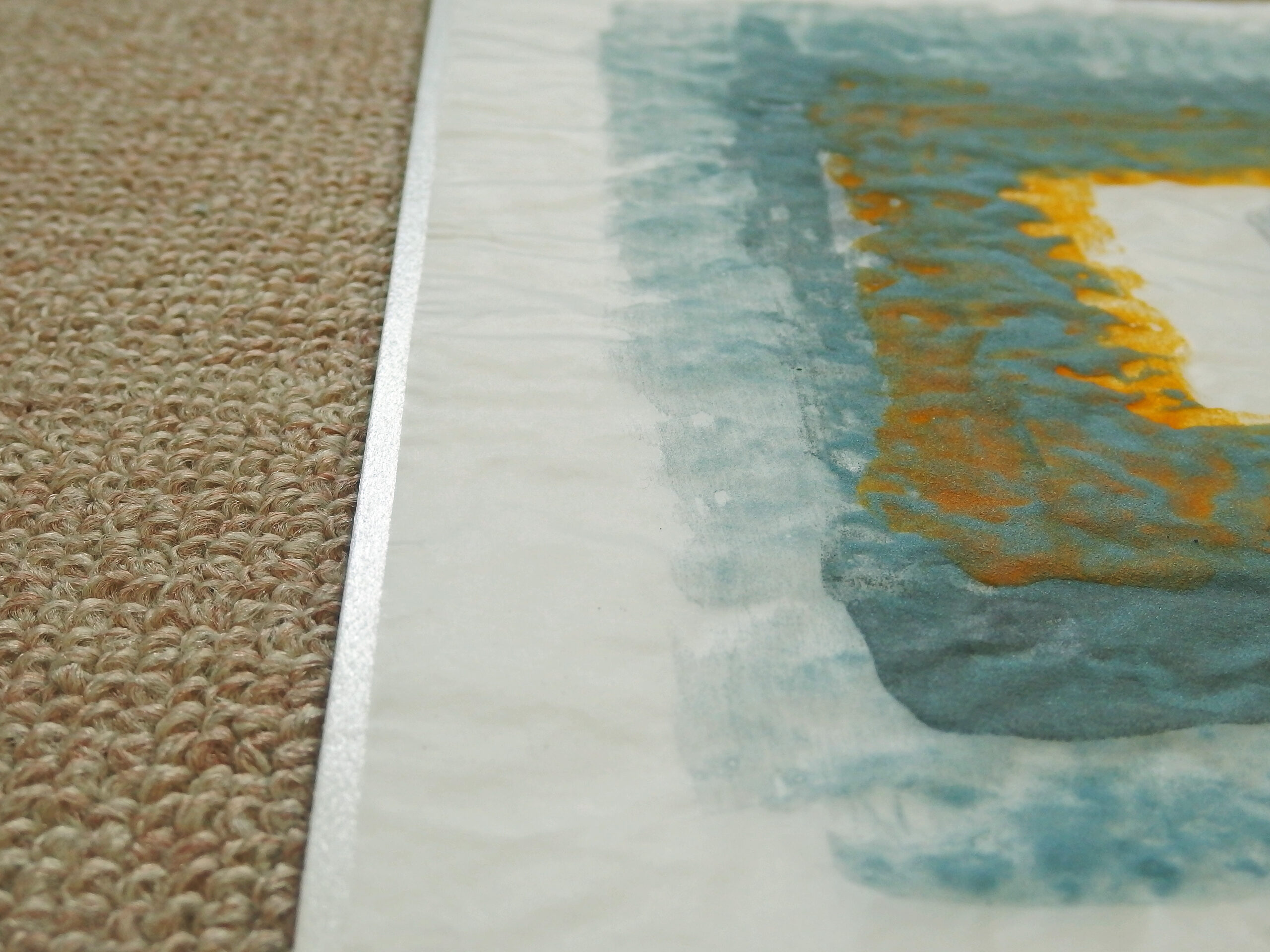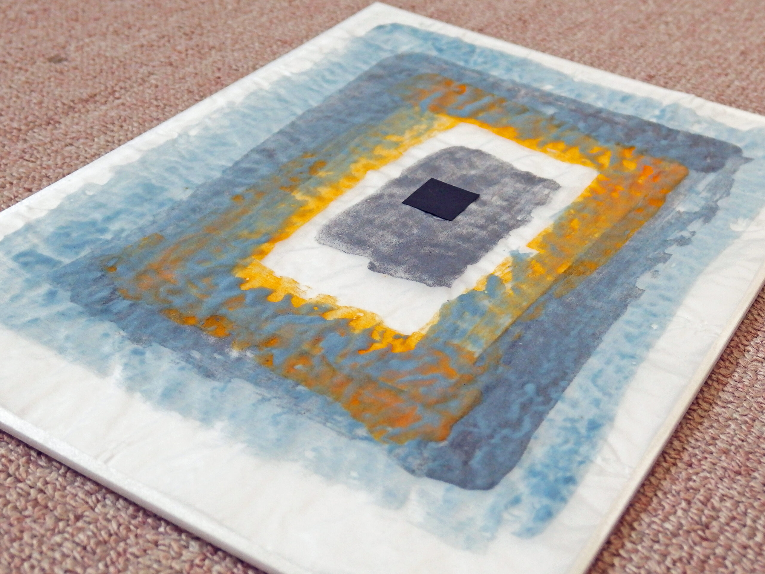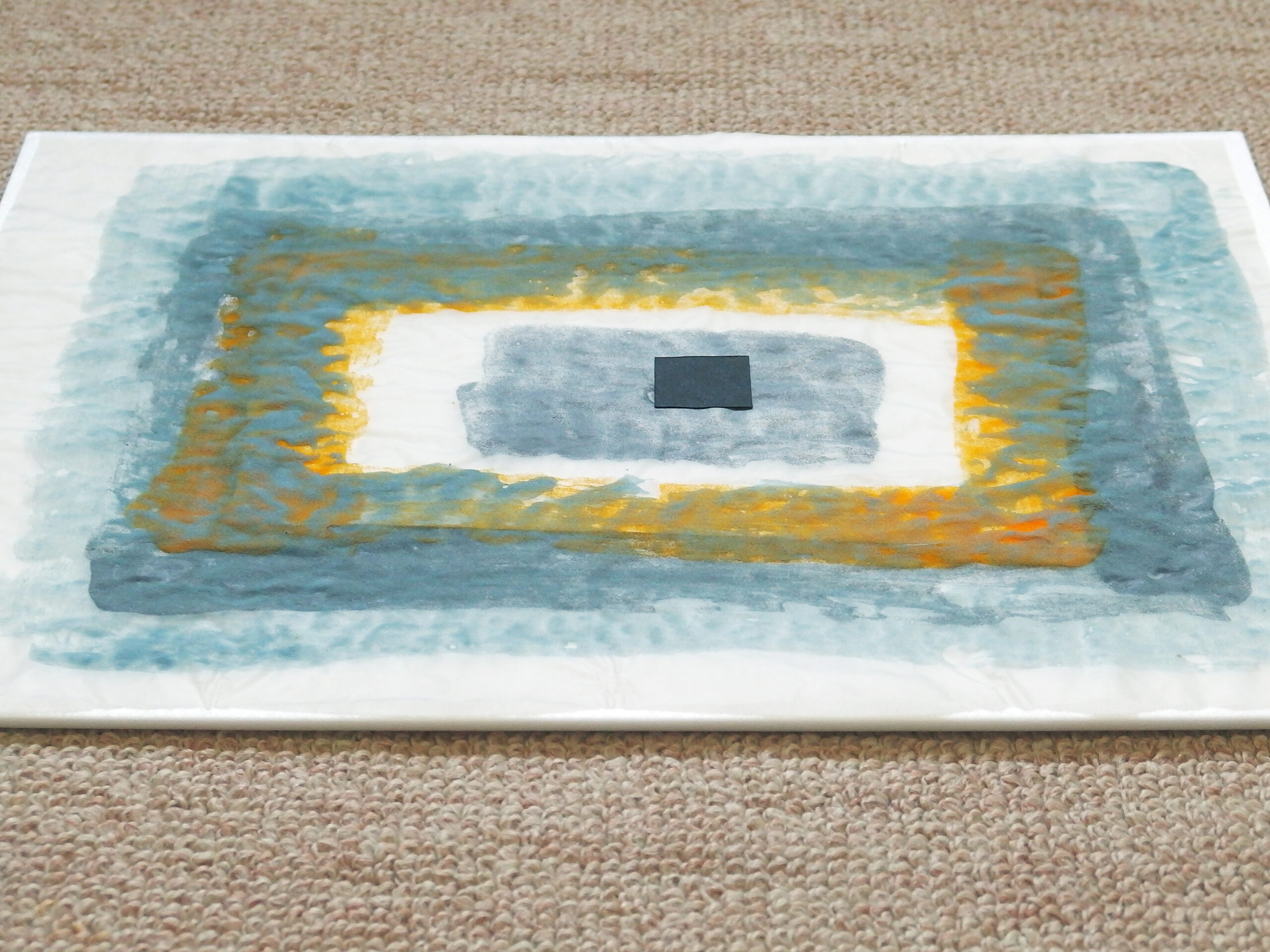 天然素材の和紙に膠を使うのが「日本画」の常識ですが、あえて人工素材を使っています。