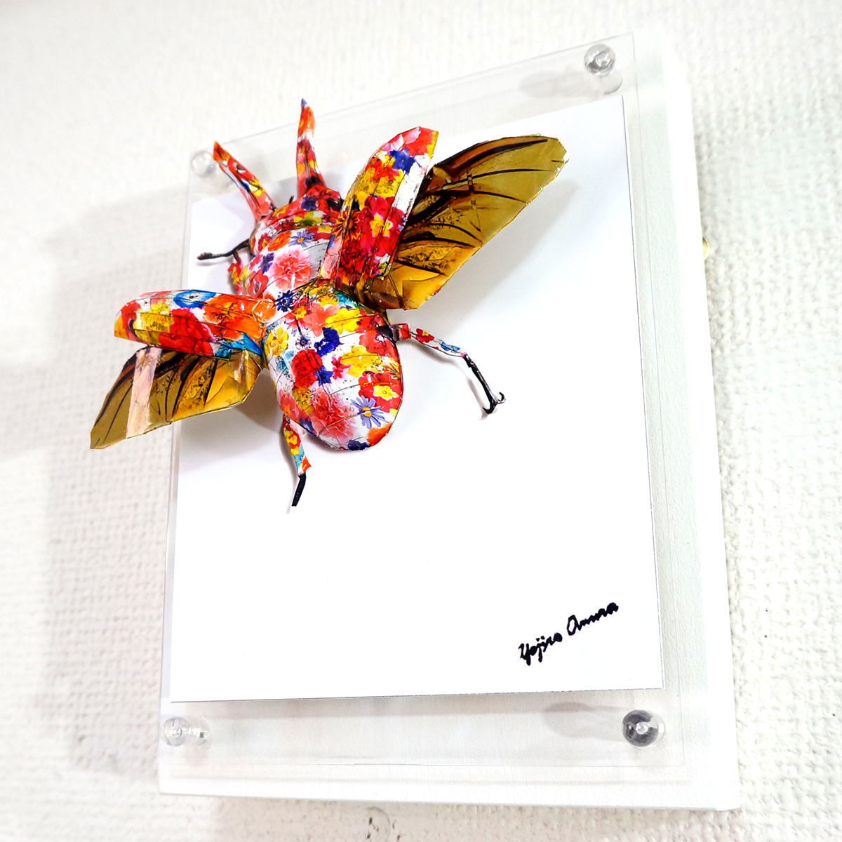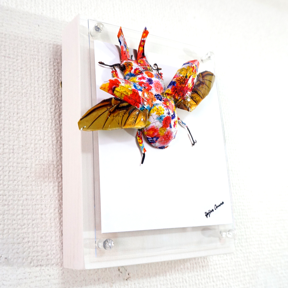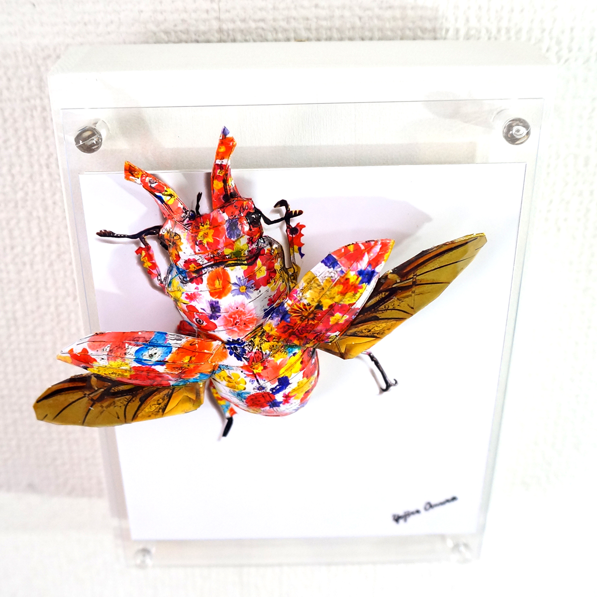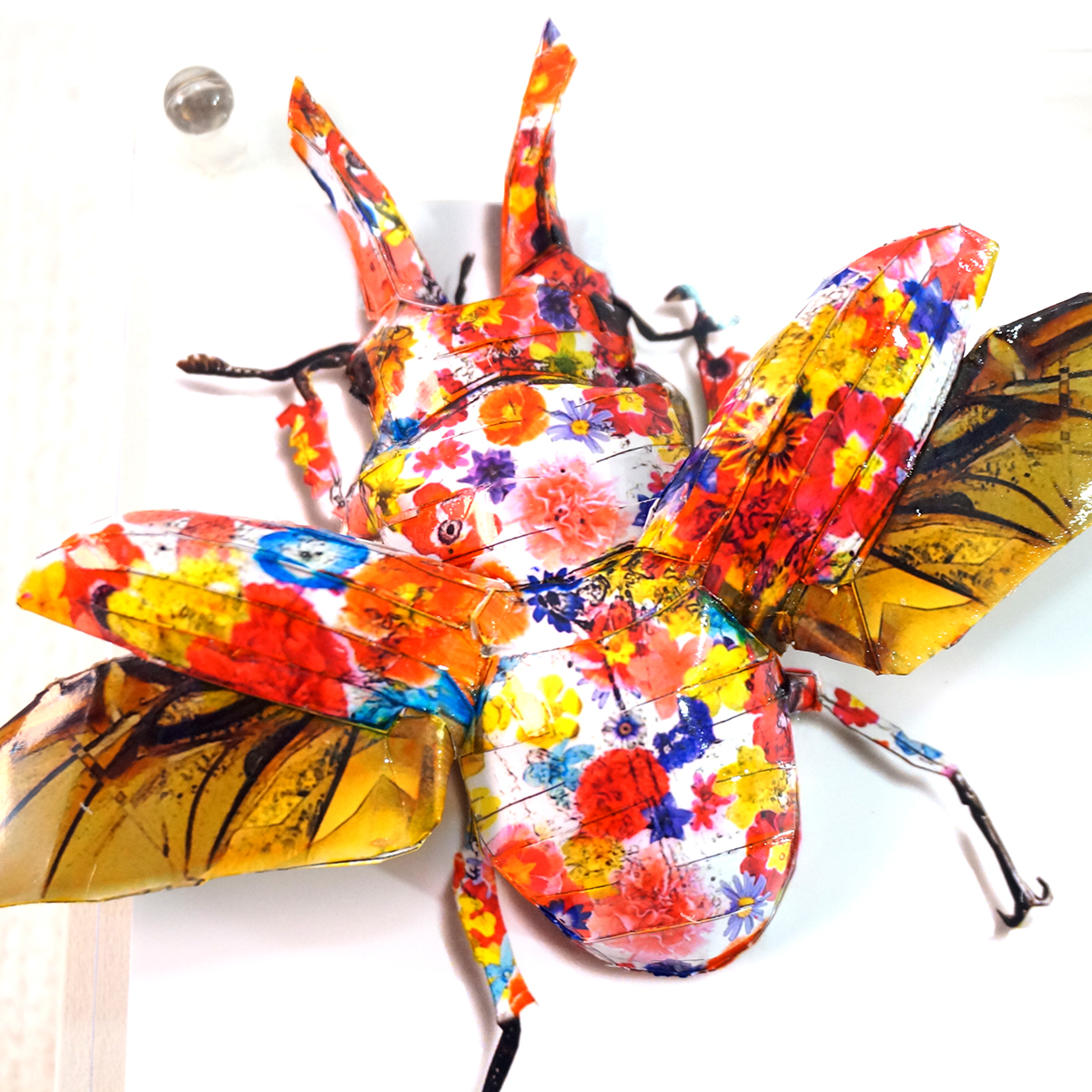 ローゼンベルグオウゴンオニクワガタのコラージュ画像を作成しペーパークラフト技術を用いて立体的に表現した作品です。