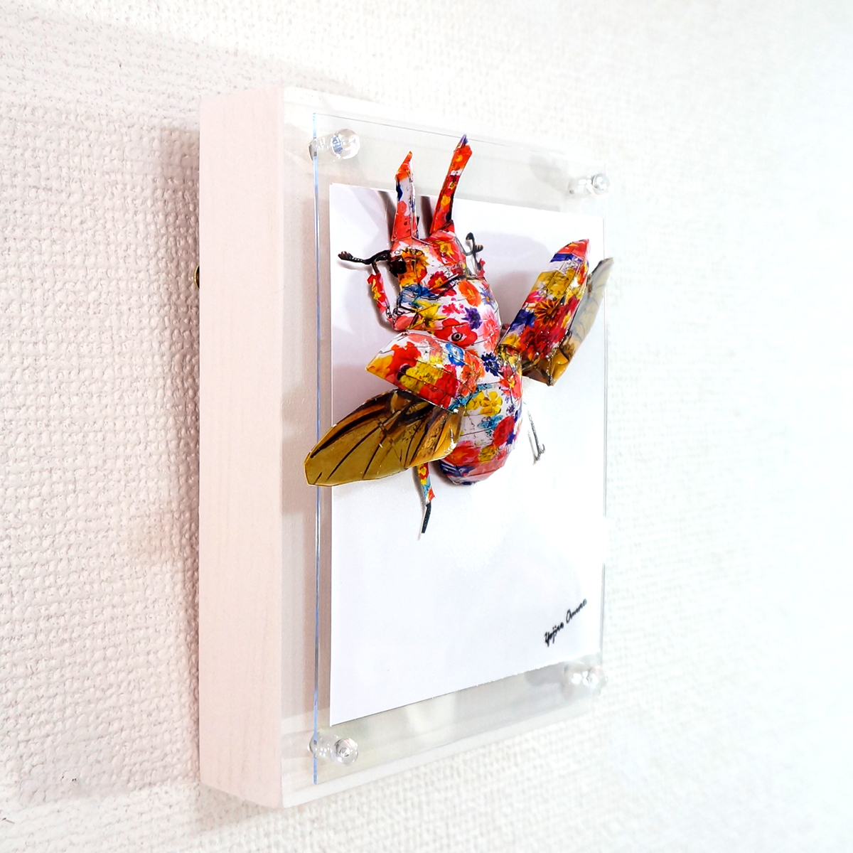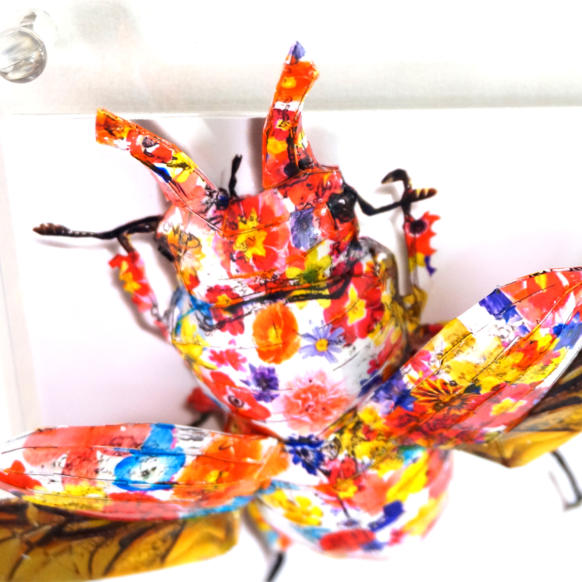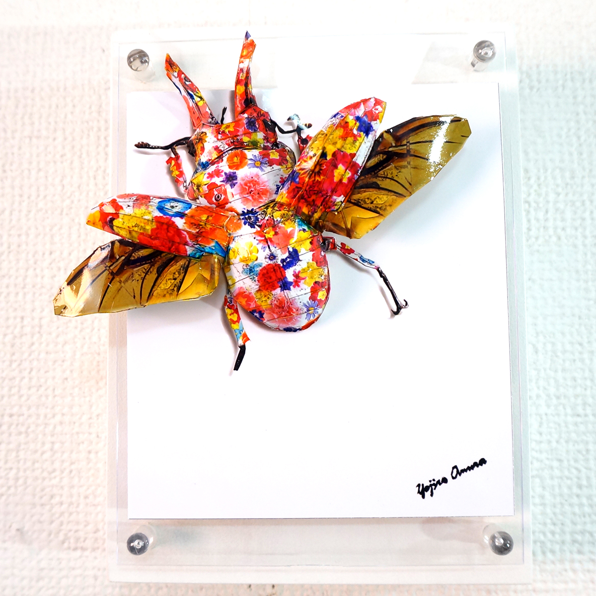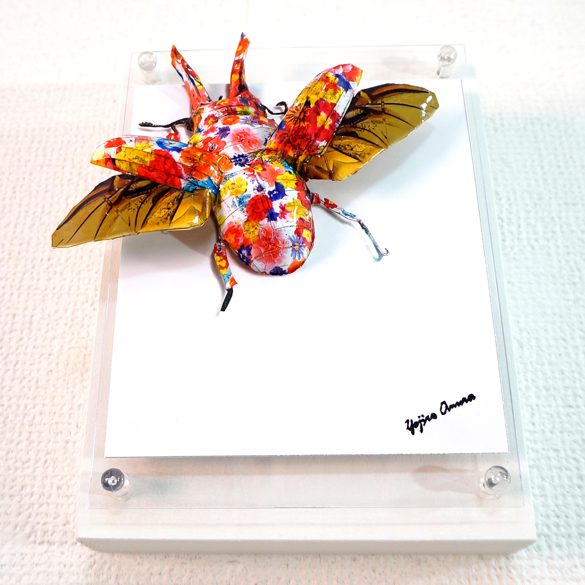 ローゼンベルグオウゴンオニクワガタのコラージュ画像を作成しペーパークラフト技術を用いて立体的に表現した作品です。