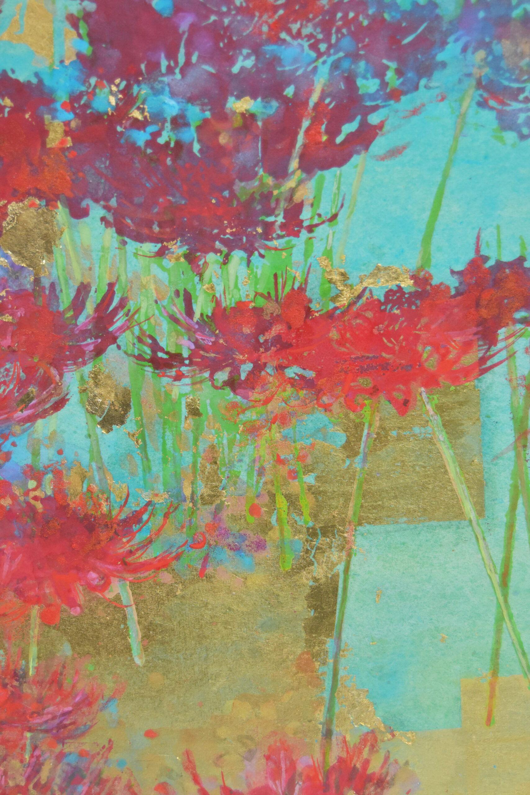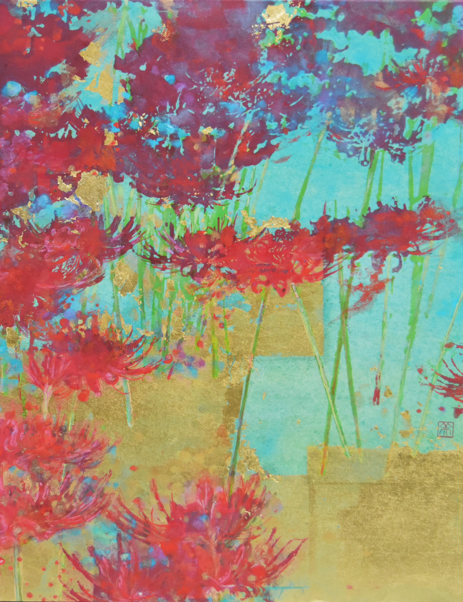 群生するヒガンバナを抽象的に描いてみました。彼岸花には怪しい美しさがありますが、極楽に咲く花という意味の別名、「曼殊沙華」という名前も付いていて、その両面性が好きな花です。