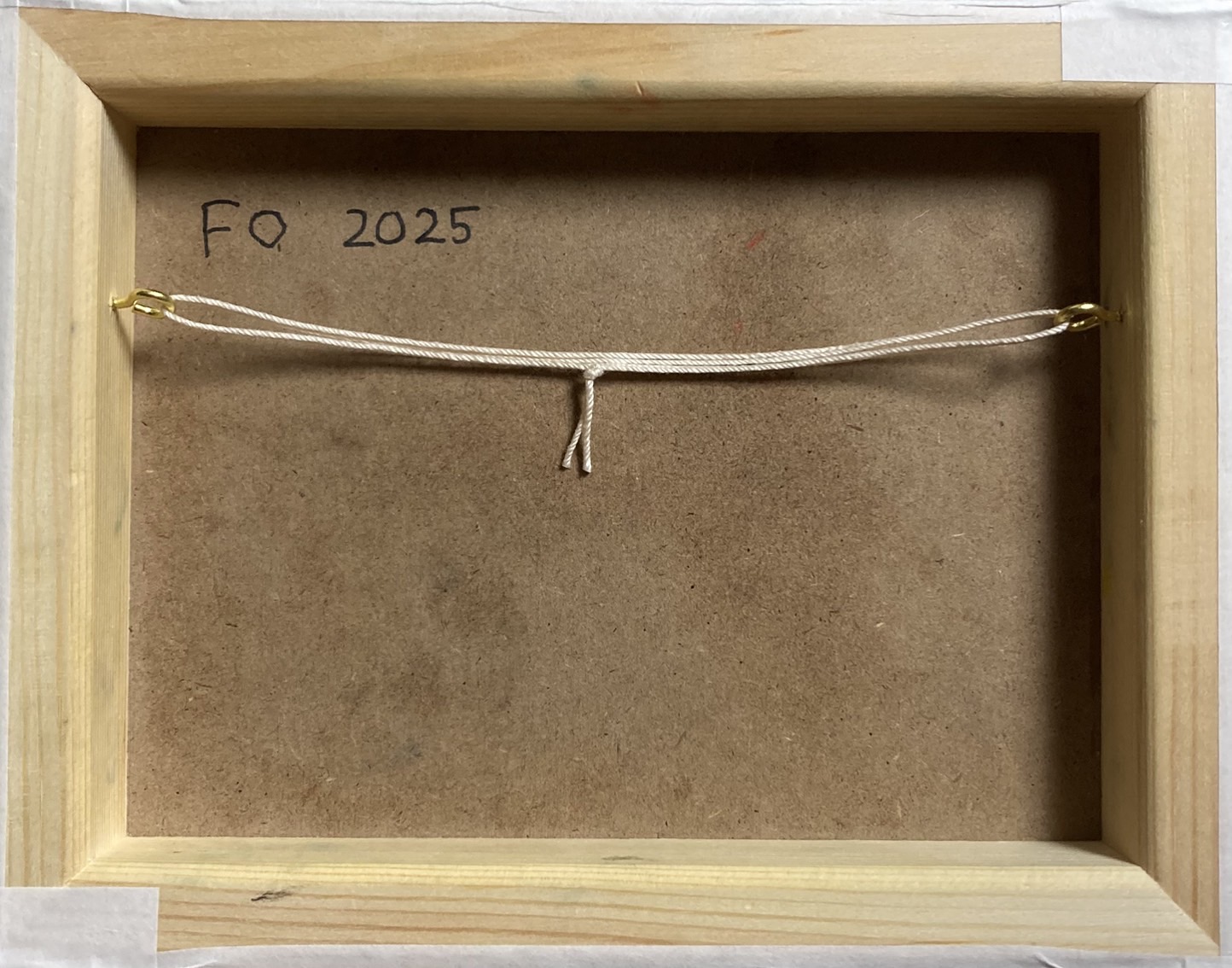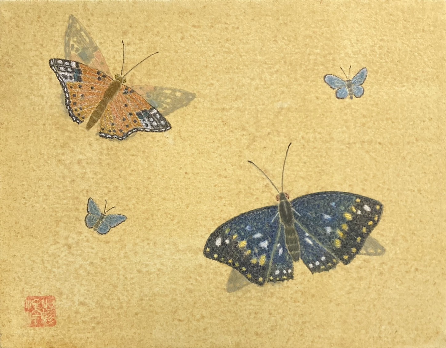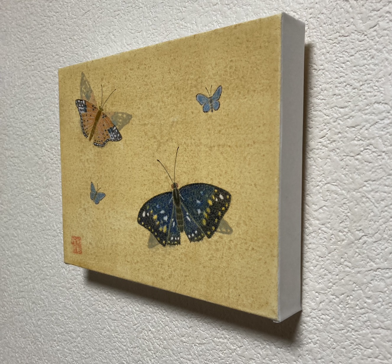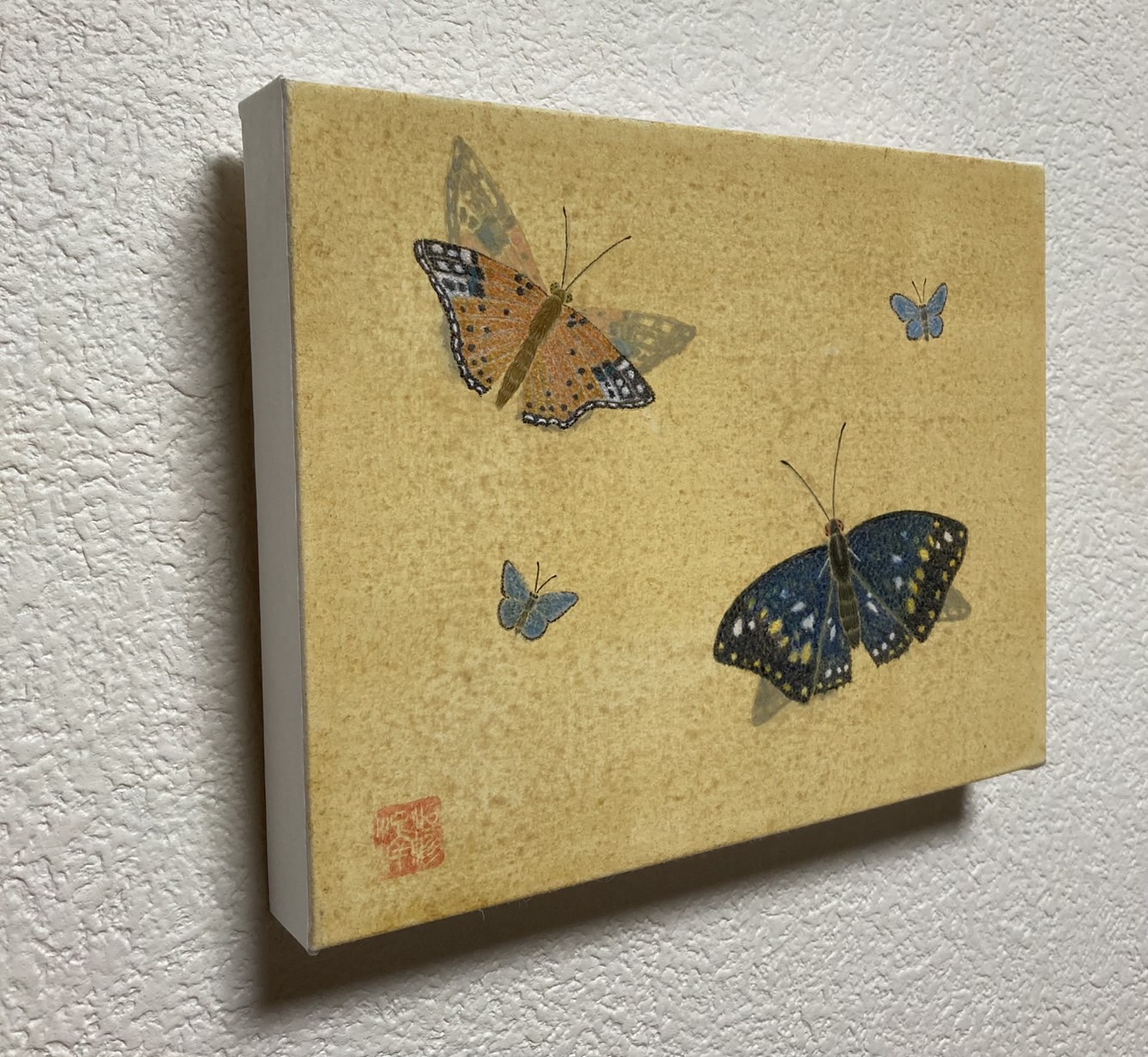ひらひらと飛ぶ蝶をイメージして描きました。粗めの岩絵具で羽の質感を表現しているので近くで見ると所々光って見えます。