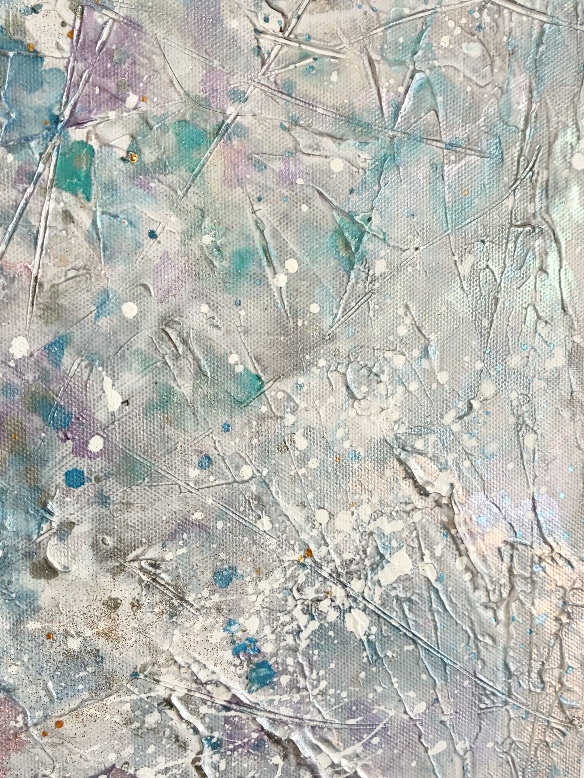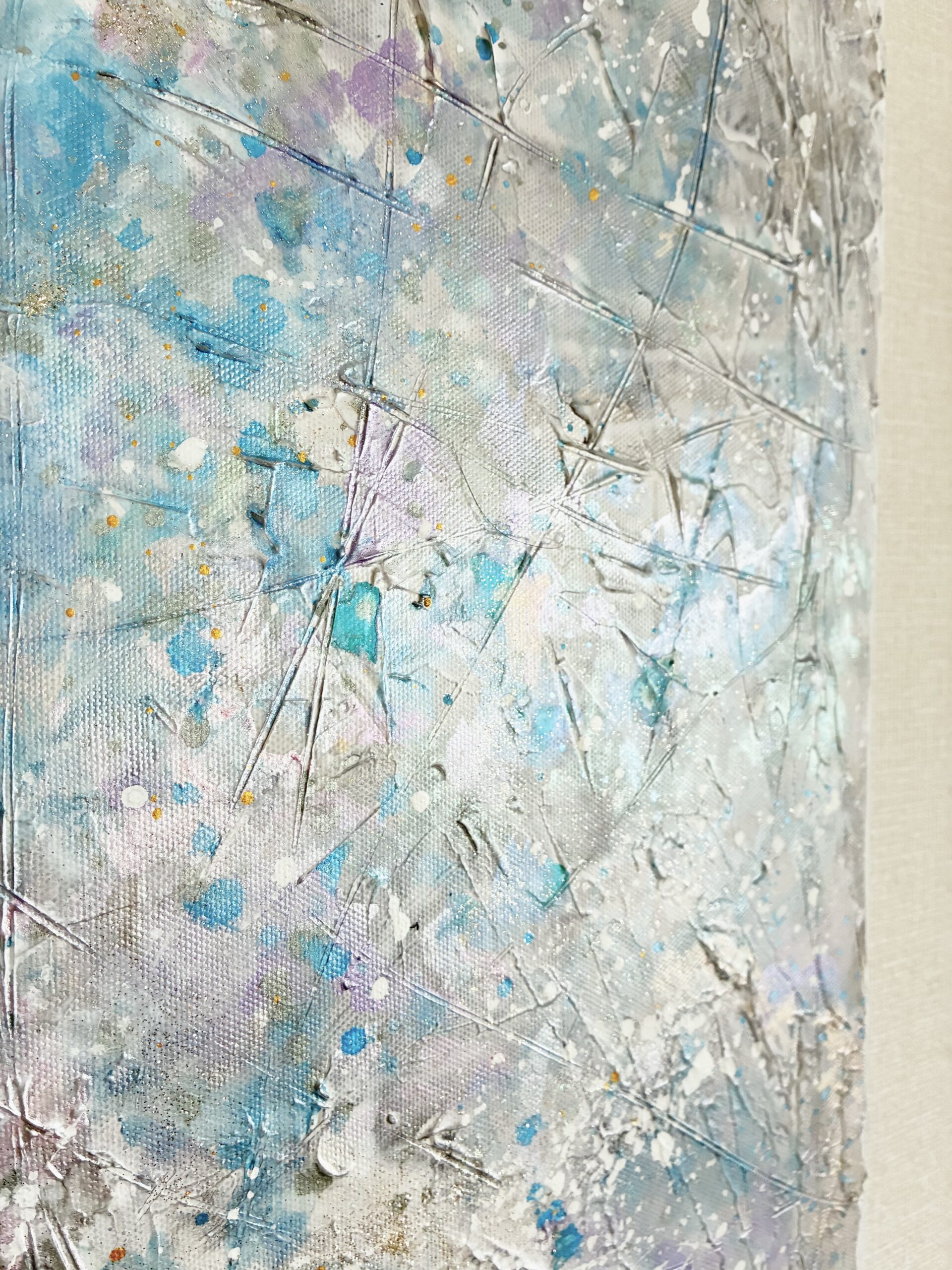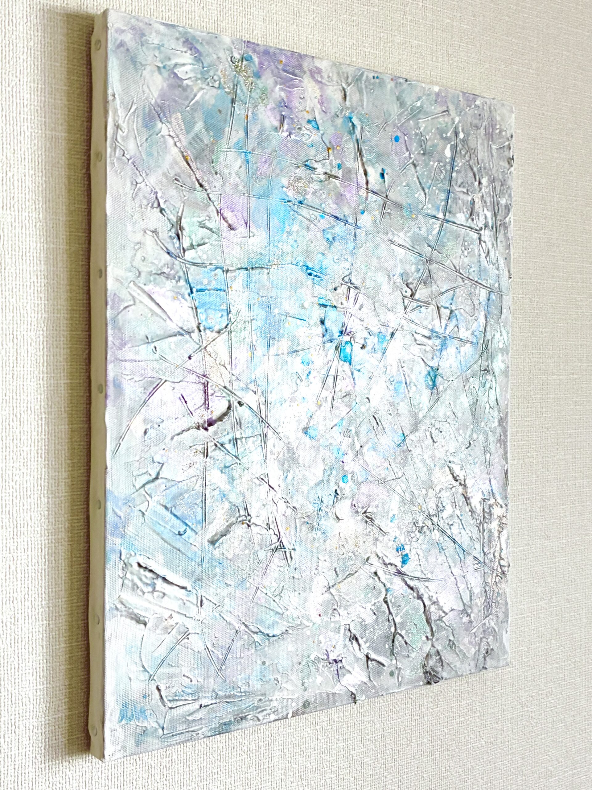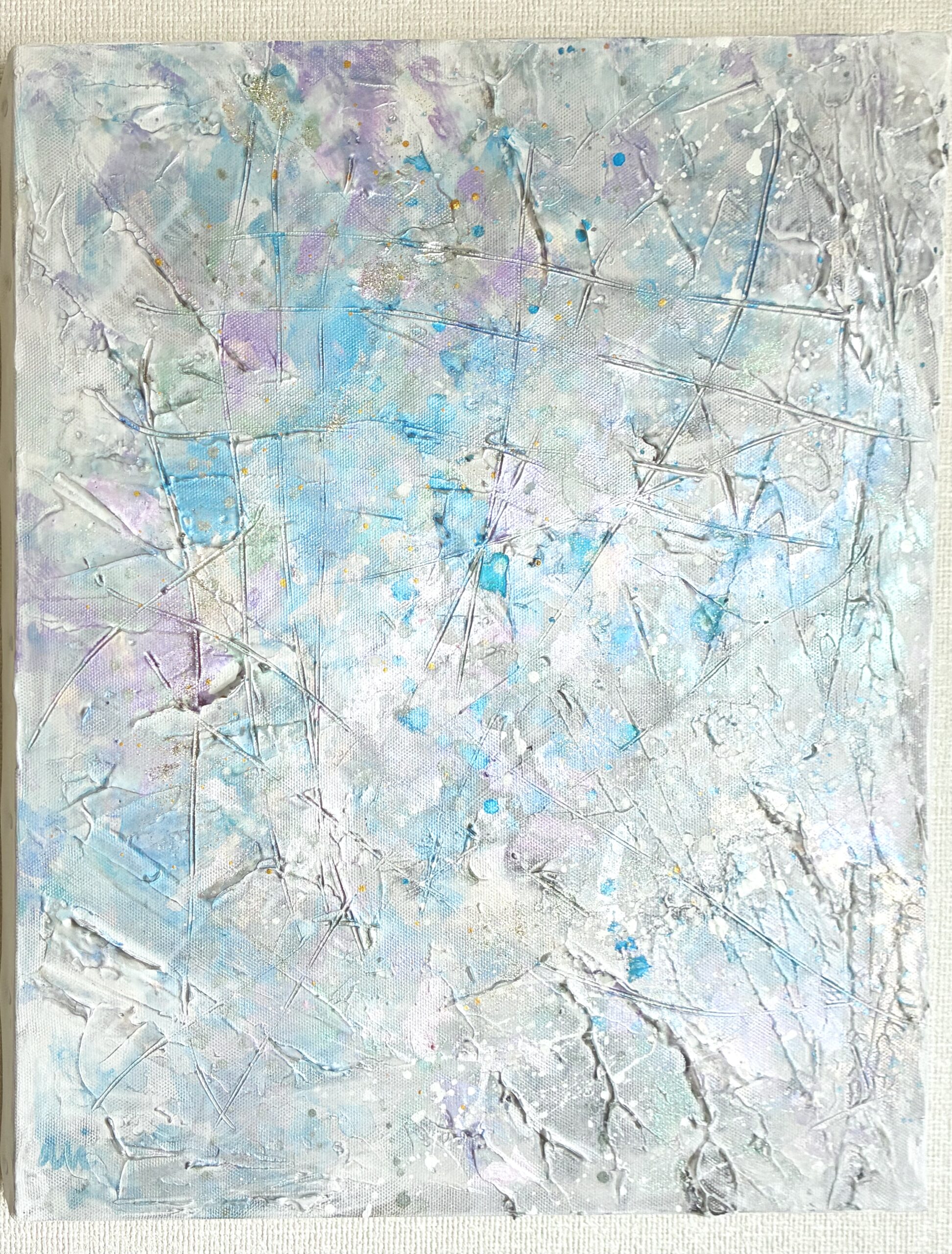 白を基調に、ランダムなテクスチャーを描き、パール絵の具やラメをたっぷり使いました。