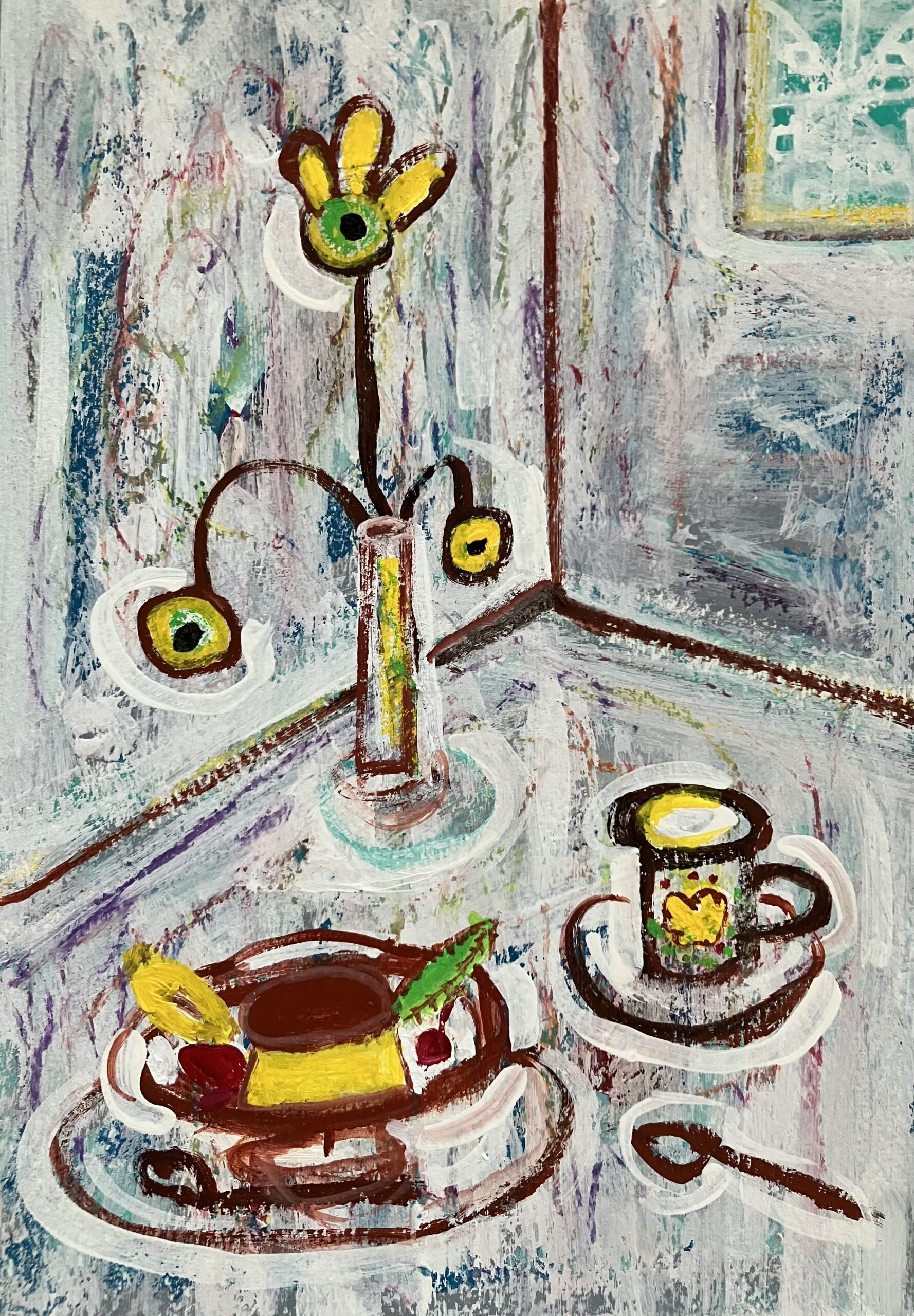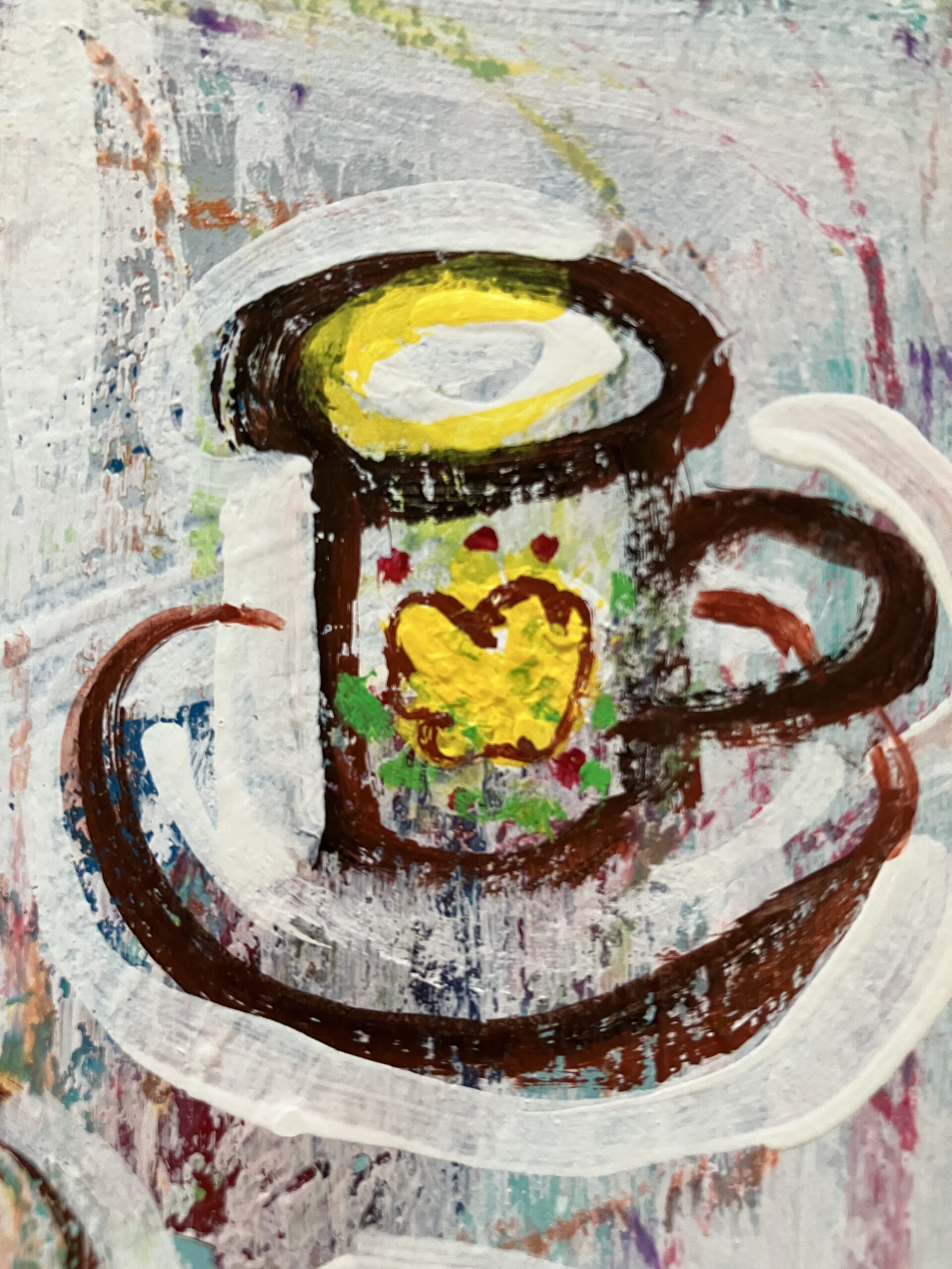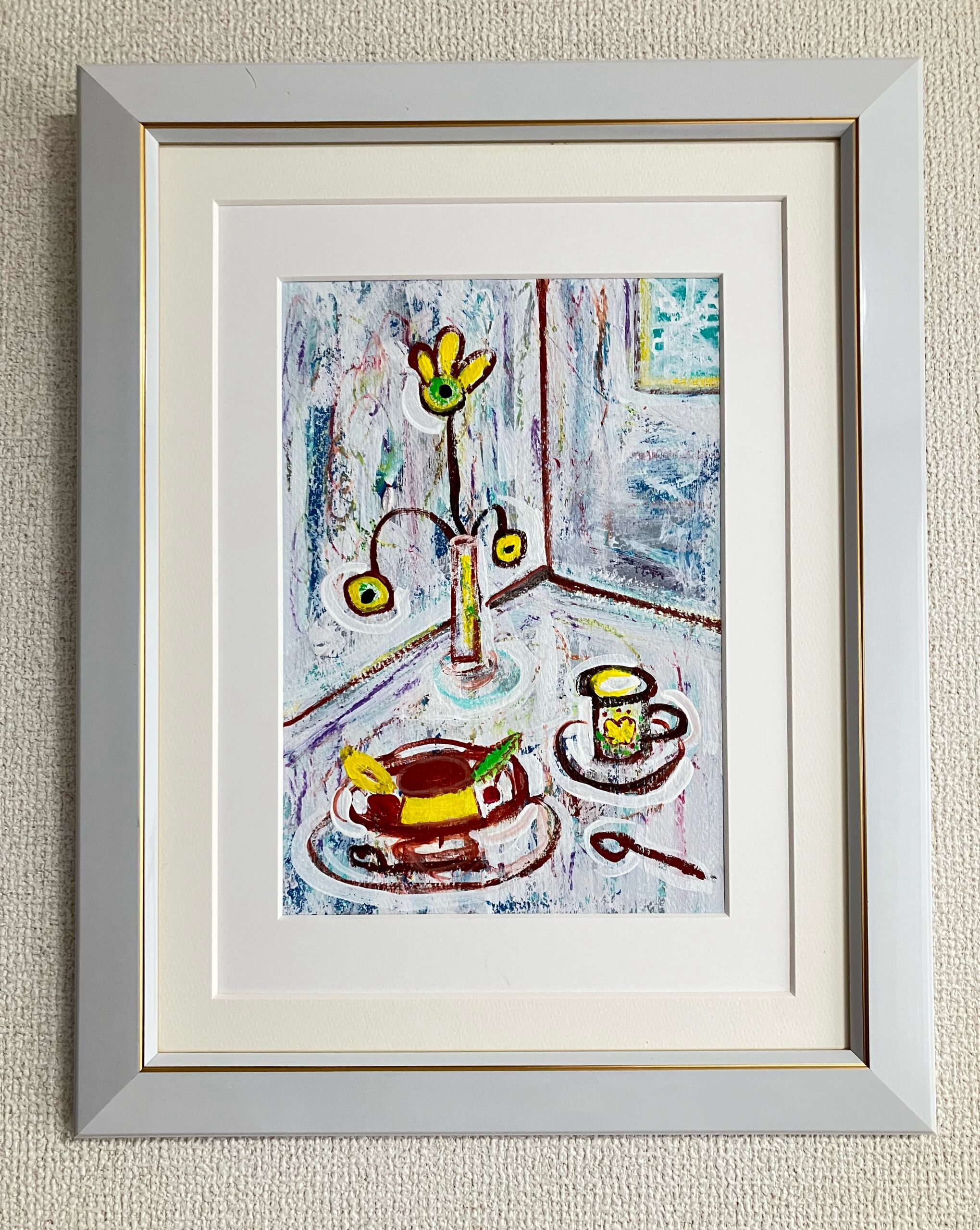 ワトソン水彩紙に、アクリル絵具とオイルパステルを重ねたミクストメディアの原画作品です。