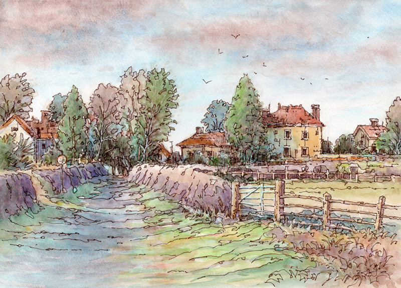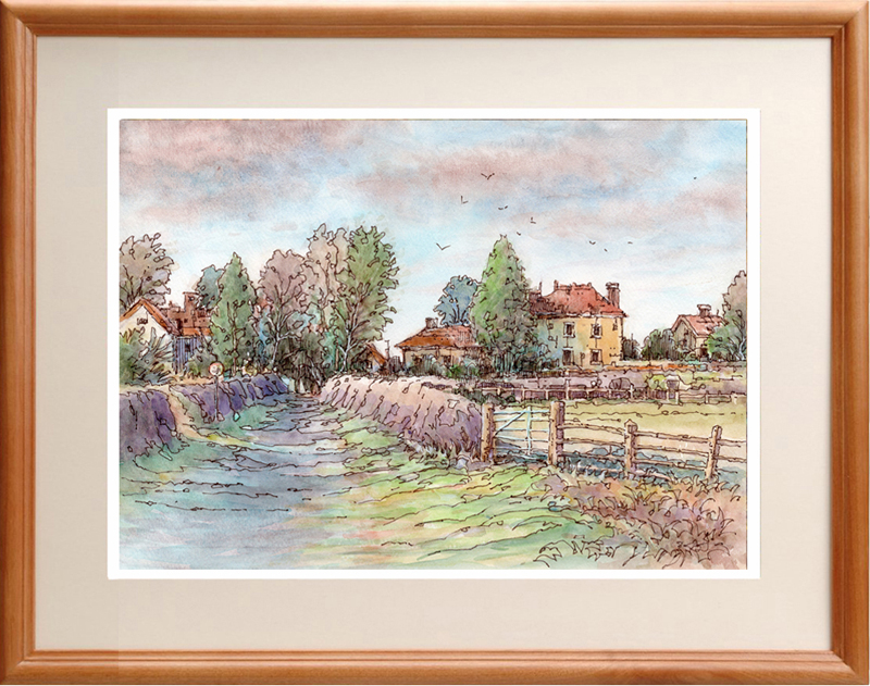 水彩画原画 ひつじ牧場のある村 #676 ある村