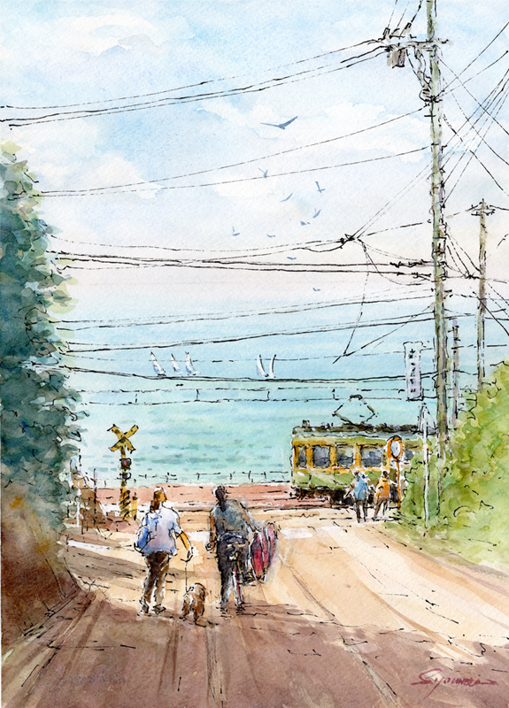 水彩画原画 江ノ電と湘南の海・日坂 #670