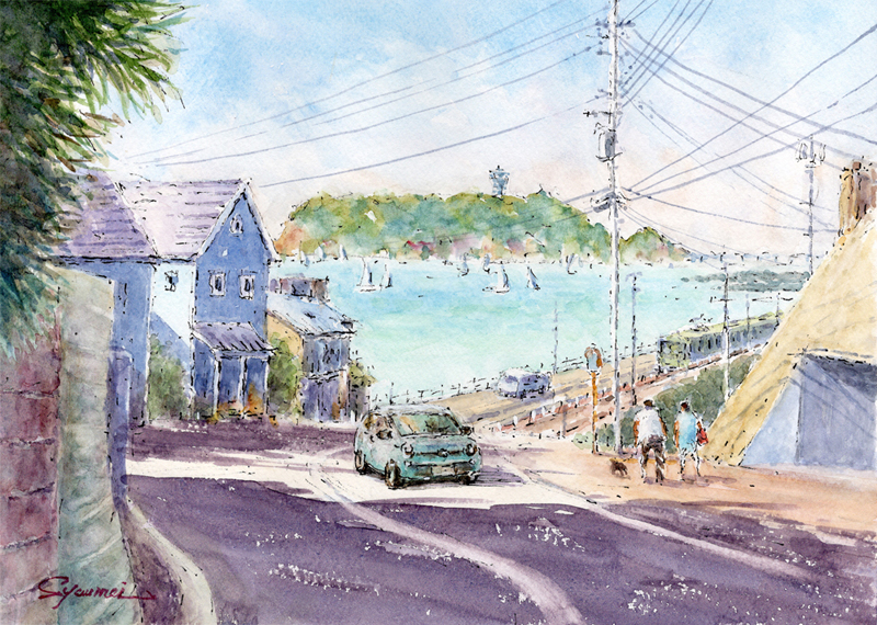 水彩画原画 緑の江の島と七里ヶ浜2 #679