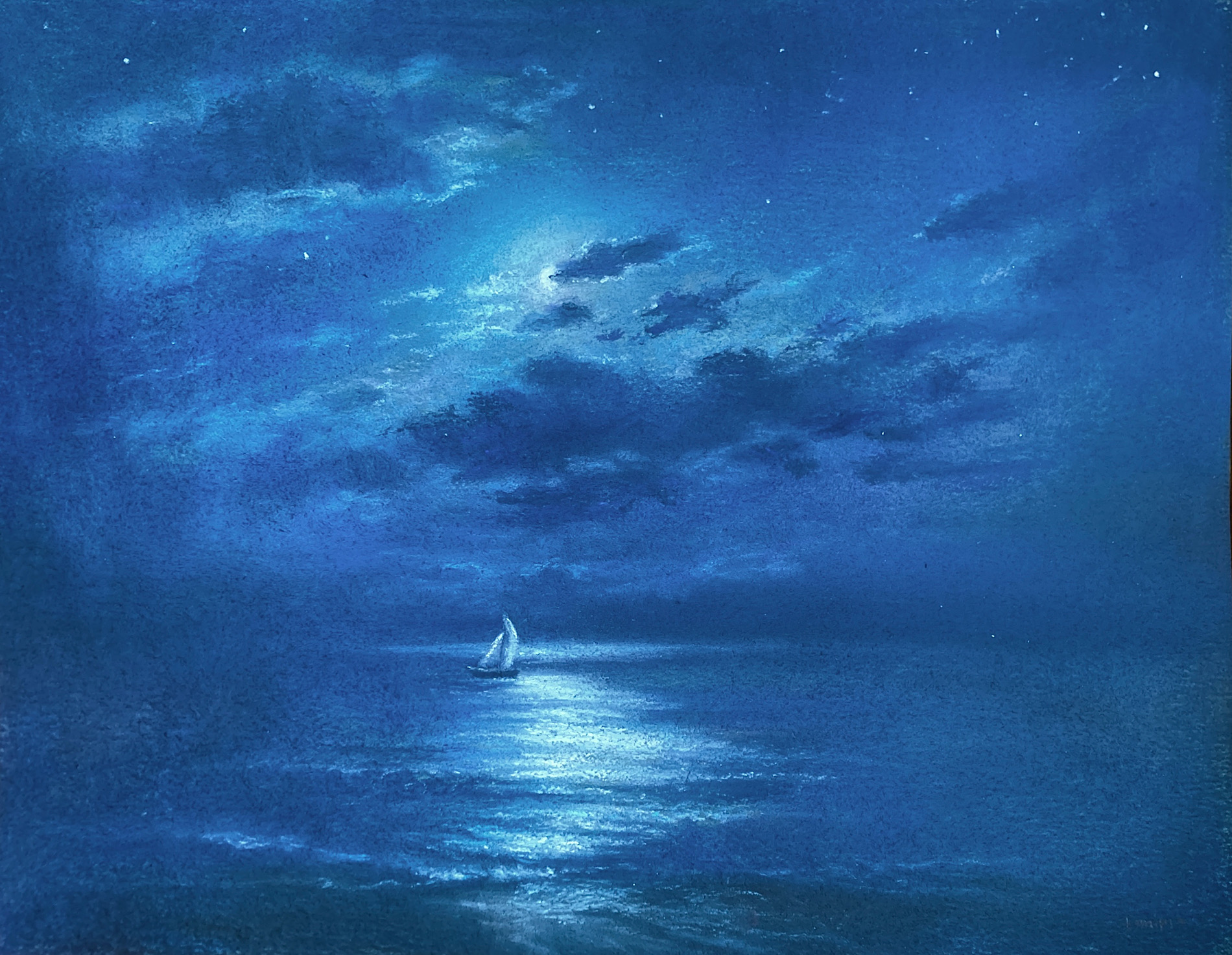 満月の日に見た夜の海が忘れられず作品にしました。実際に見た風景と想像の世界を織り交ぜて描きました。