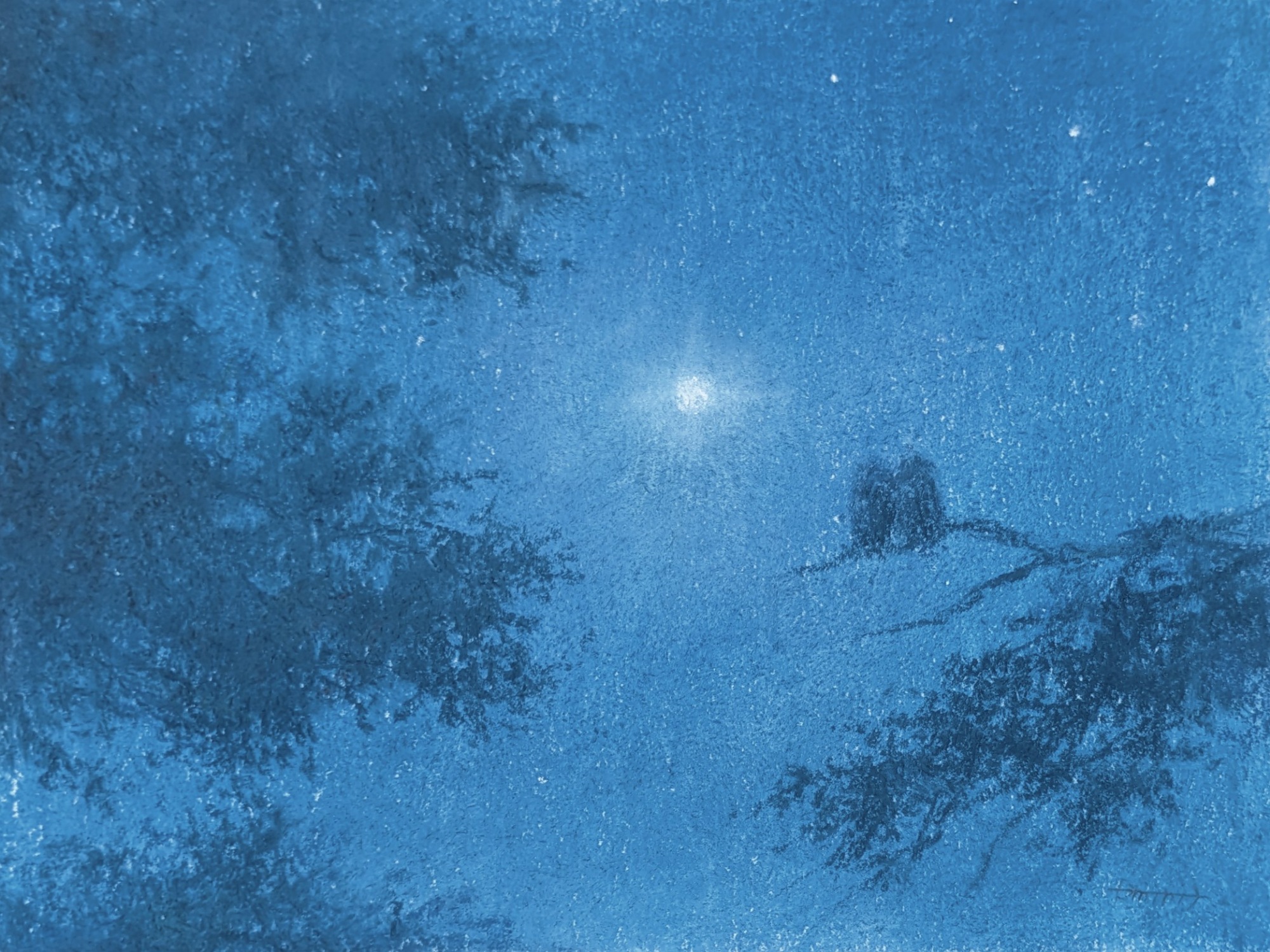 雲がなく澄み切った満月の夜空。木の葉がそよ風に揺らされ、フクロウ達も月の光に照らされて。時の流れを感じながら、こんな夜を過ごしてみたいです。