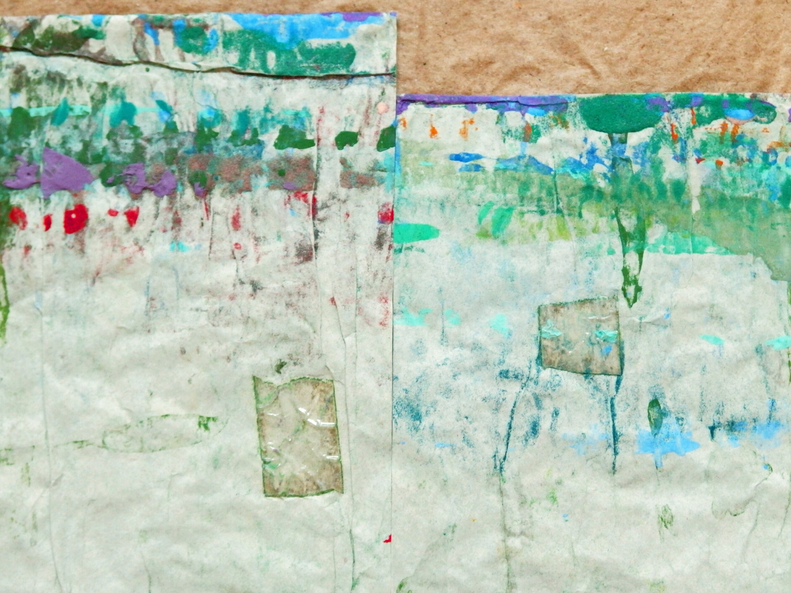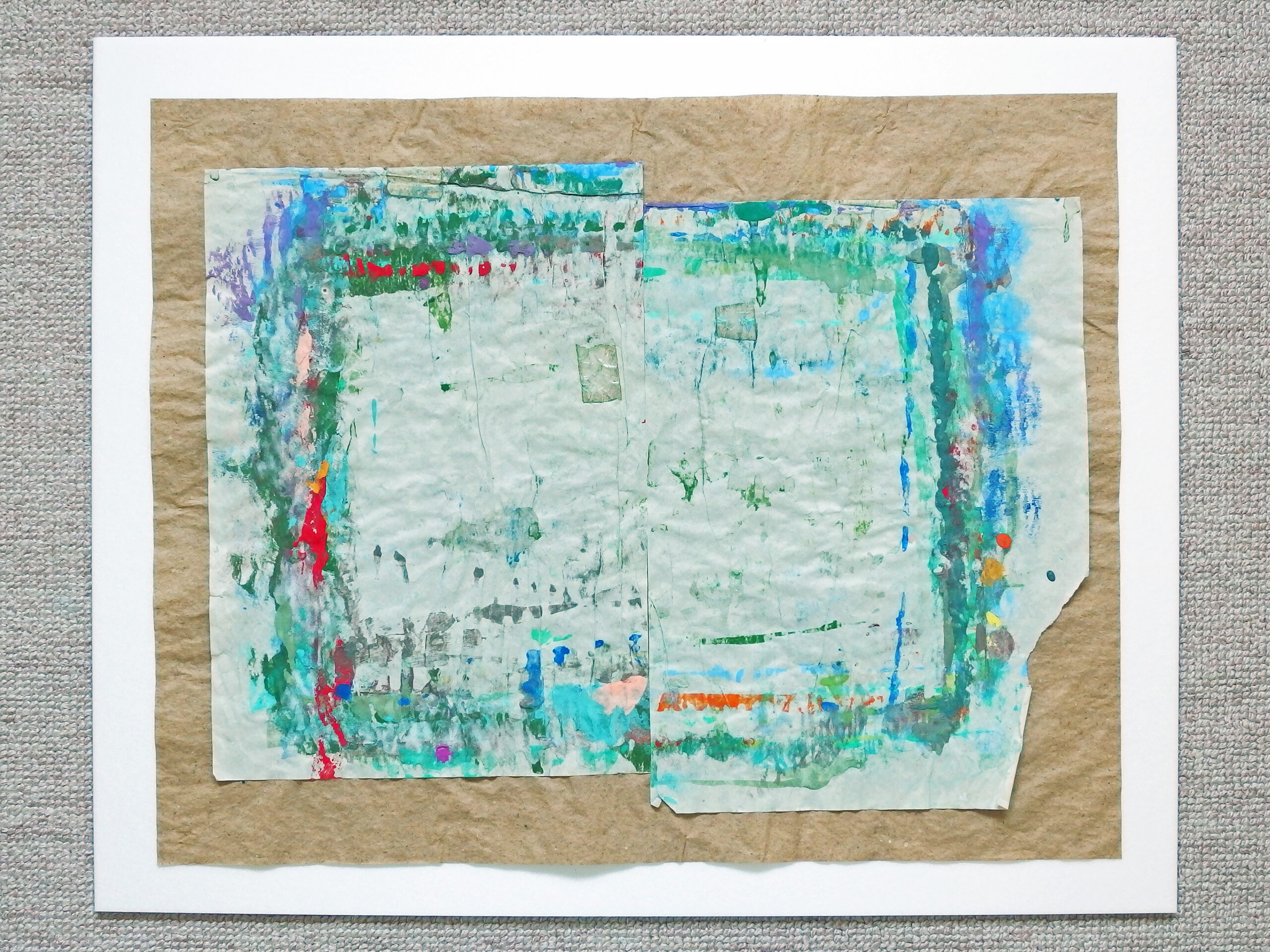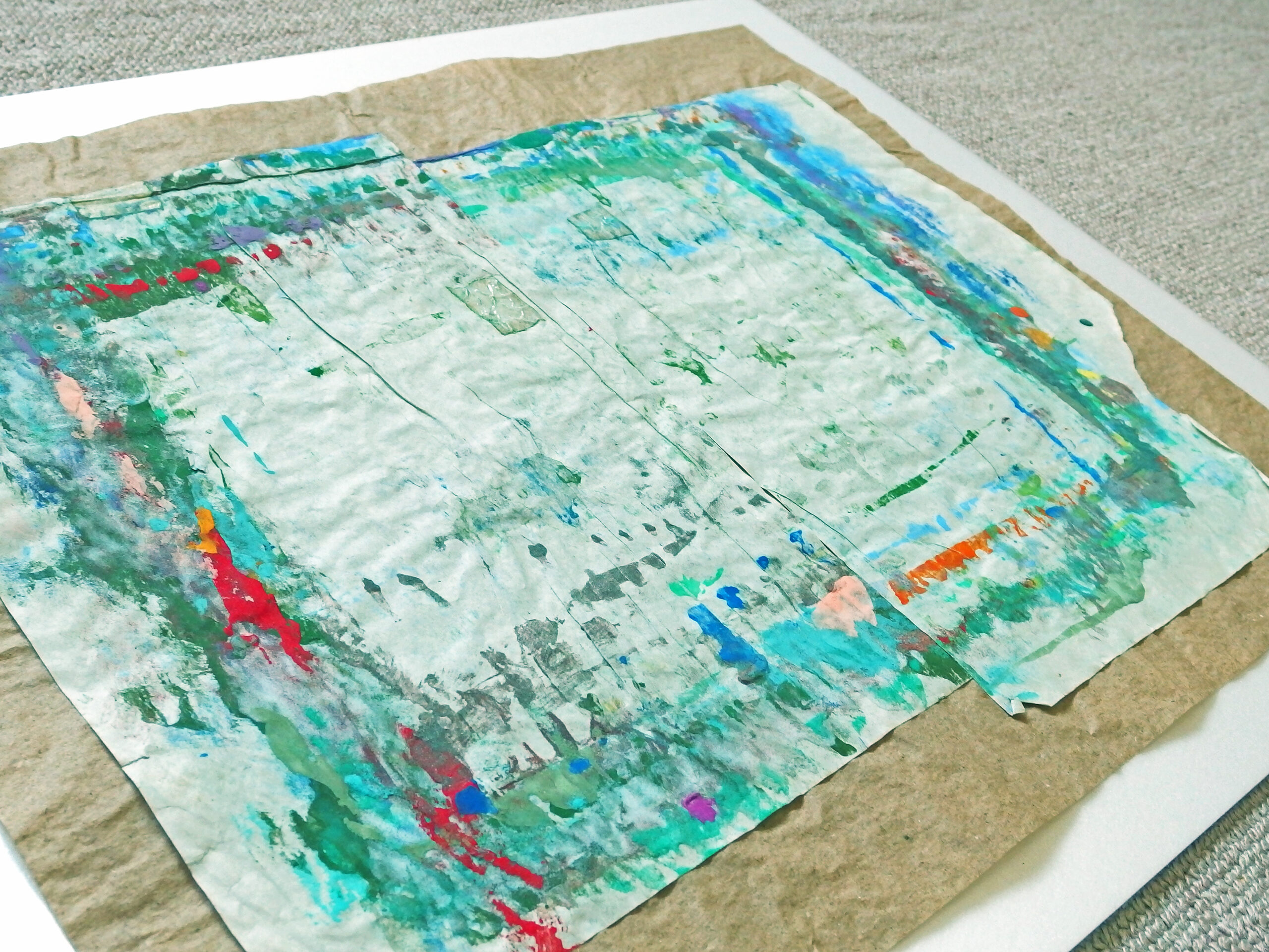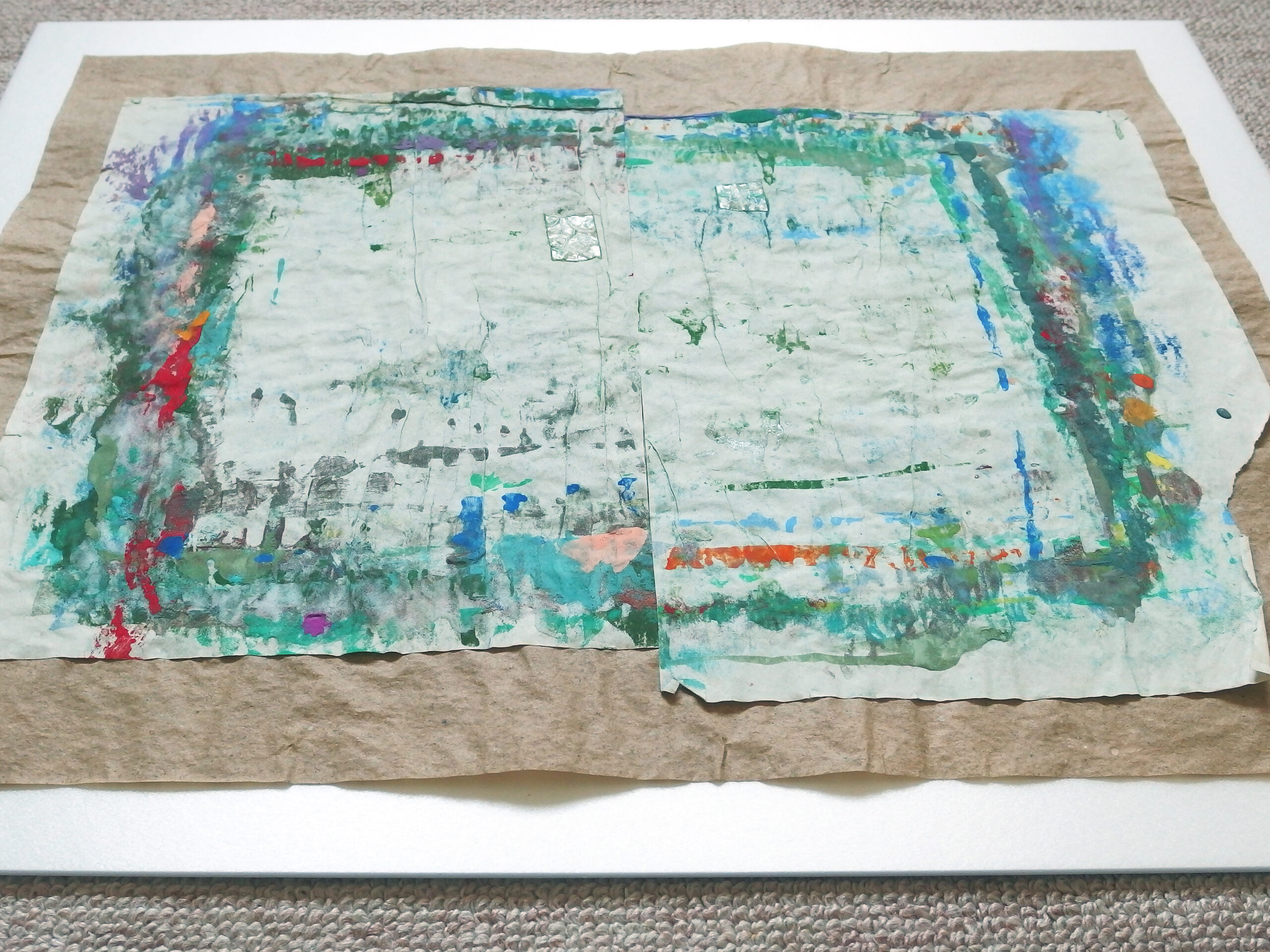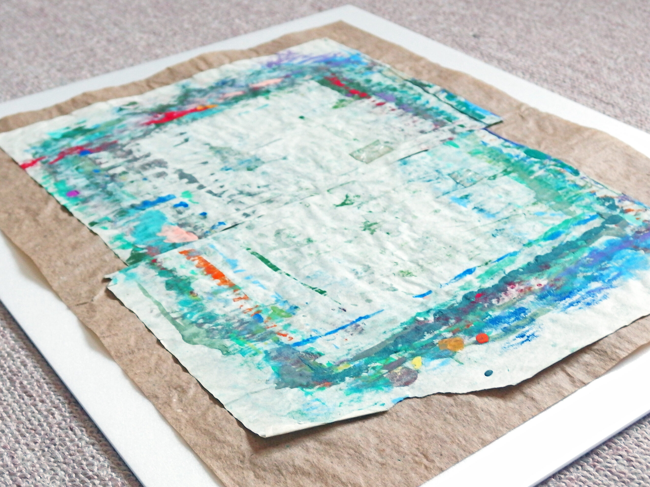 天然素材の和紙に膠を使うのが「日本画」の常識ですが、あえて人工素材を使っています。