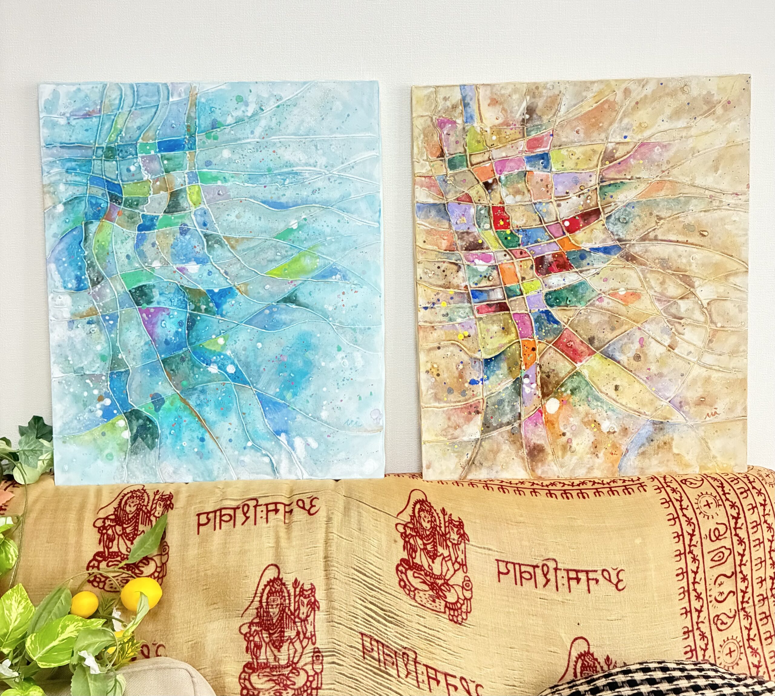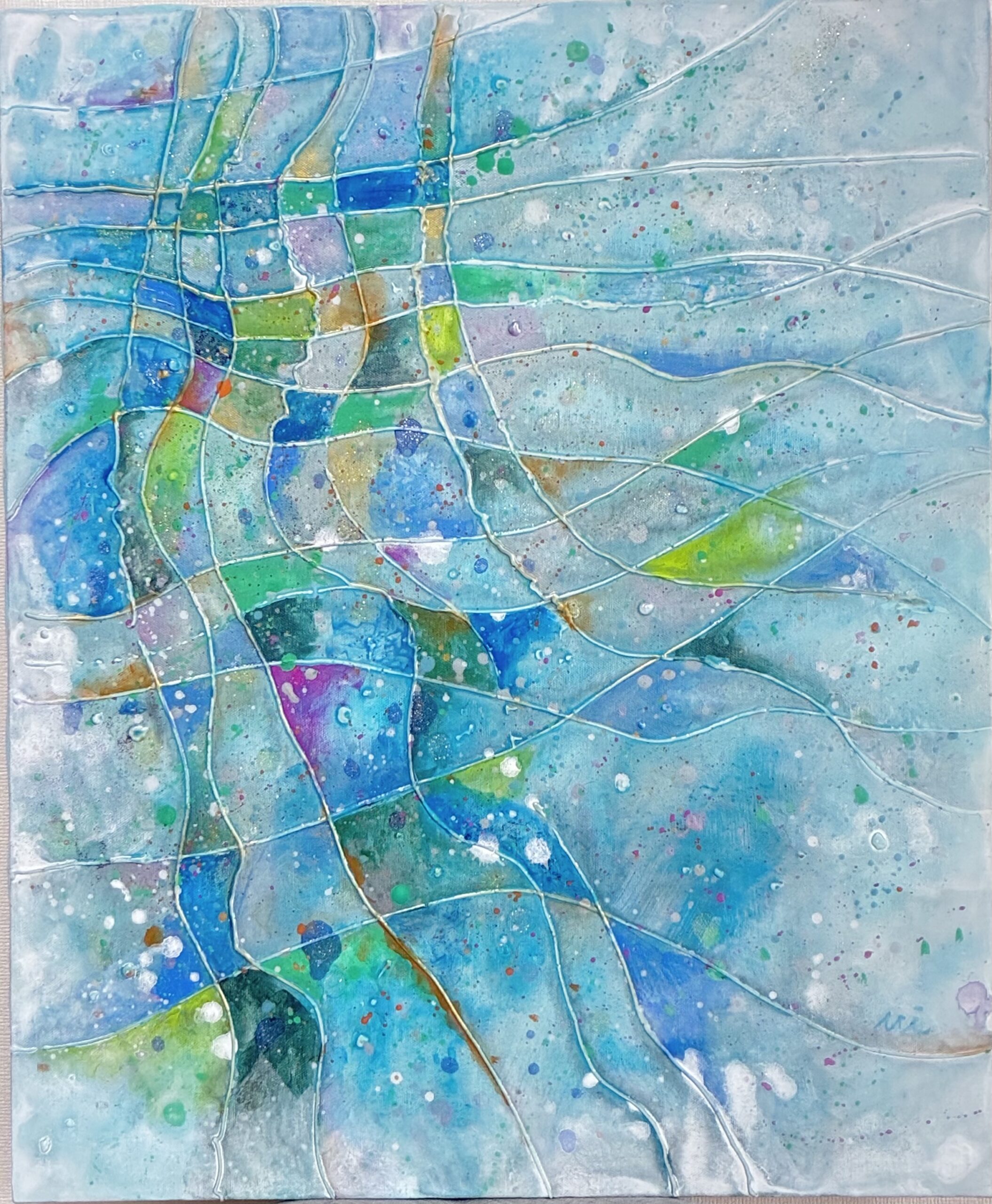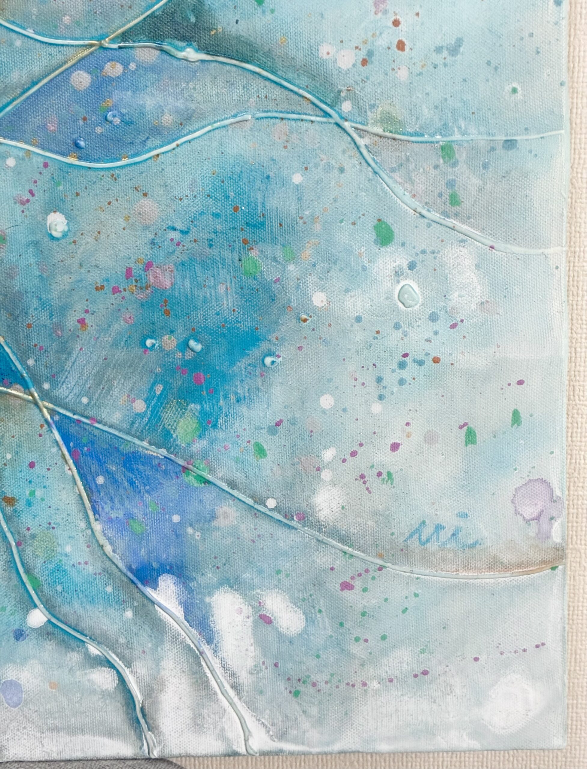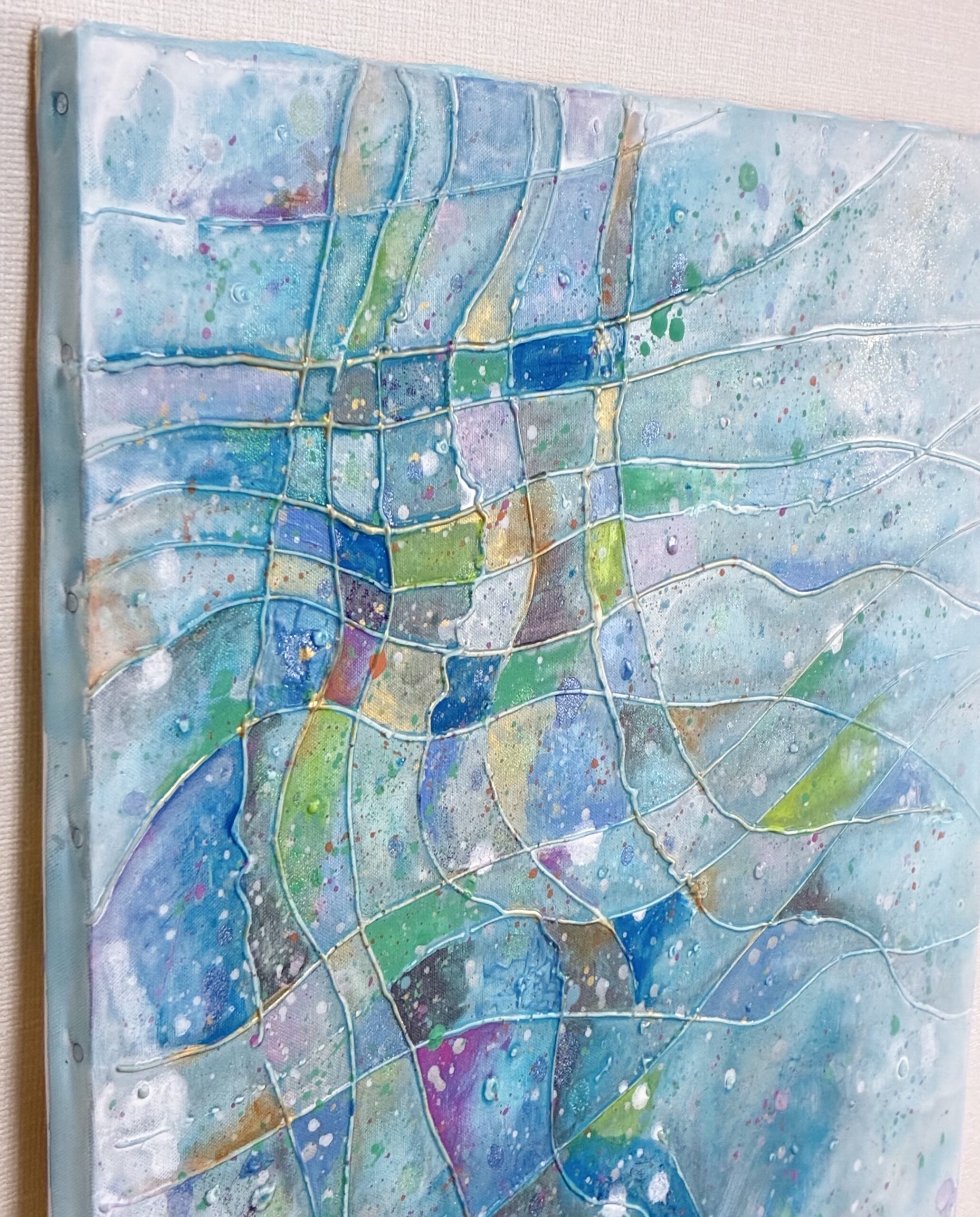 かがやく水面のように、さわやかな風のように。やさしいブルーと、さまざまな色がきらめく作品です。