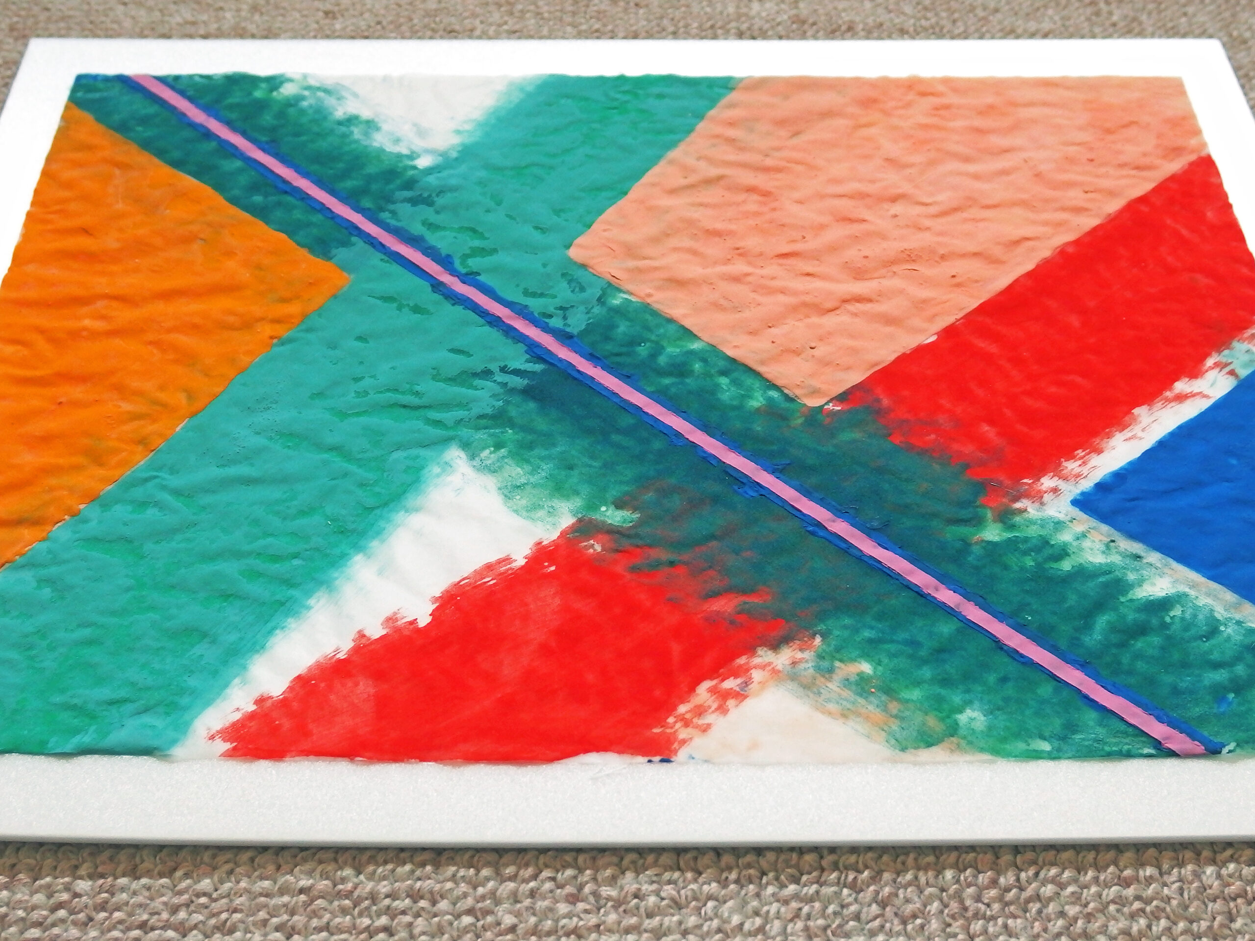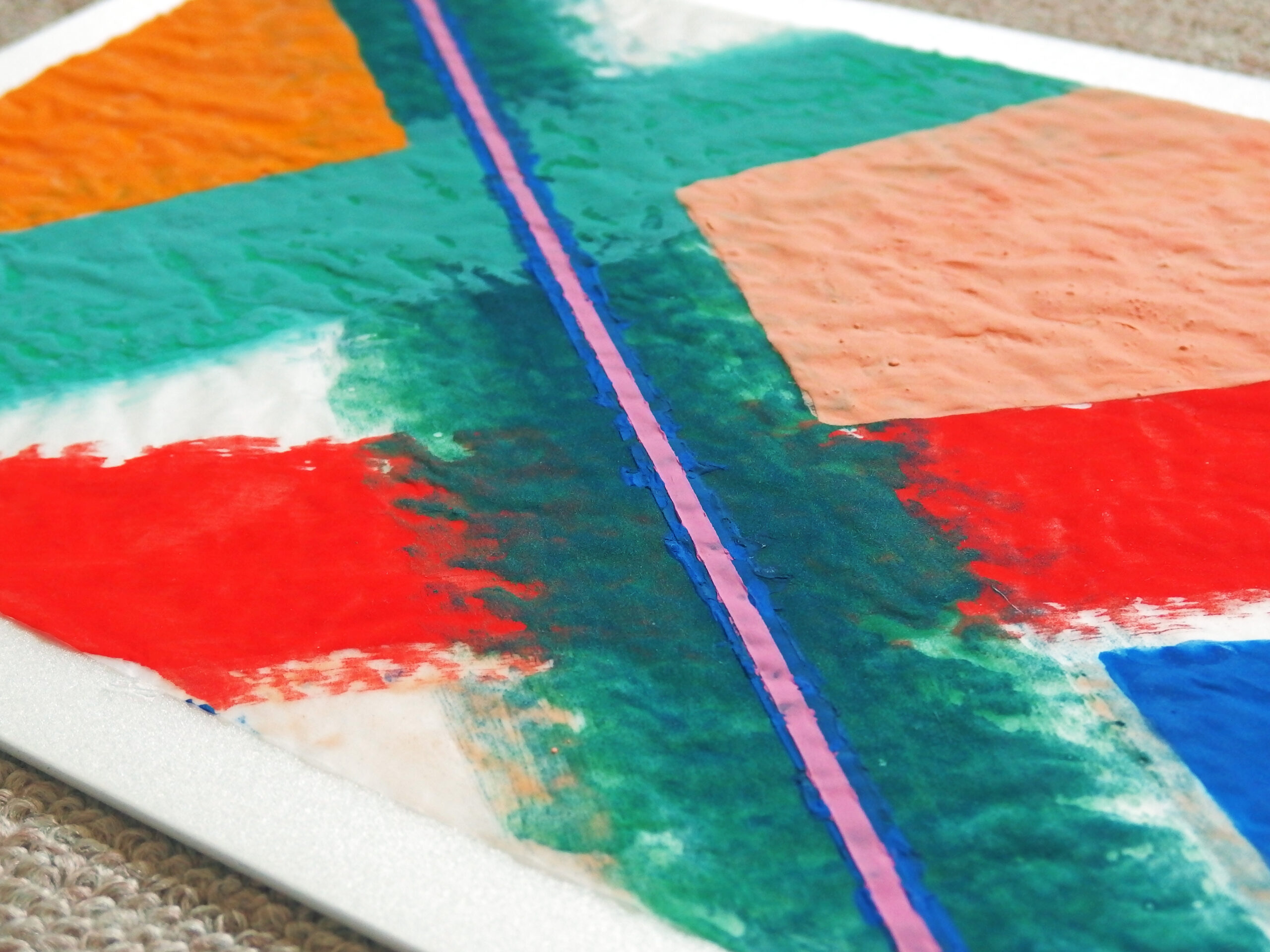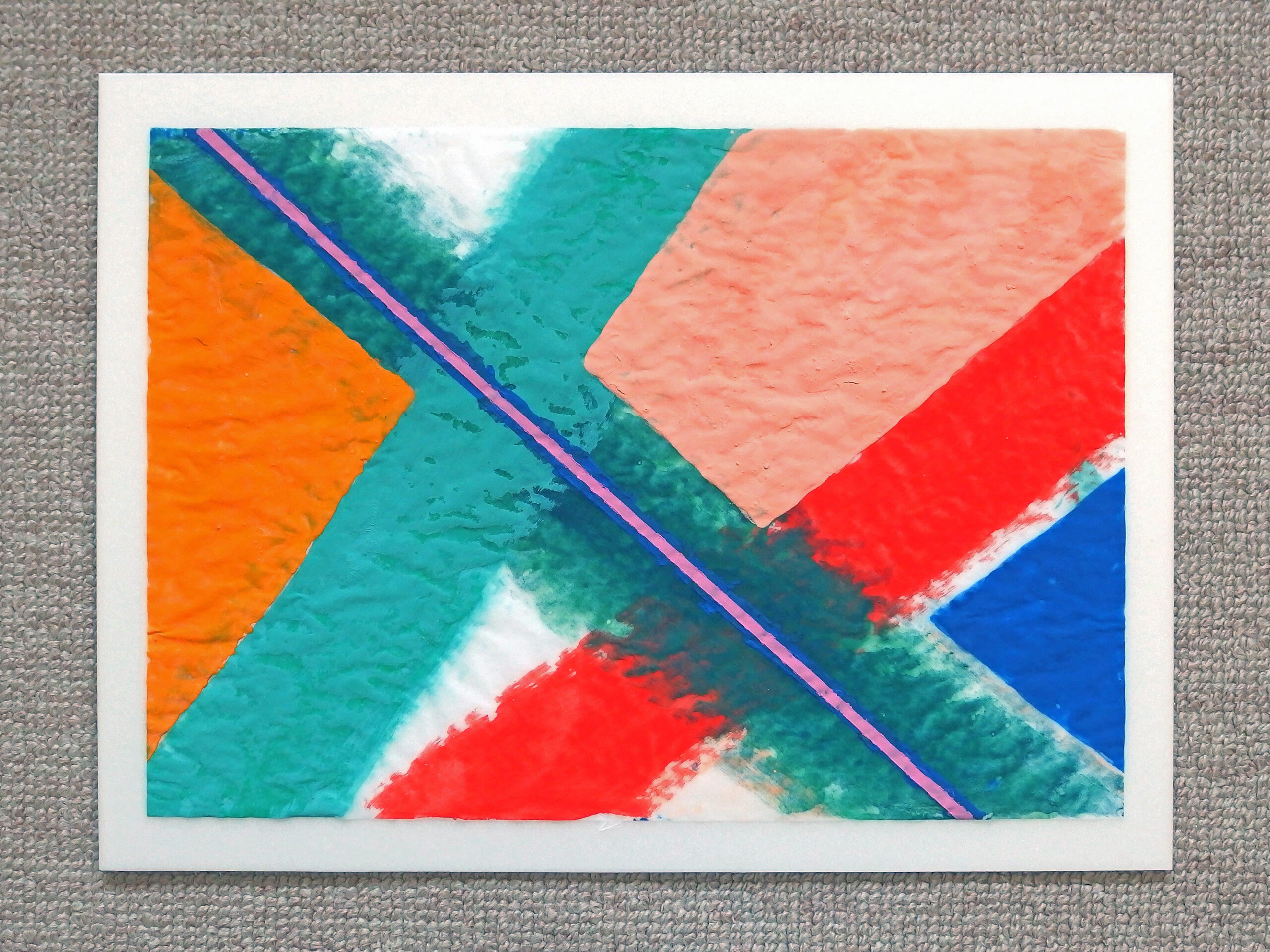 天然素材の和紙に膠を使うのが「日本画」の常識ですが、あえて人工素材を使っています。