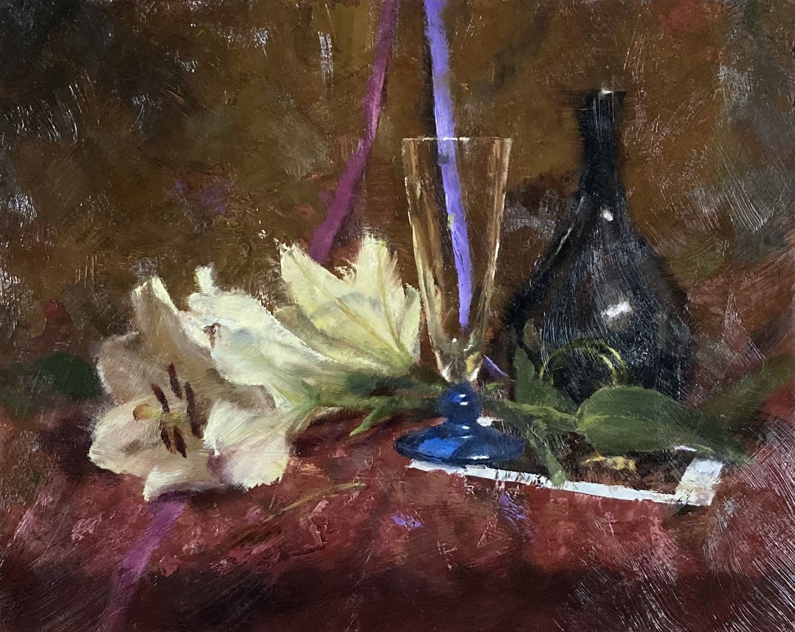 グラスを主役に静物を組んで描きました。それぞれのモチーフの質感の違いが絵に活気を与えてくれました。