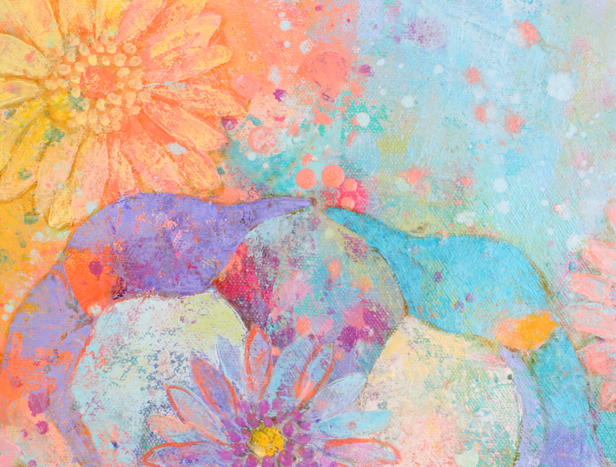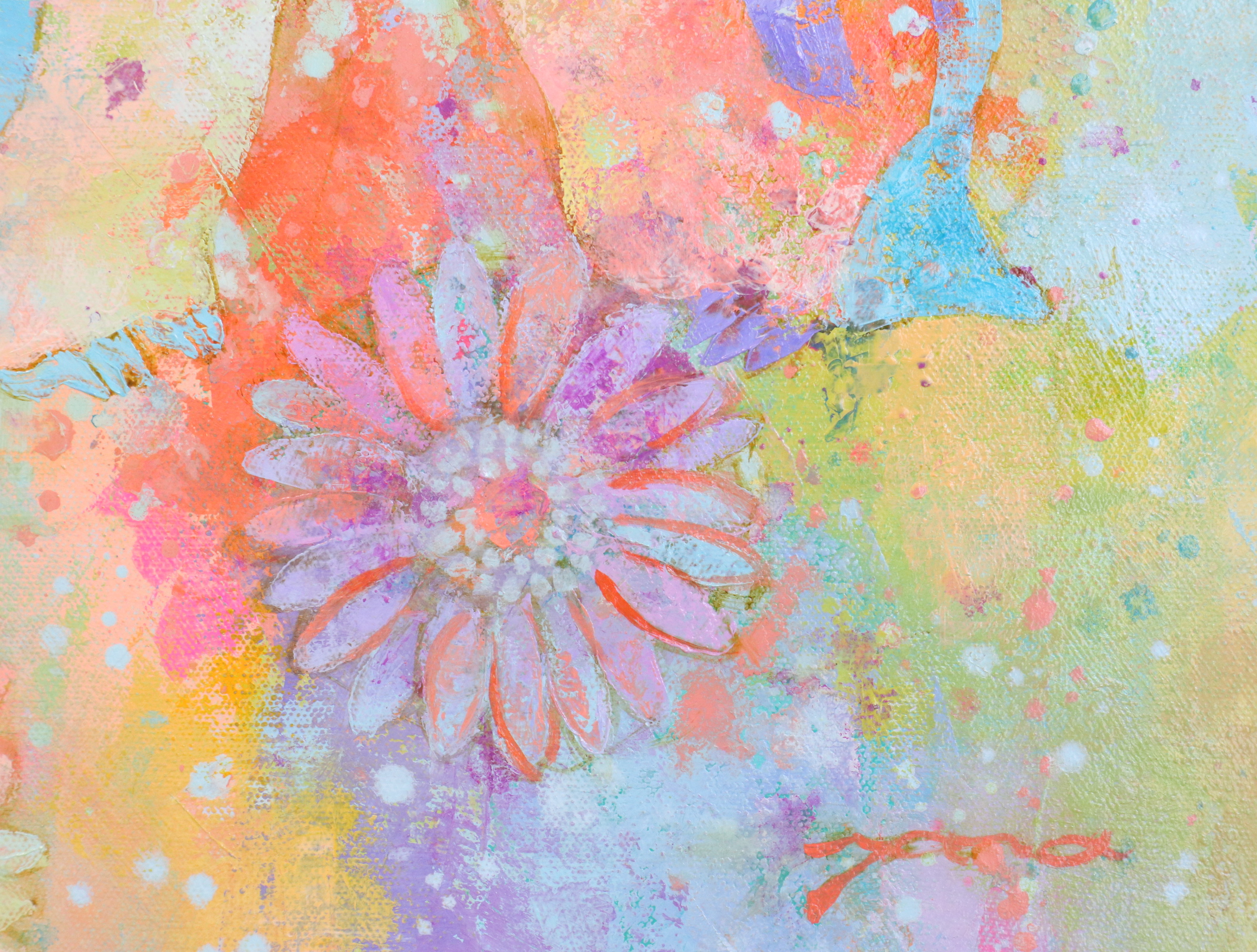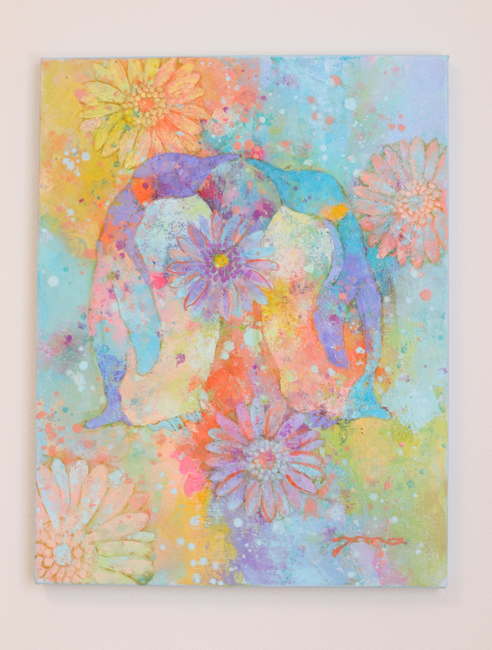 薄く溶いた油絵具を何層にも重ねて描き、最後にローラーを使い色を重ねて深みを出しました。色の重なりの美しさを感じていただけたら、嬉しいです。