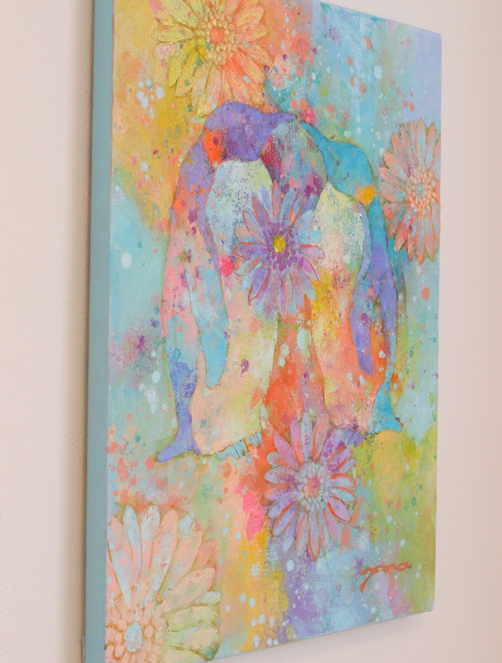 ペンギンのペアが決まった瞬間を絵にしました。ガーベラをあしらい幸せな雰囲気に仕上げました。
