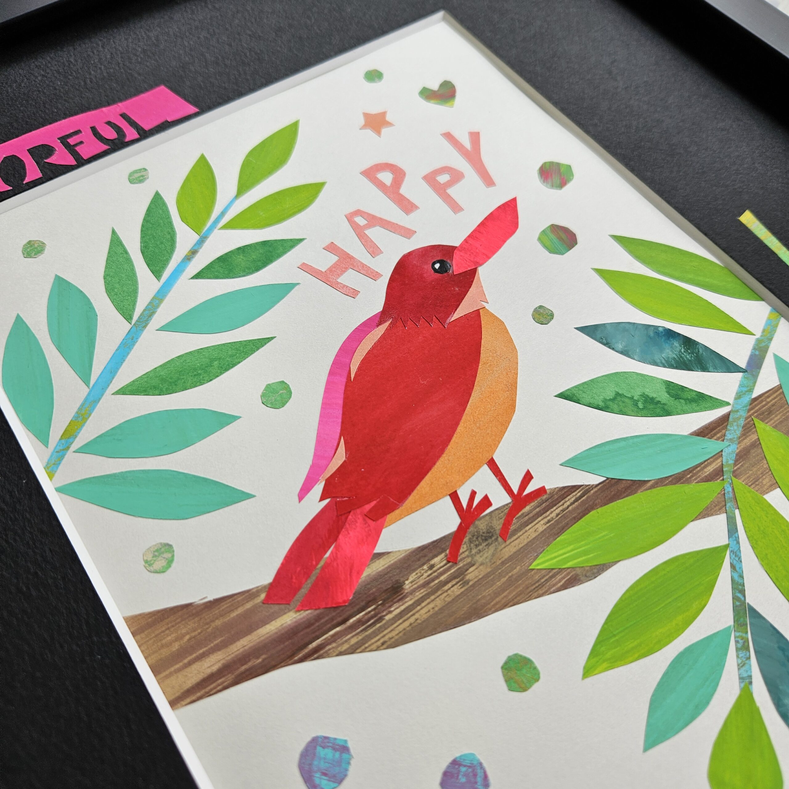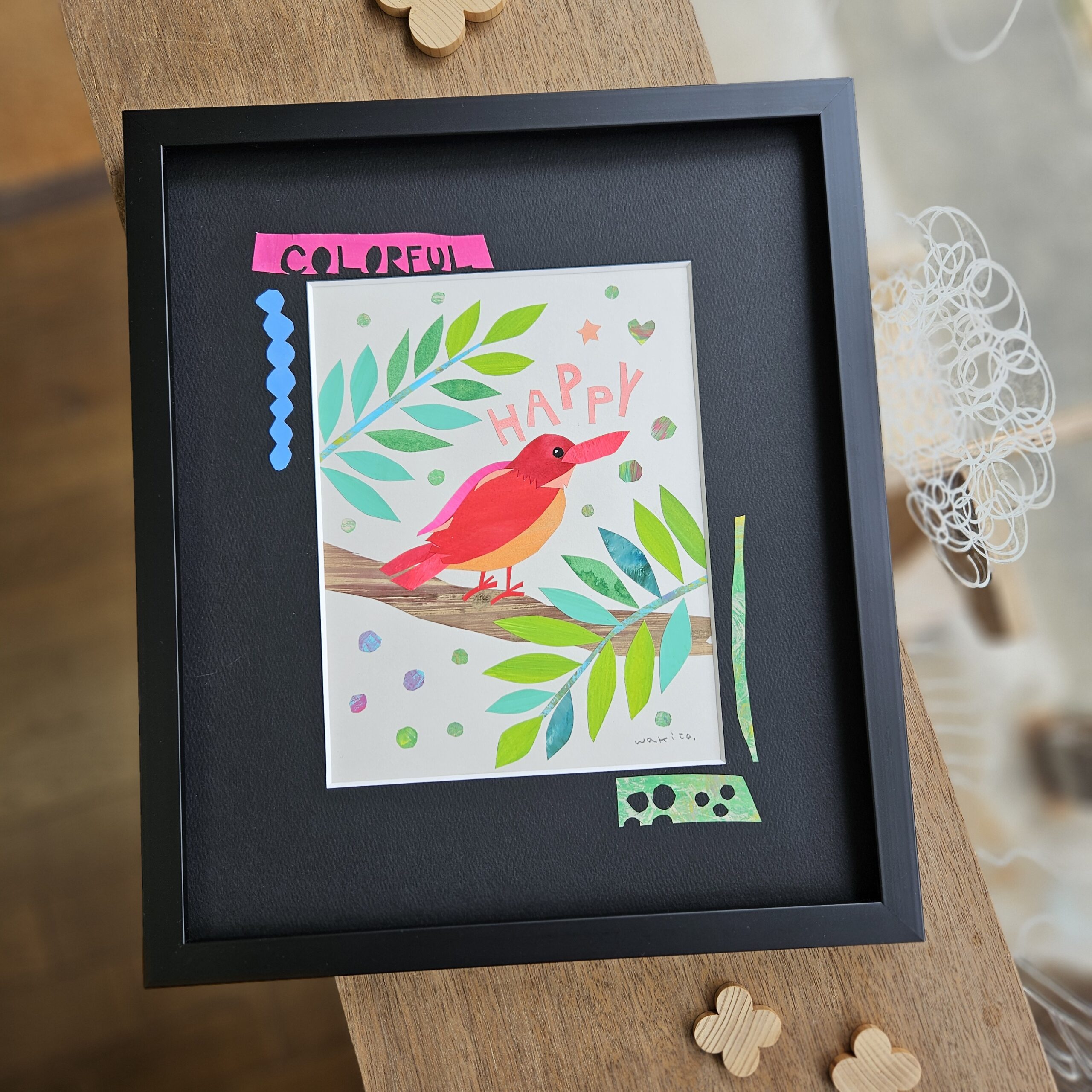 赤い鳥のアカショウビンをモチーフに制作しました。絵の具を紙に塗り、自分で色紙を作り、貼り絵で制作しています