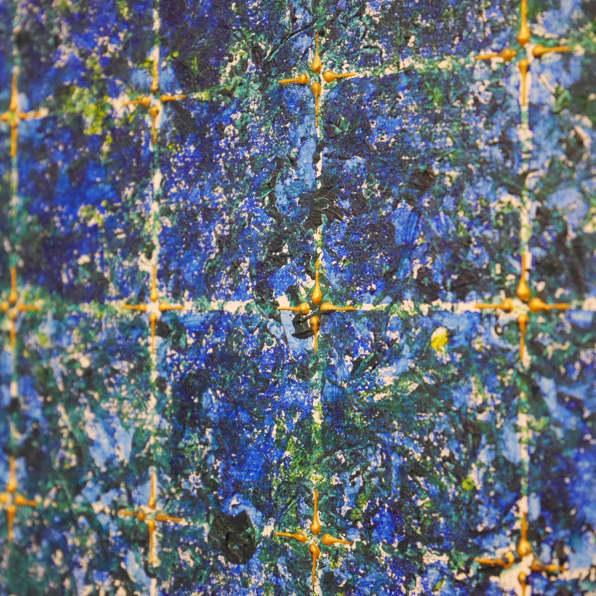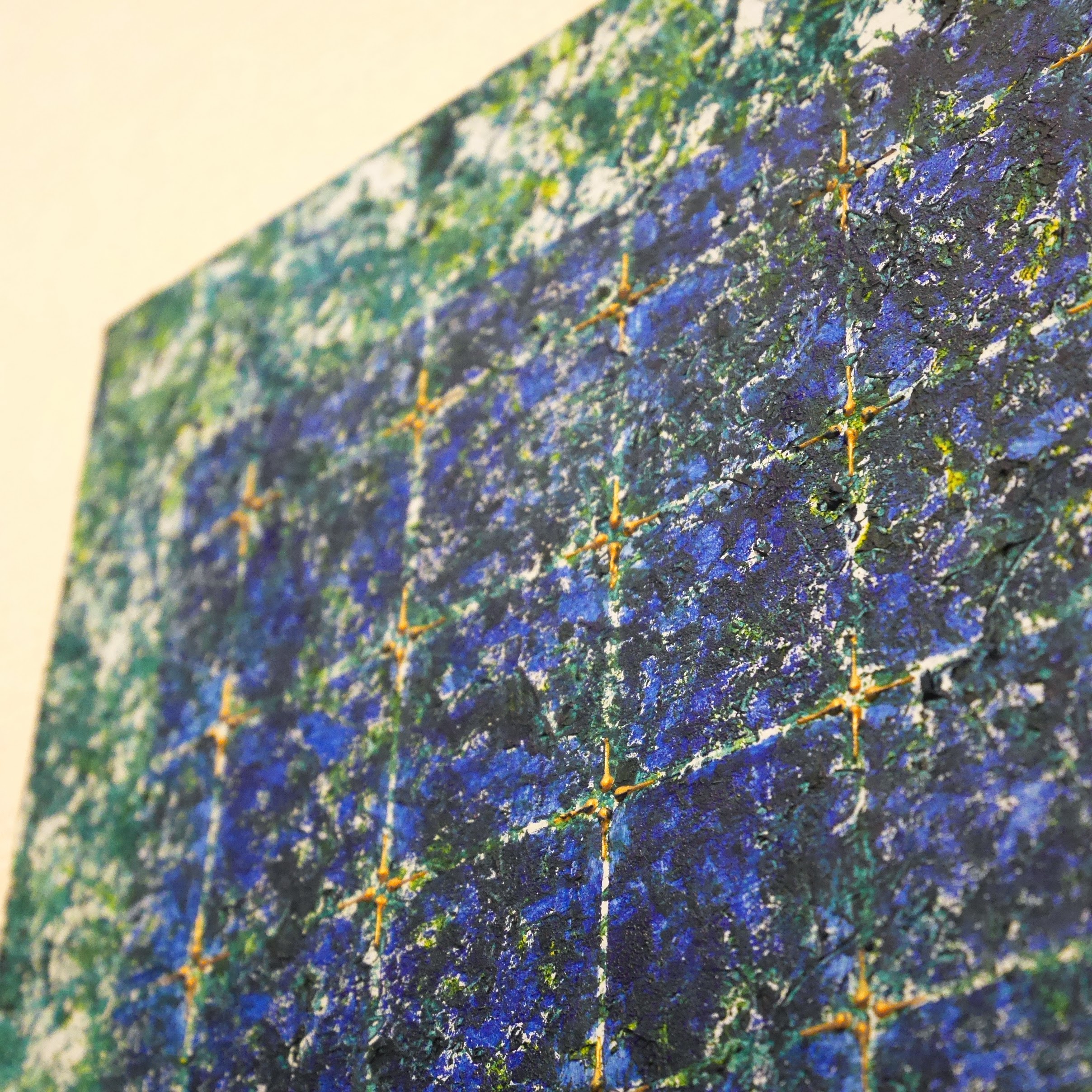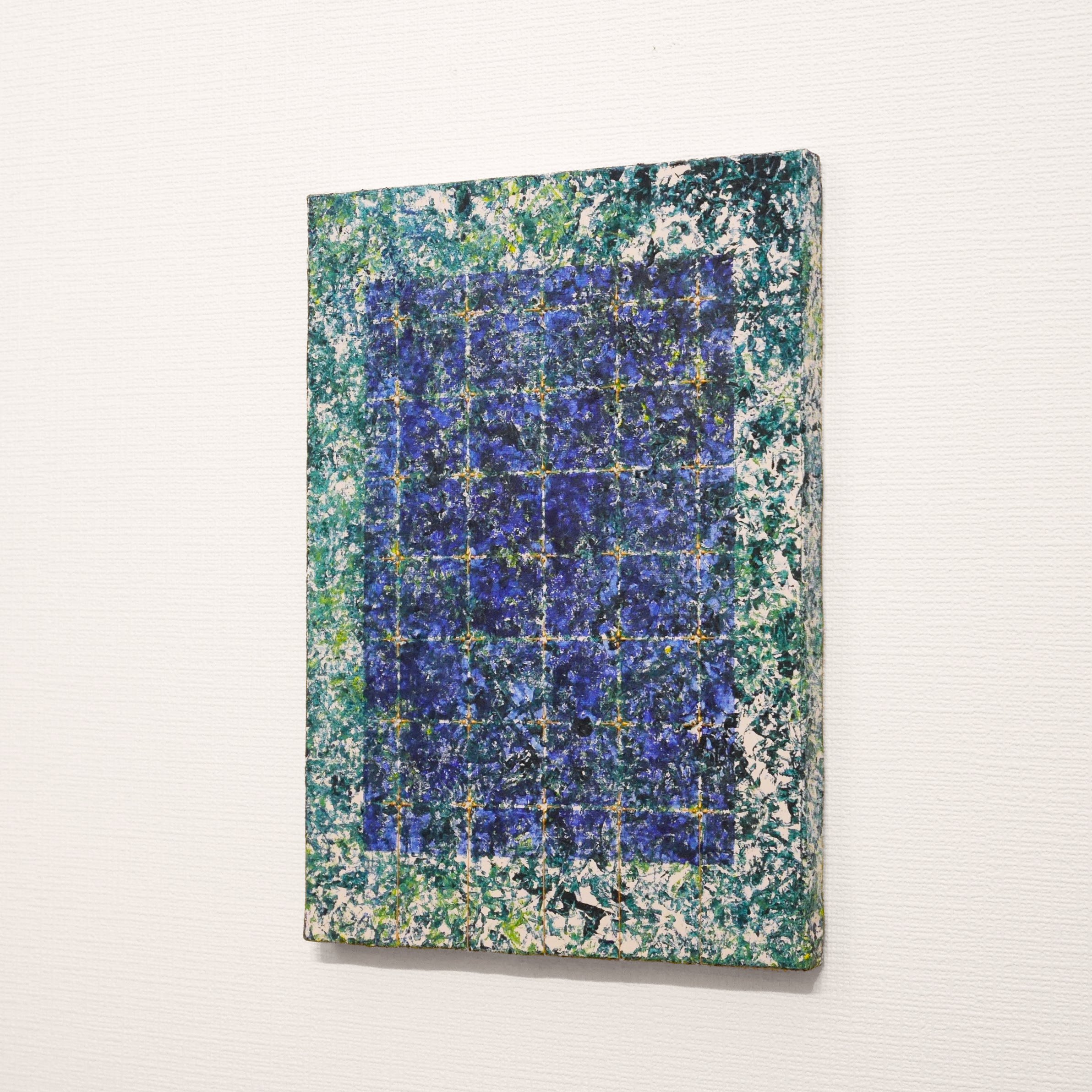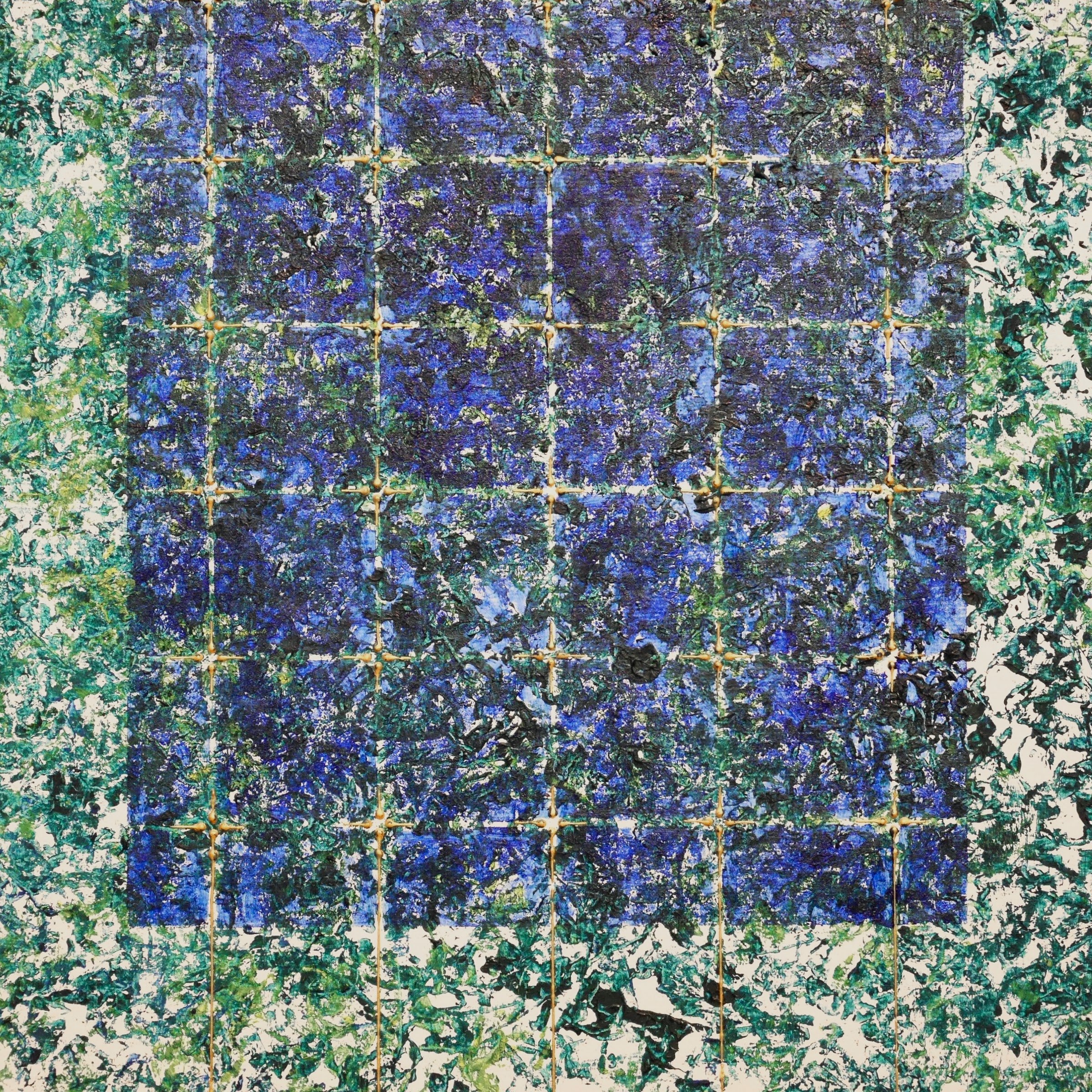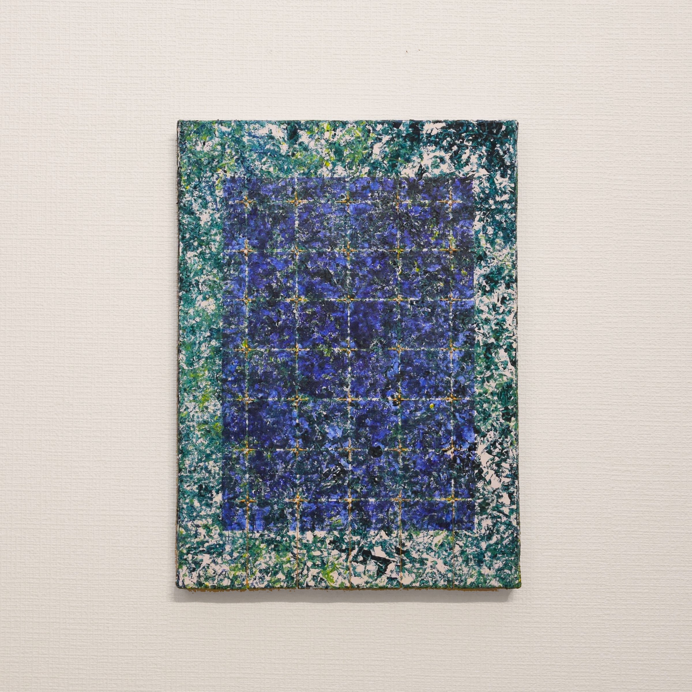 森の木々のようなランダムな油彩緑のなかに、グリッド状に整列されたガラスカーテンウォールの青色が佇んでいます。