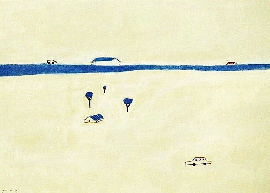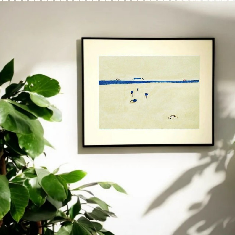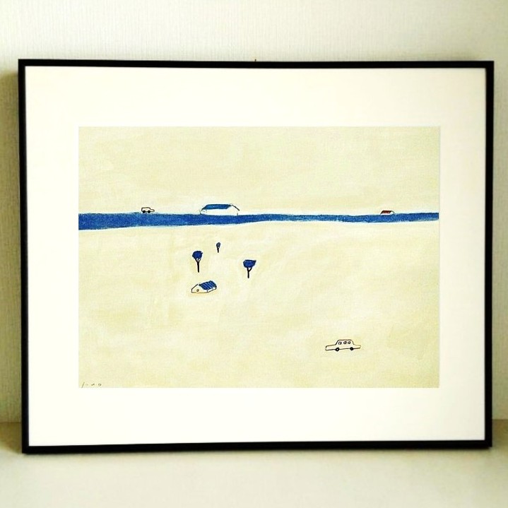 いつの日にか見た記憶の風景。そんな心象風景を描いた絵です。 ■size■ frame (348×424mm)  picture (240X330mm) 1200g ■額縁■ 【BH-03J】 アルミ製フレーム。 シンプルで都会的なイメージの額縁です。 紫外線カットのアクリルガラスが入ります。 ※かぶせ箱入り ■素材■ 和紙にアクリル絵の具、水彩色鉛筆、ペン、水彩絵の具