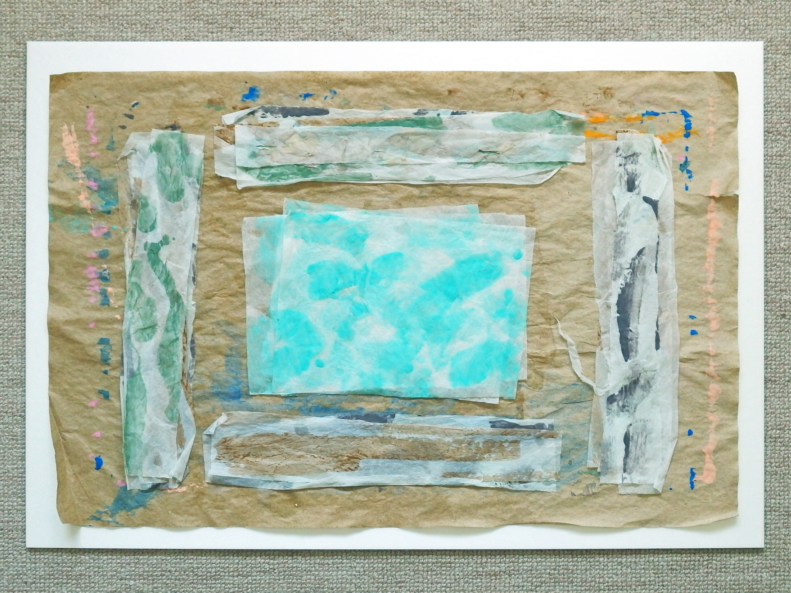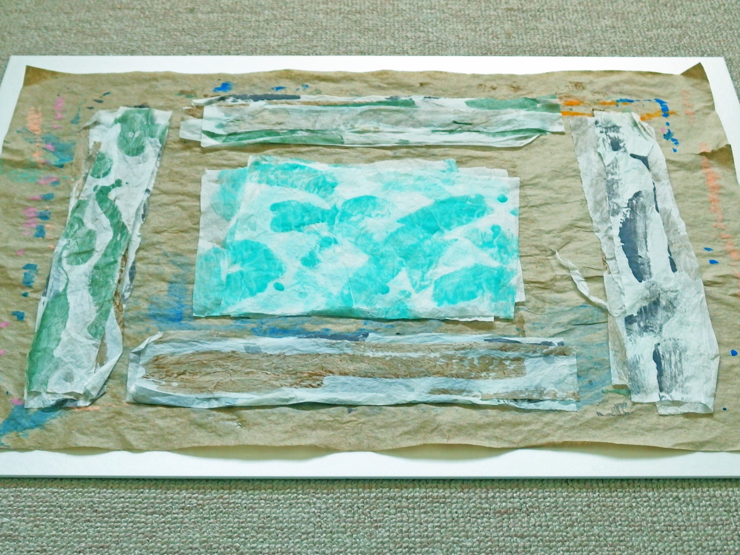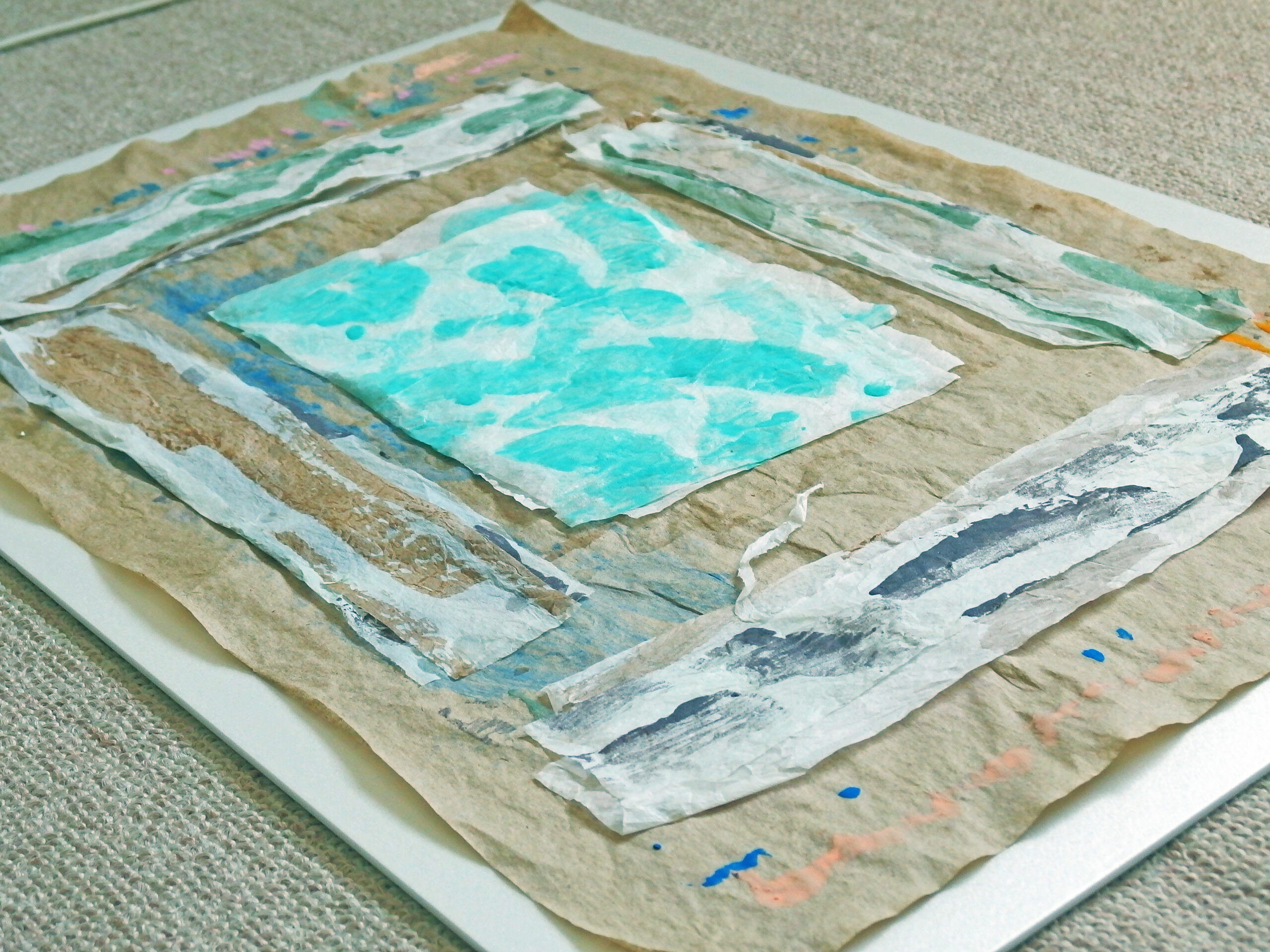 天然素材の和紙に膠を使うのが「日本画」の常識ですが、あえて人工素材を使っています。