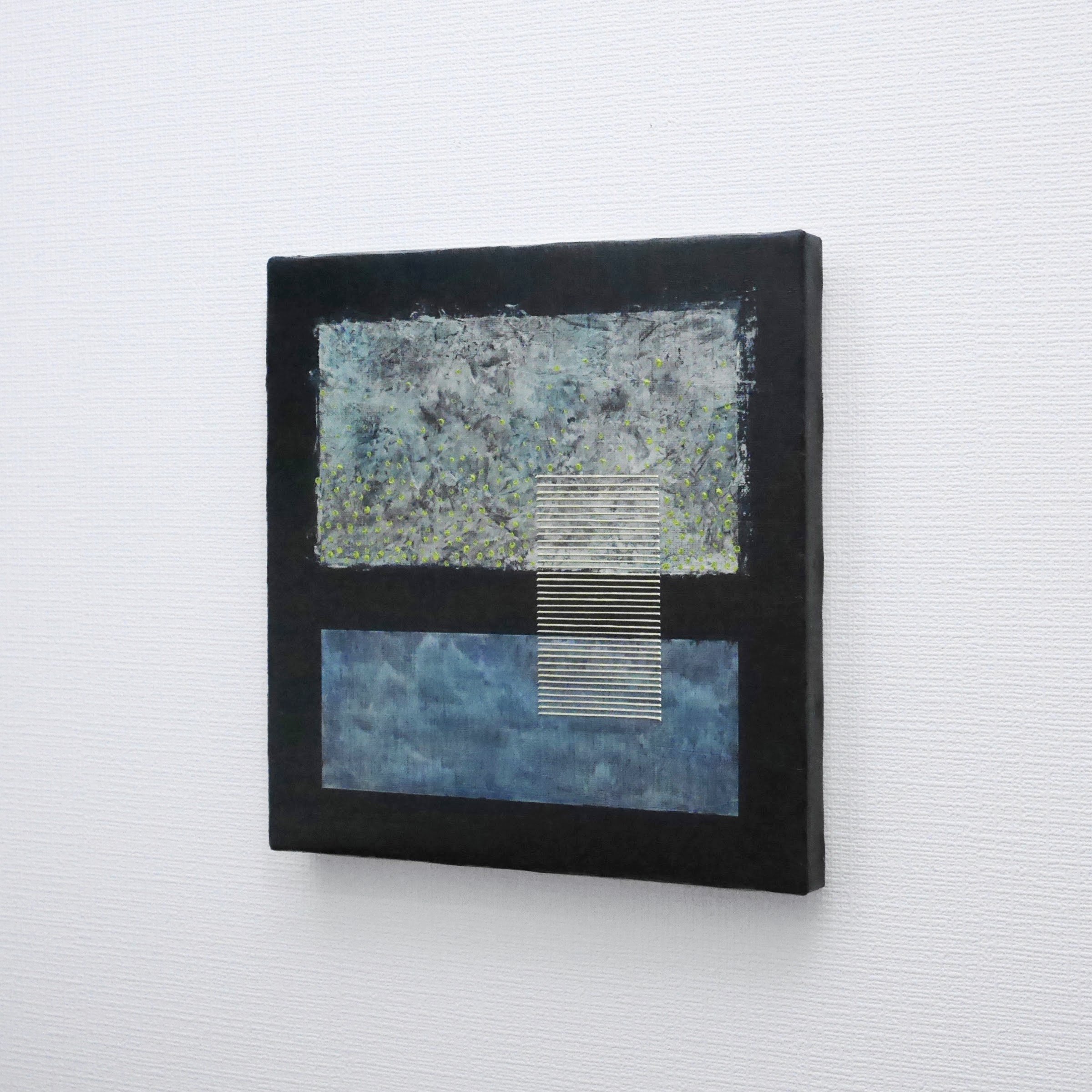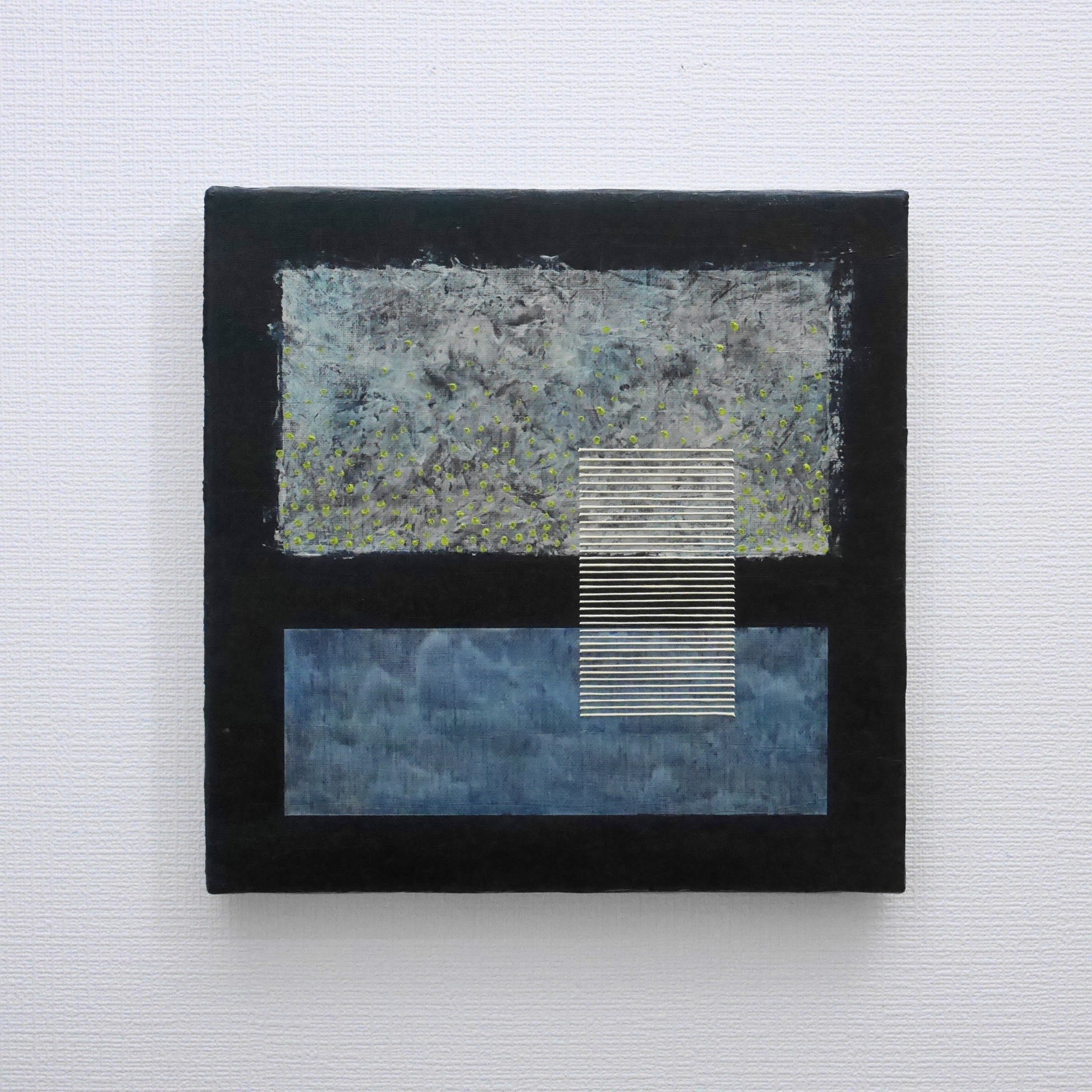その間をかけ渡る金色線描は、やや凹凸感をもって描かれているため、作品は光環境によって印象がコロコロ変わります。