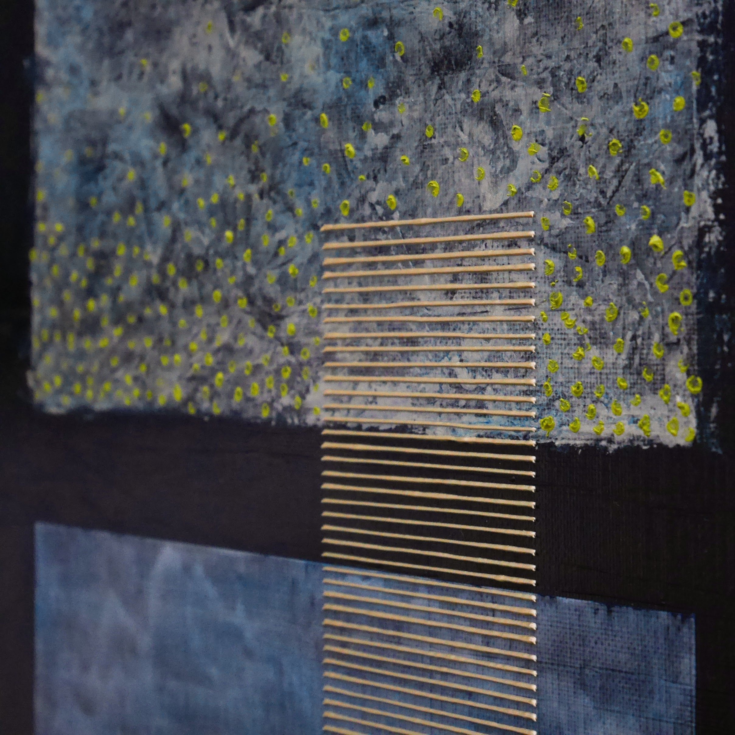 濃紺色の背景に2色の金属色図形と金色による線描画のコンポジション作品です。