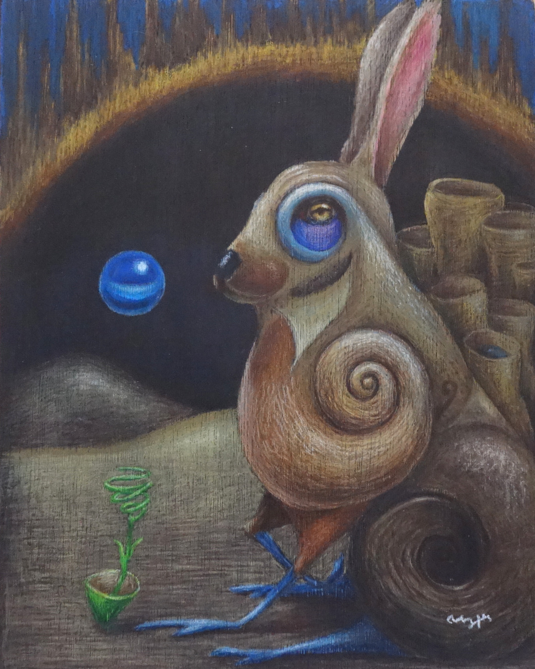木製の板に墨で下地を作った上に色鉛筆で描いています。木目が演出する不思議な雰囲気。