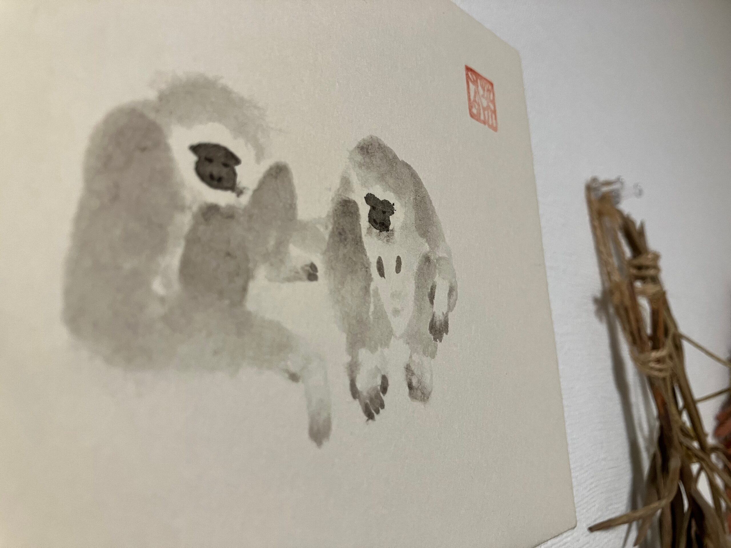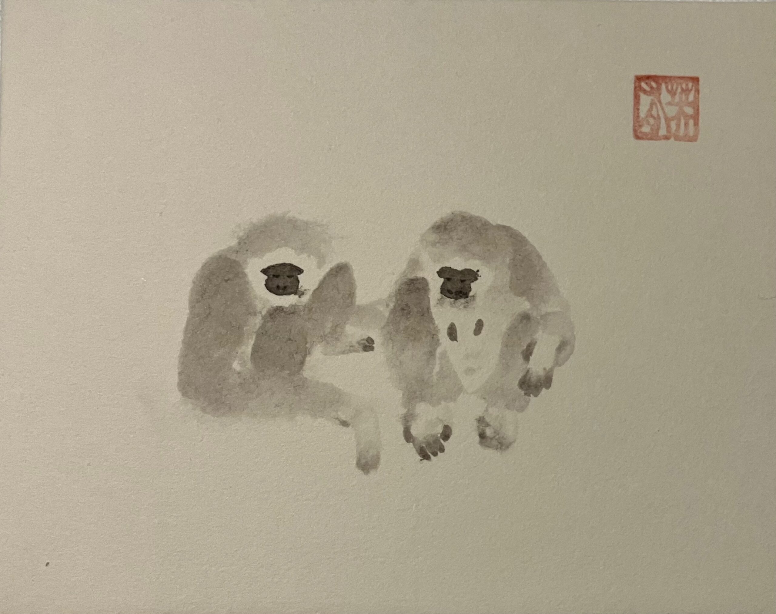 シロテテナガザルの親子を描きました。絵を描いているといつも覗きにきてくれます。じいっと見つめてくるきょうみありげな様子がポイントです!