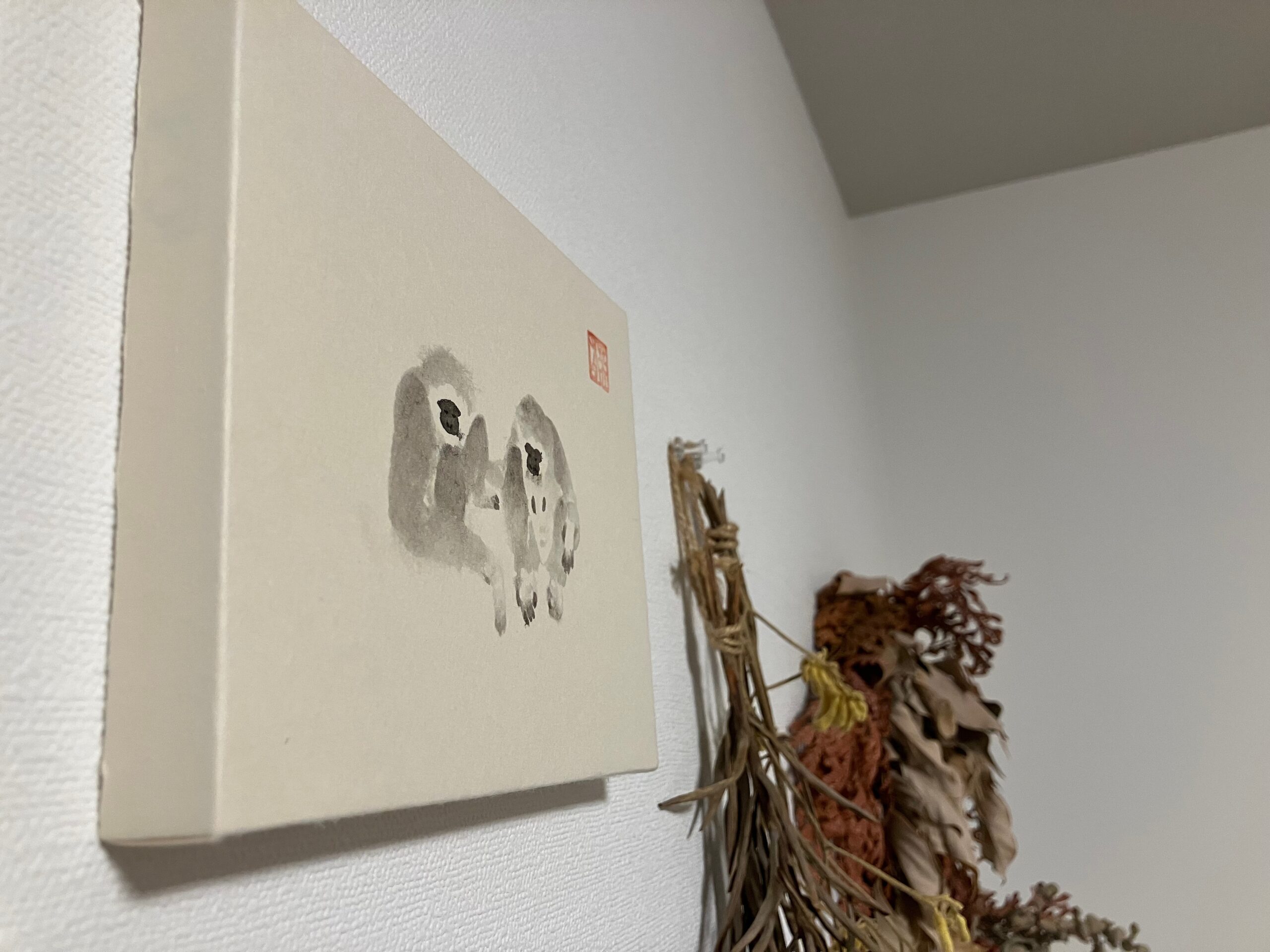 小さなパネルです。押しピンを壁に刺して、木の枠をピンに引っ掛けることで簡単に壁に飾ることができます。汚れが気になるようなら額屋さんにお好みの額縁をつけに行っても素敵です。