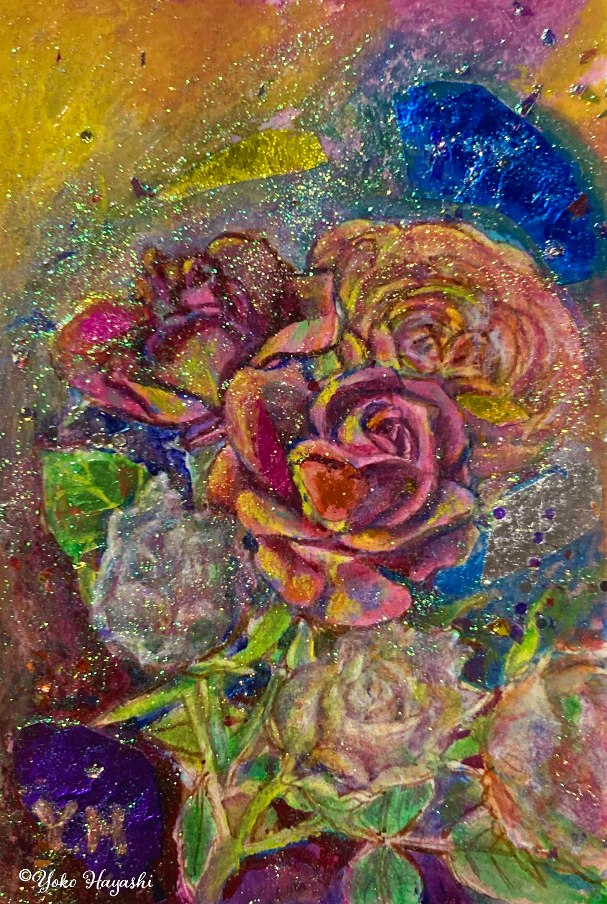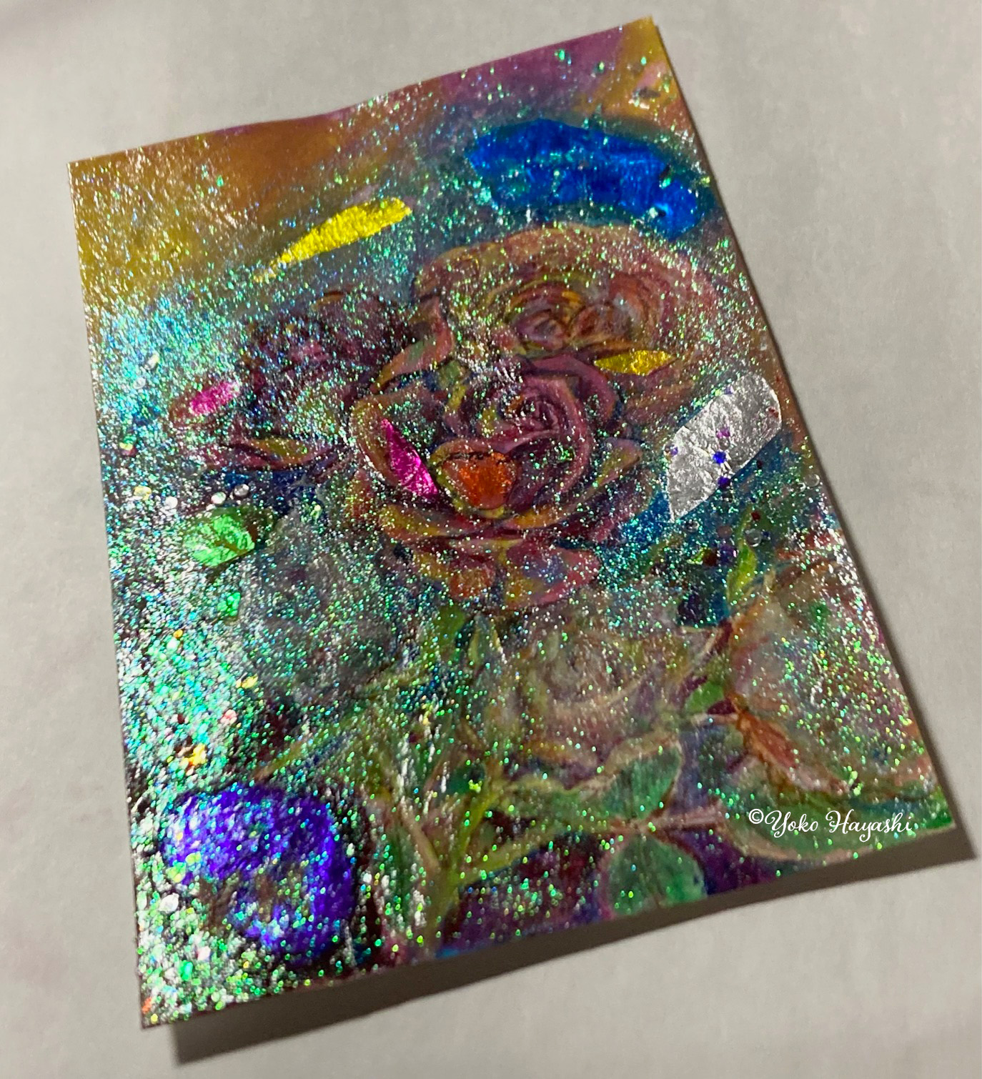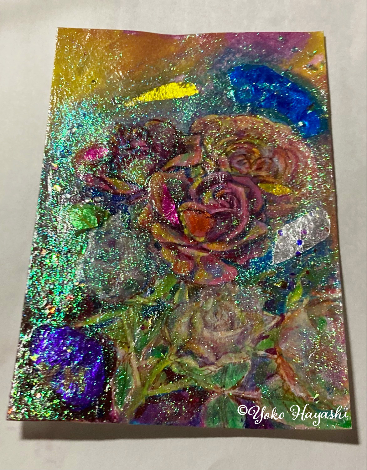 画面構成は、一番目立つシンプルな形のアリシアに目が行くようにアクリル絵の具とメタリックな色紙やグリッター素材をコラージュしつつ、冬の清らかな空気と賀正の荘厳な慶びを表現した。