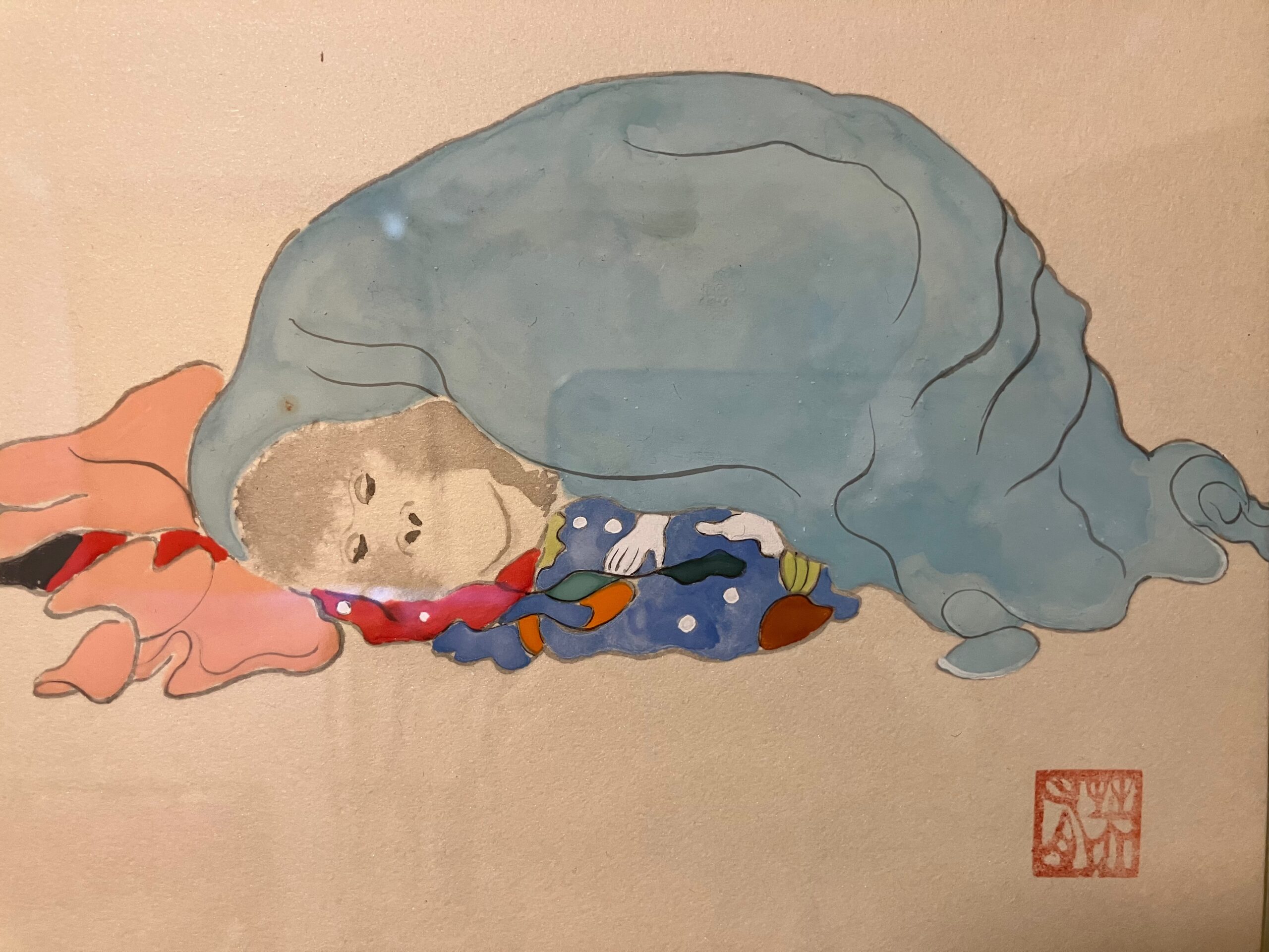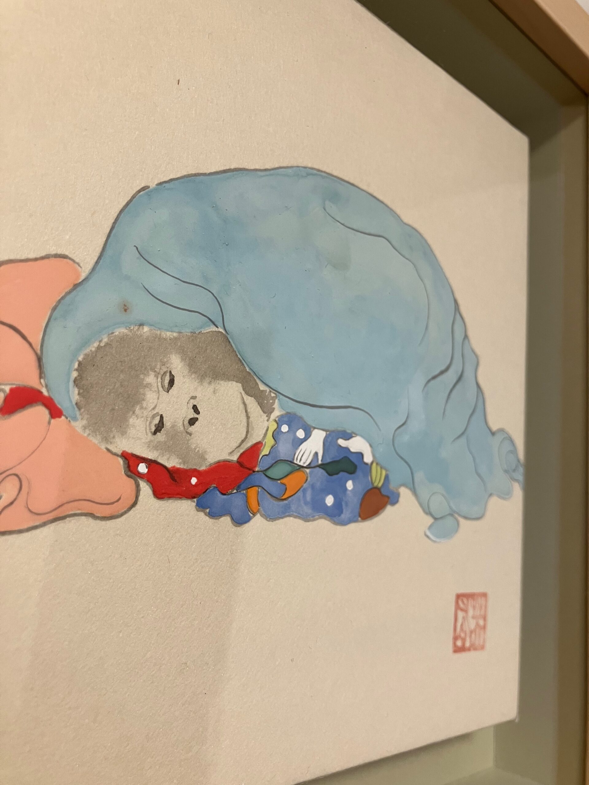 オランウータンを描きました。自分で毛布持ってくるまっている姿が愛らしいです。寒い日は本当にずっと寝ていますね。カラフルな毛布がポイントです!