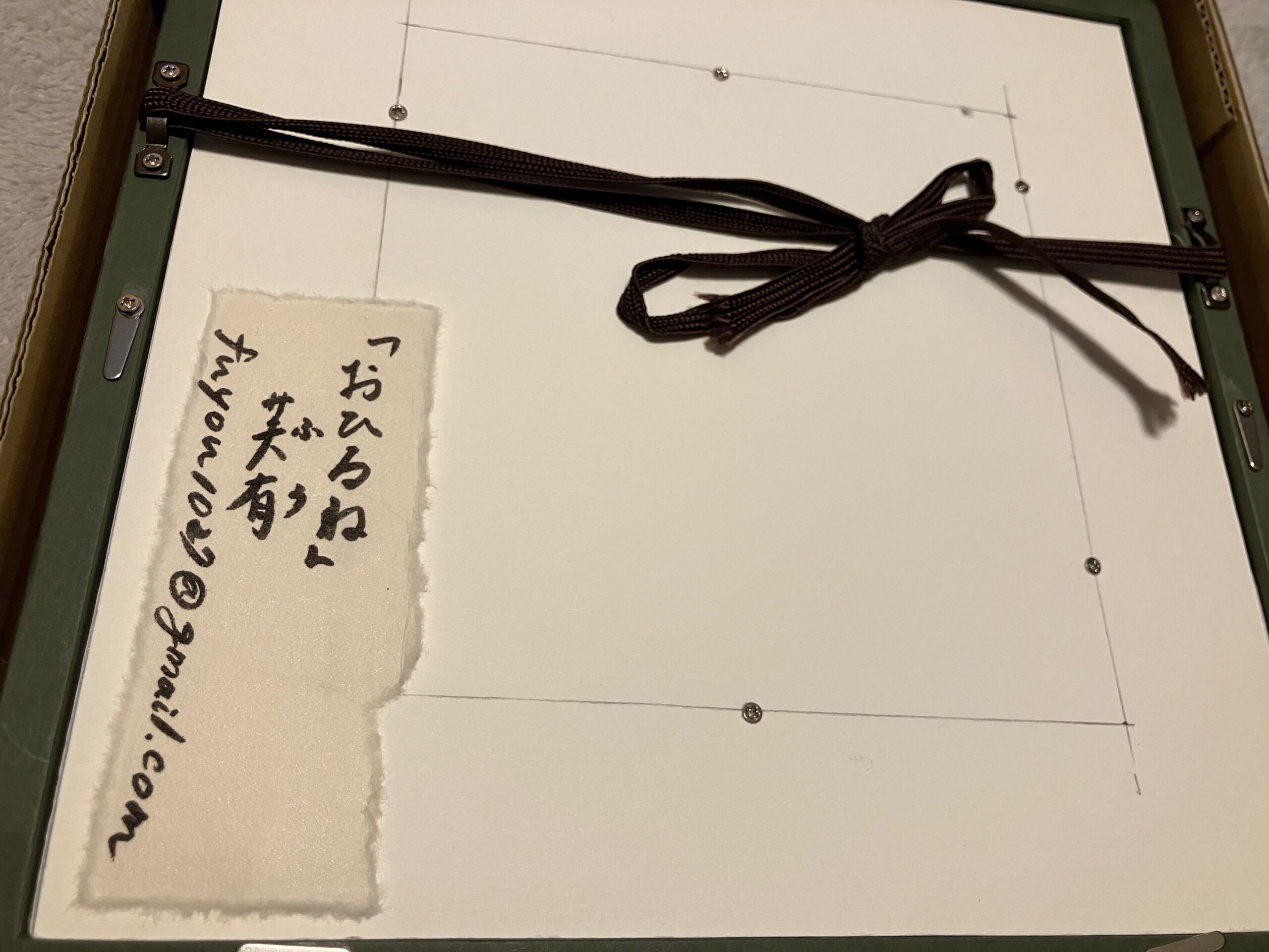 作品表面に落款あります。作品裏面、額の木の板を外していただくと、タイトル・名前記載あります。