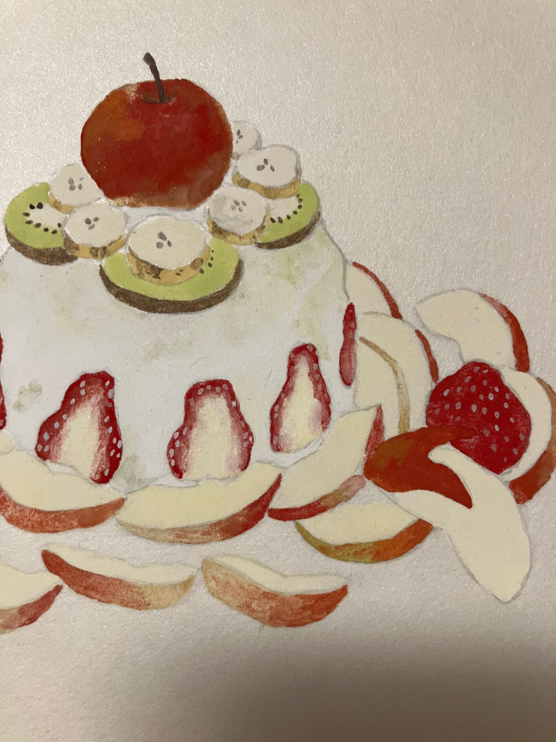 オランウータンのクリスマスケーキです。リンゴが大きくてインパクトがありました。リンゴのウサギがいるのがポイントです!