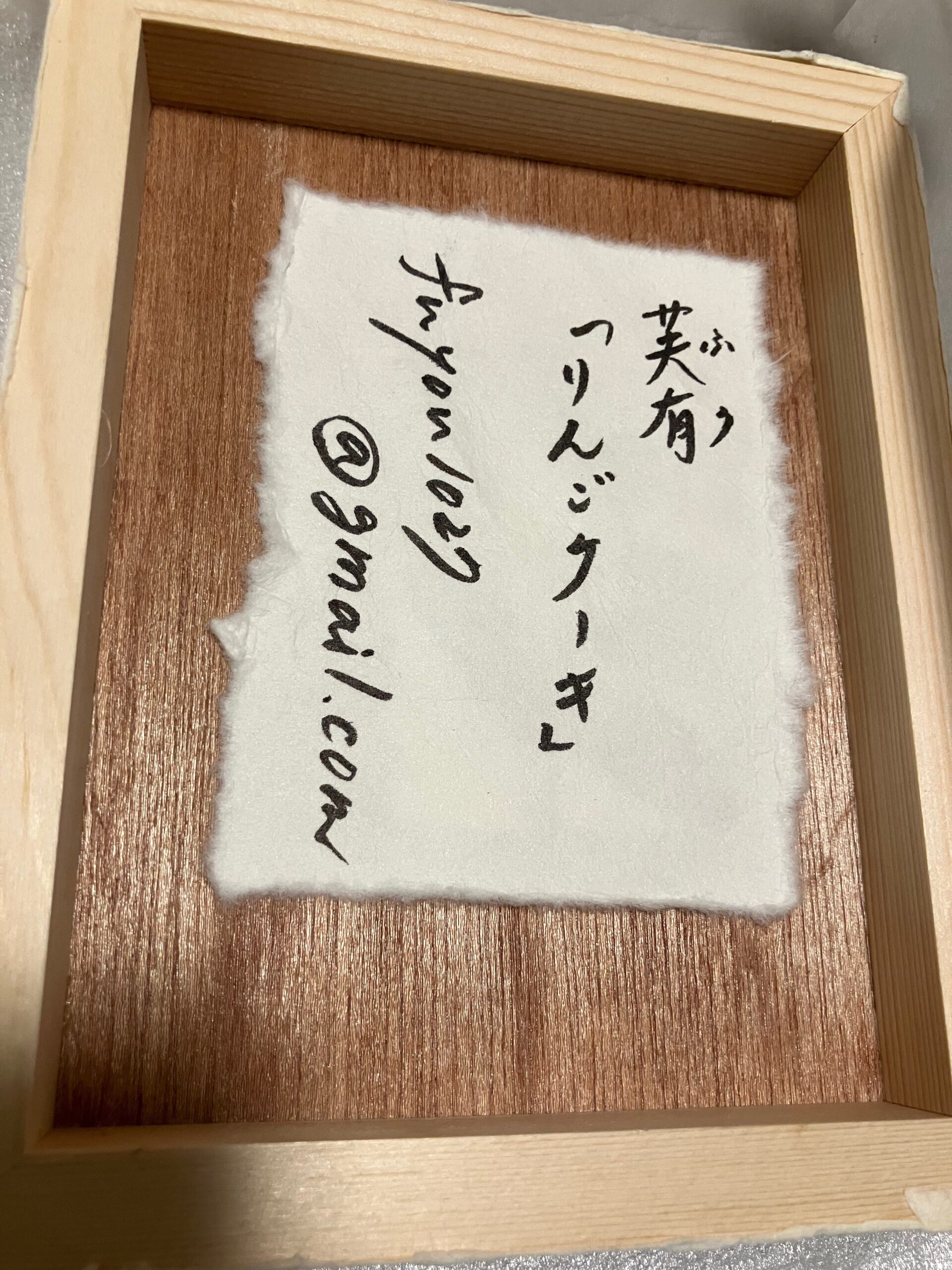作品表面に落款あります。作品裏面にタイトル・名前記載あり。
