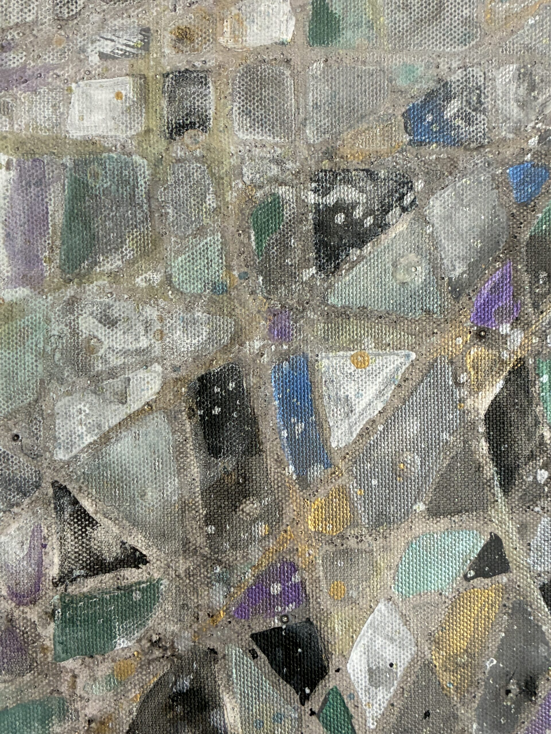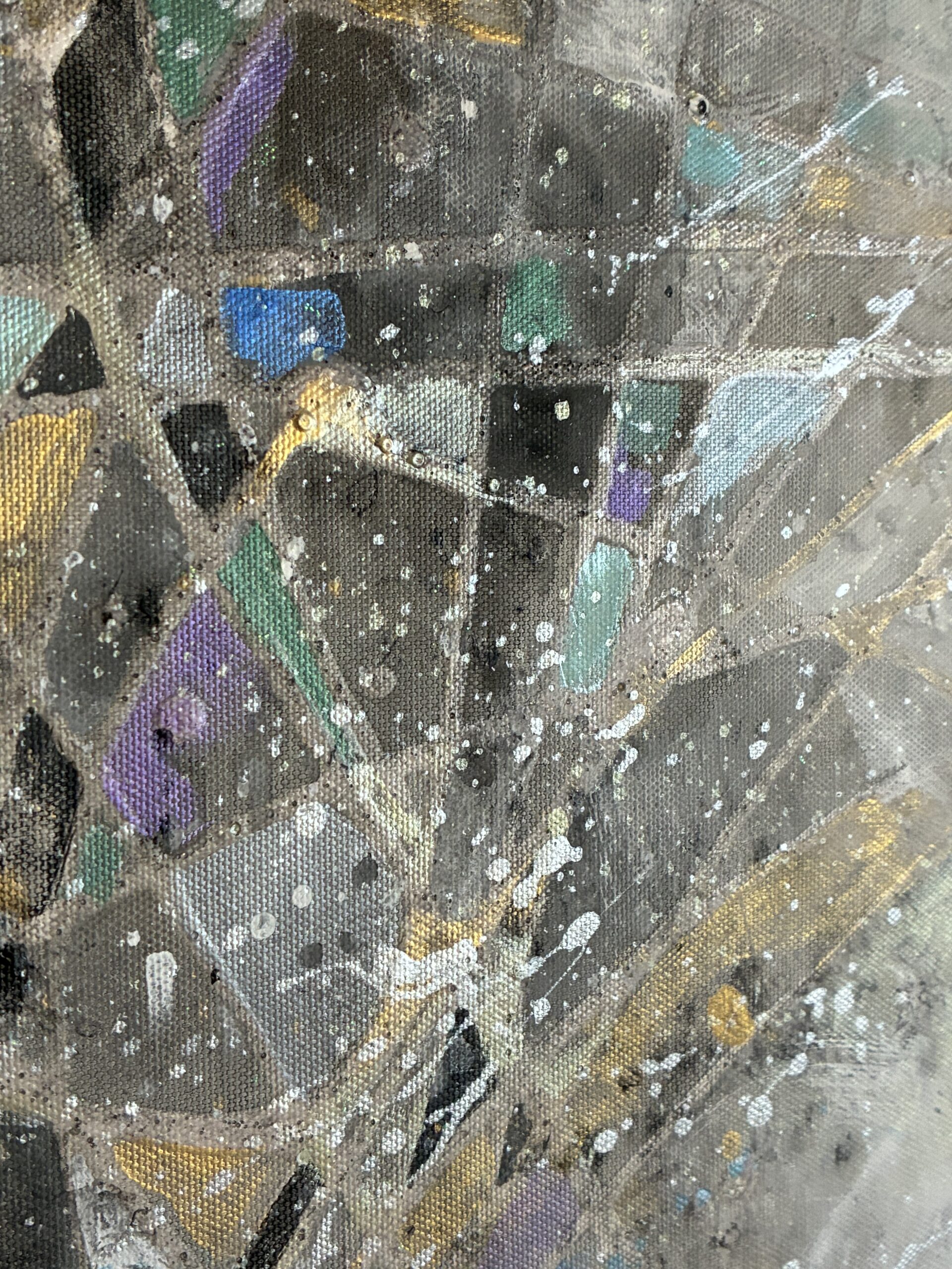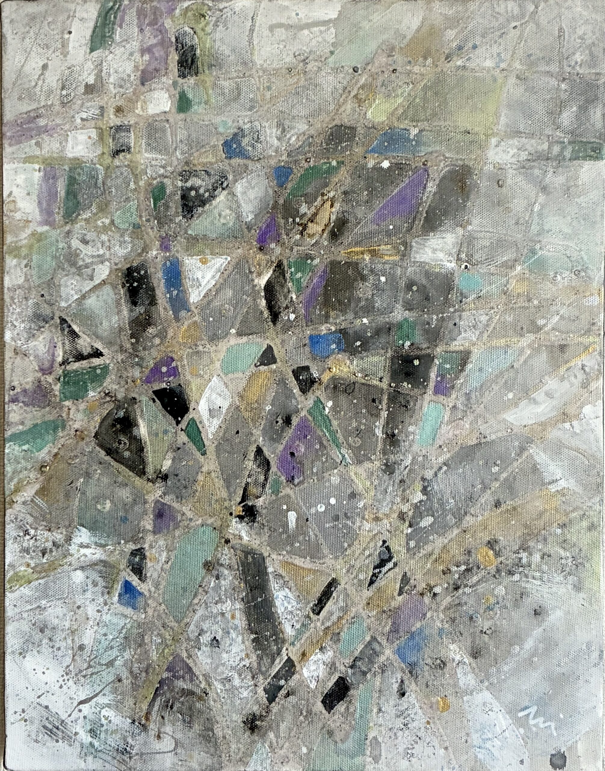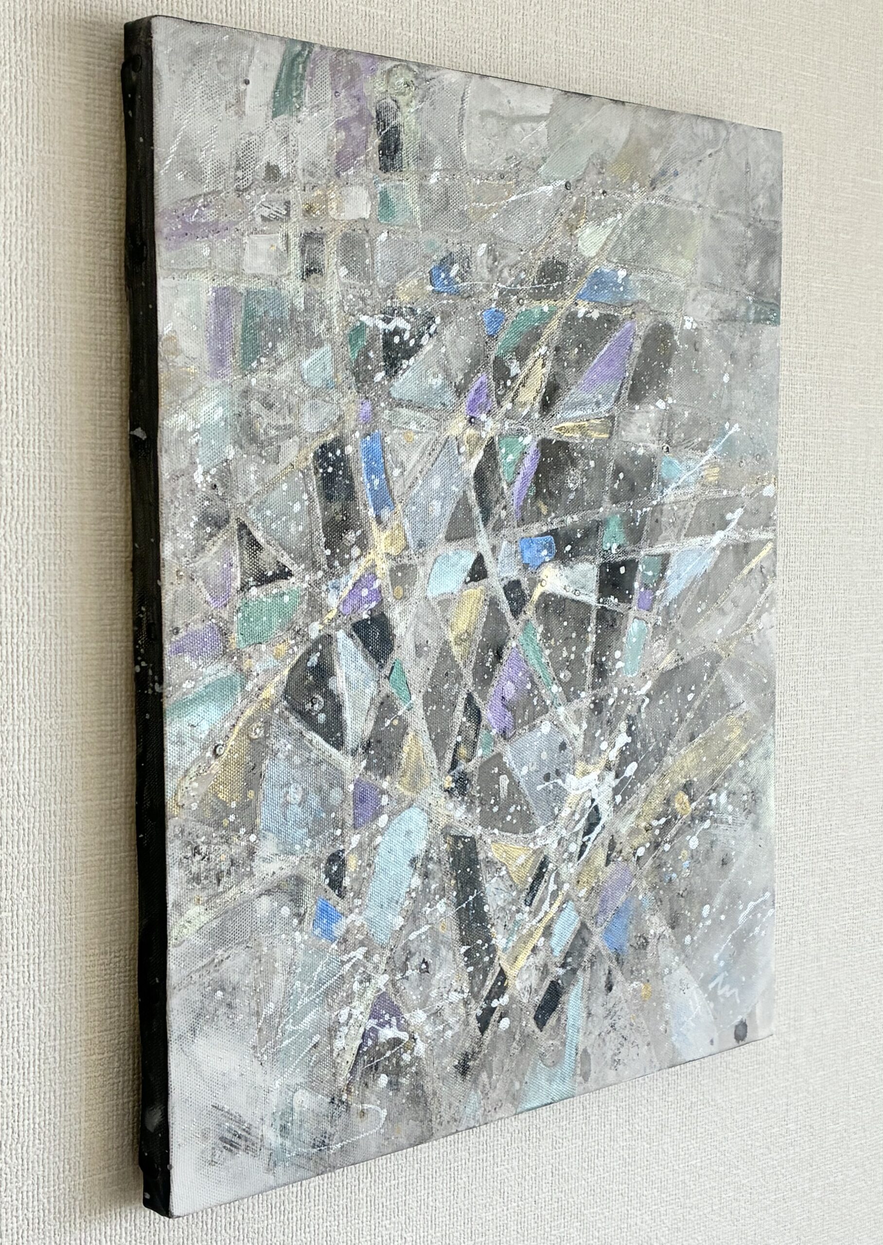 モノトーンの中、ランダムに駆け巡る線に、かすかなブルー系の色彩を散りばめた作品です。シルバーやラメがかすかに光ります。線は立体感のある質感になっています。