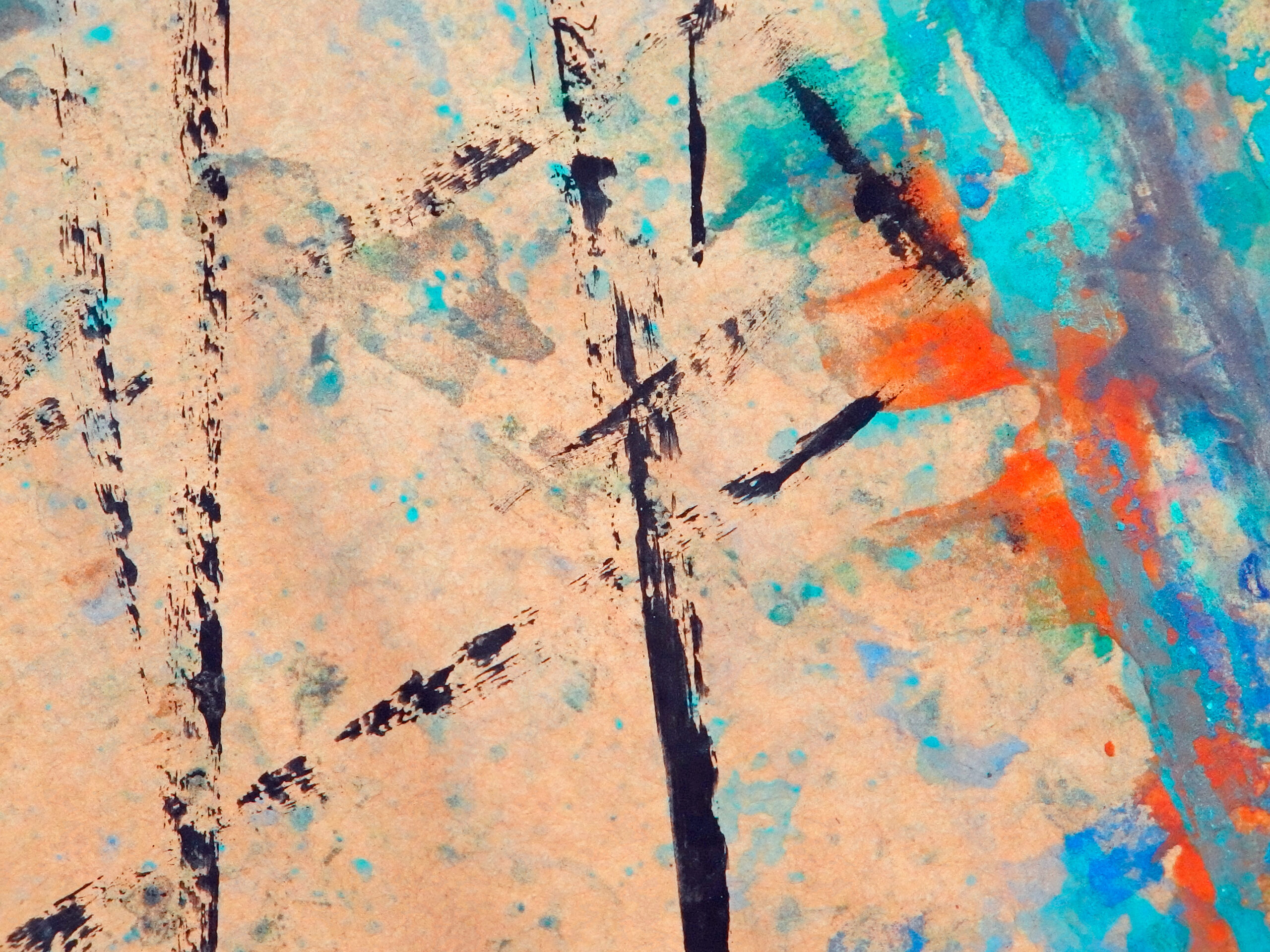 天然素材の和紙に膠を使うのが「日本画」の常識ですが、あえて人工素材を使っています。